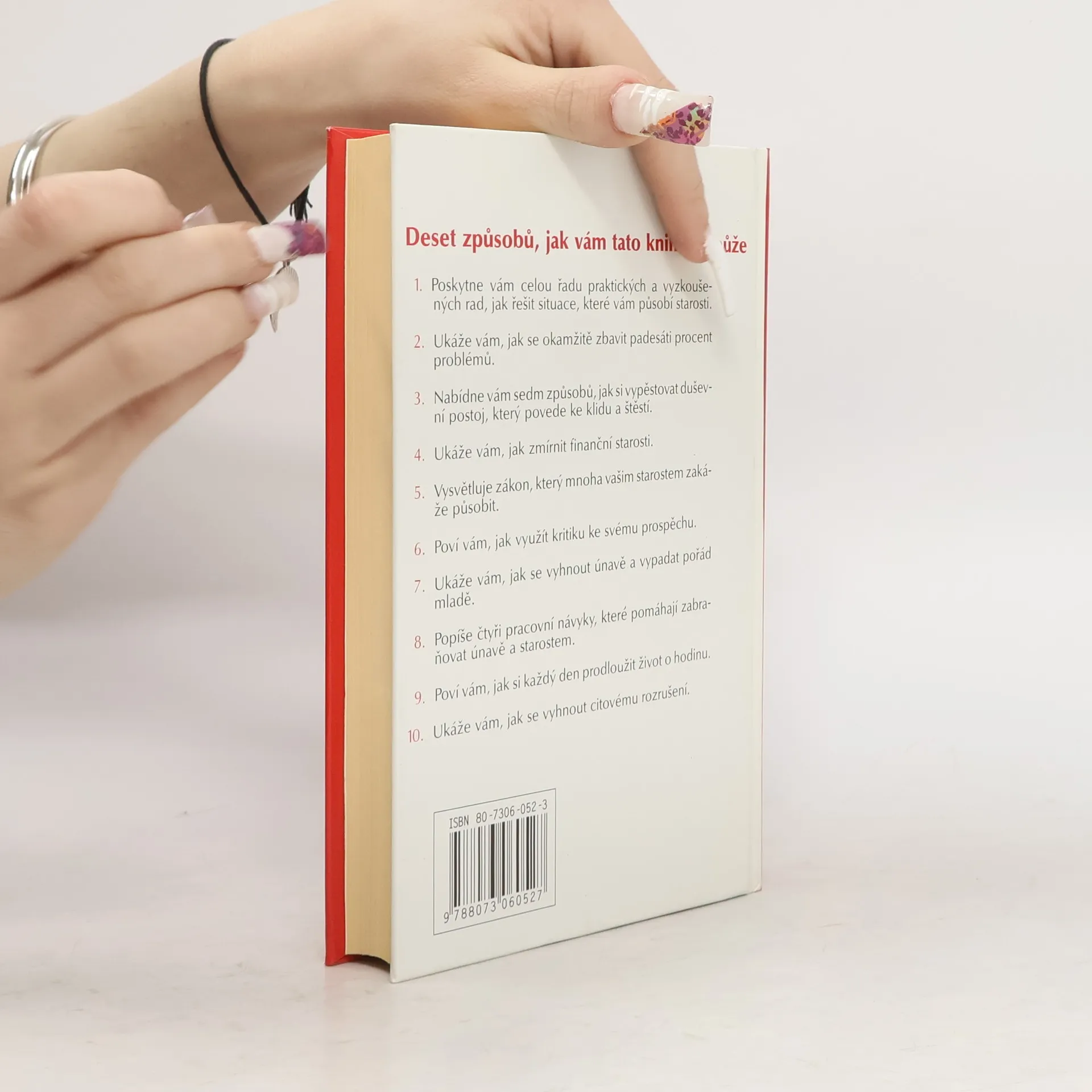 Deset způsobů, jak vám tato kniha pomůže: 1. Poskytne vám celou řadu praktických a vyzkoušených rad, jak řešit situace, které vám působí starosti. 2. Ukáže vám, jak se okamžitě zbavit padesáti procent problémů. 3. Nabídne vám sedm způsobů, jak si vypěstovat duševní postoj, který povede ke klidu a štěstí. 4. Ukáže Vám, jak zmírnit finanční starosti. 5. Vysvětluje zákon, který mnoha vašim starostem zakáže působit. 6. Poví vám, jak využít kritiku ke svému prospěchu. 7. Ukáže vám, jak se vyhnout únavě a vypadat pořád mladě. 8. Popíše čtyři pracovní návyky, které pomáhají zabraňovat únavě a starostem. 9. Poví vám, jak si každý den prodloužit život o hodinu. 10. Ukáže vám, jak se vyhnout citovému rozrušení.