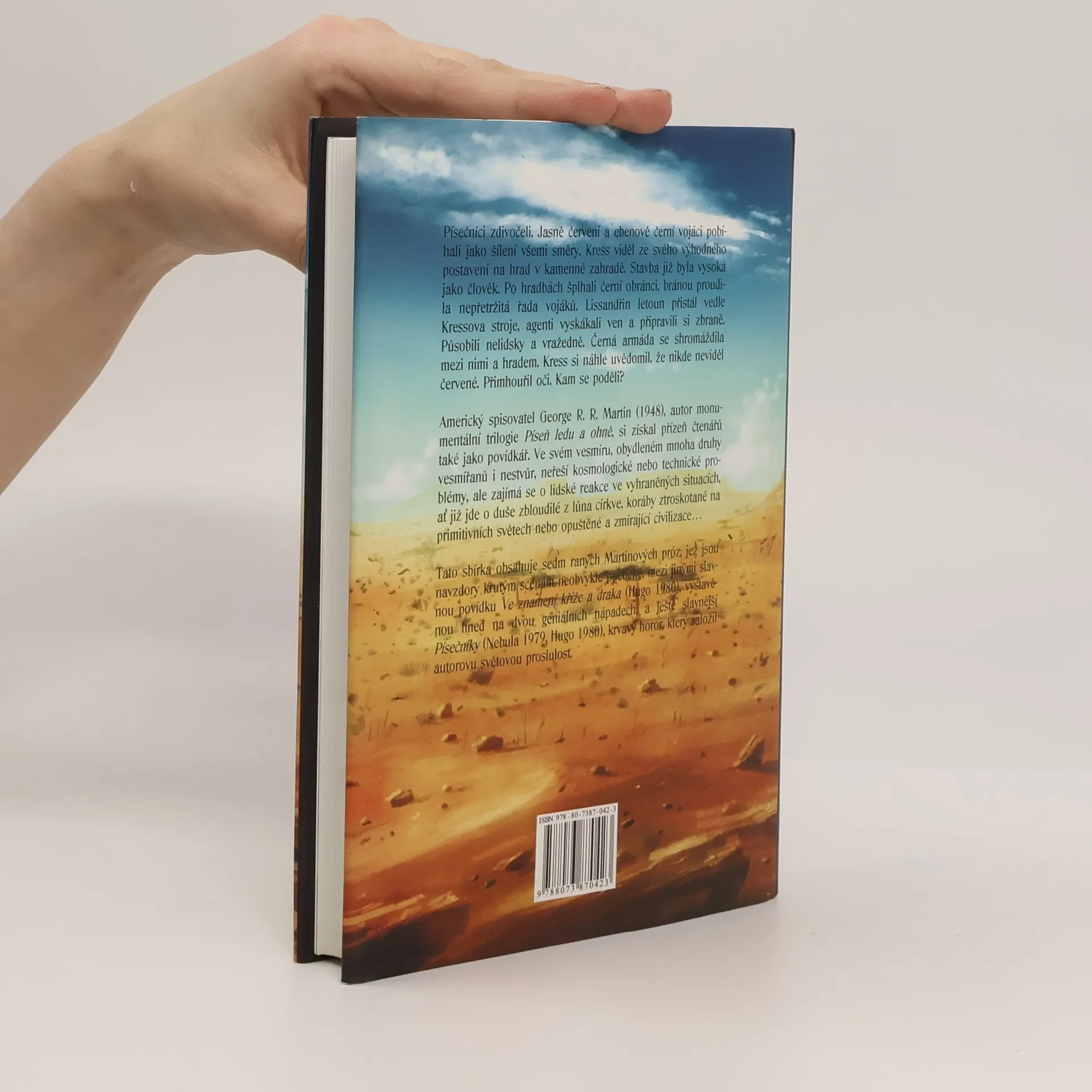 7 povídek. Písečníci zdivočeli. Jasně červení a ebenově černí vojáci pobíhali jako šílení všemi směry. Kress viděl ze svého výhodného postavení na hrad v kamenné zahradě. Stavba již byla vysoká jako člověk. Po hradbách šplhali černí obránci, bránou proudila nepřetržitá řada vojáků. Lissandřin letoun přistál vedle Kressova stroje, agenti vyskákali ven a připravili si zbraně. Působili nelidsky a vražedně. Černá armáda se shromáždila mezi nimi a hradem. Kress si náhle uvědomil, že nikde nevidí červené. Přimhouřil oči. Kam se poděli? Tato sbírka obsahuje sedm raných Martinových próz, jež jsou navzdory krutým scénám neobvykle poetické, mezi jinými slavnou povídku Ve znamení kříže a draka (Hugo 1980), vystavěnou hned na dvou geniálních nápadech, a ještě slavnější Písečníky (Nebula 1979, Hugo 1980), krvavý horor, který založil autorovu světovou proslulost.