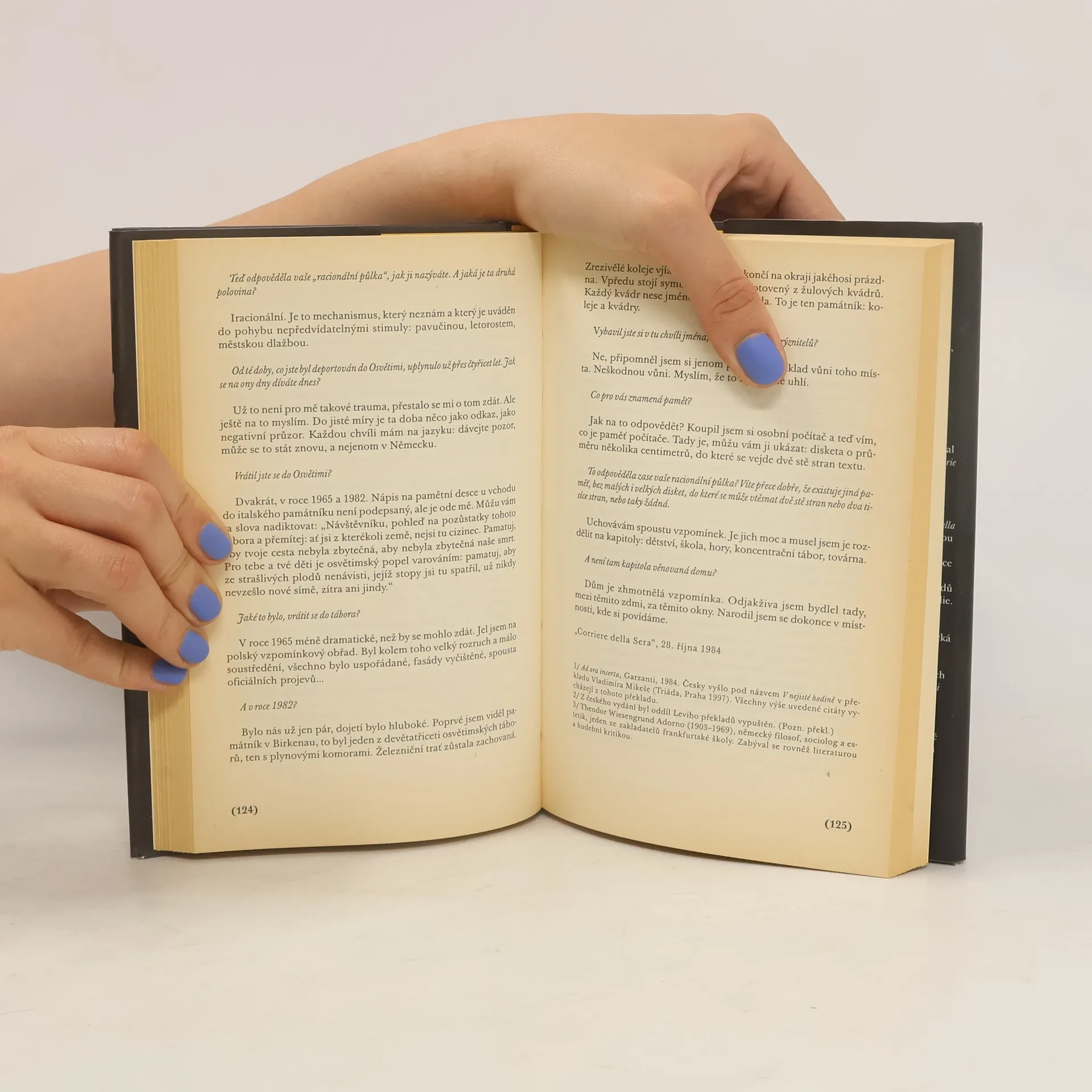 Osud připravil Primo Levimu, racionálně uvažujícímu vědci-chemikovi, v soukromí plachému a odtažitému muži, prazvláštní úděl: udělil mu dar slova, dar vypovídat o zkušenostech z Osvětimi. Postupem doby, kdy se Levi stává veřejnou osobností a jedním z nejznámějších světových židovských spisovatelů, se ho novináři začínají detailně vyptávat na jeho život a práci, na pobyt v koncentračním táboře, na vztah k judaismu a politice, ale i na mnohem subtilnější témata: problém viny a trestu, odpuštění, nenávisti, víry v Boha. Nejdůležitější rozhovory Primo Leviho, ať už poskytnuté novinám nebo rozhlasu, nyní vycházejí knižně, rozčleněné do pěti tematických oddílů. Vybral, uspořádal a poznámkami opatřil Marco Belpoliti.