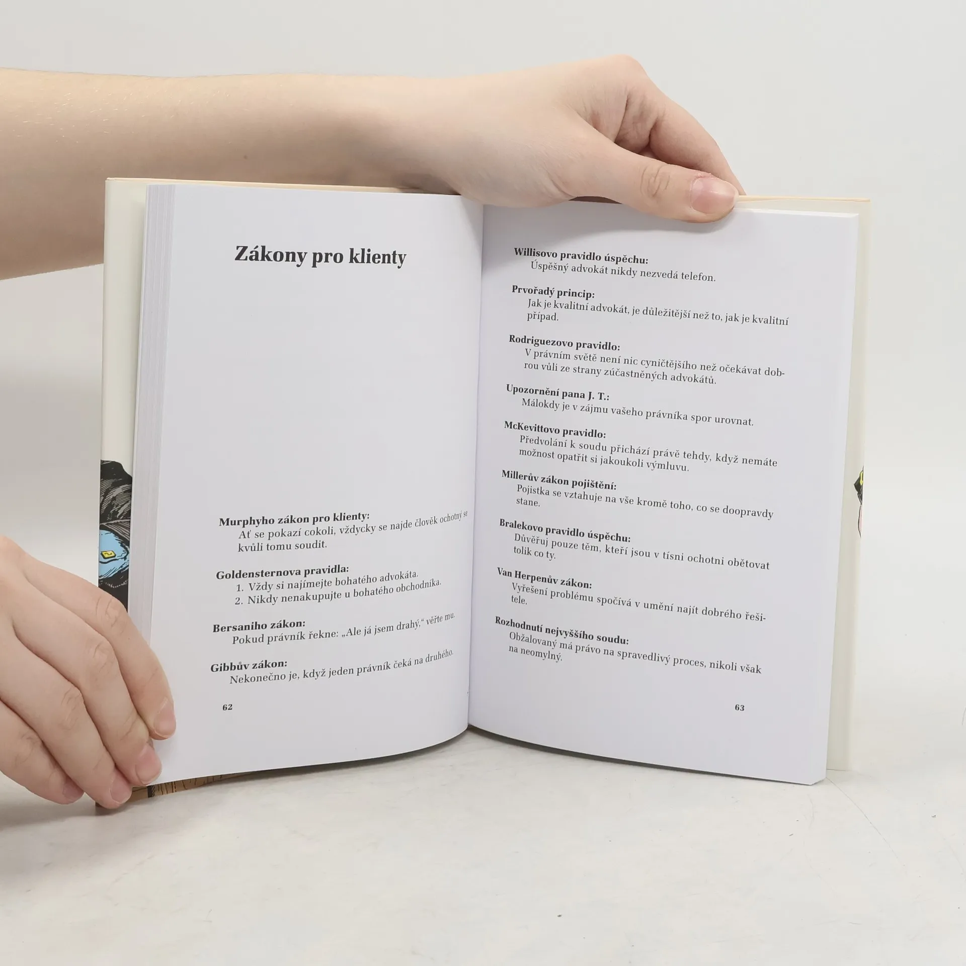 „Podobně jako u lékařů ani u právníků nejsme nijak nadšeni, když se s nimi musíme setkat, ale jsme rádi, že tu jsou, když je potřebujeme,“ píše v úvodu své další sbírky zákonů Arthur Bloch. Není divu, že se Arthur Bloch po své sbírce zákonů o lékařích pustil zrovna do profese, která je tak nepopulárně populární a jejíž vtipné komentování balancuje buď na hranici černého humoru, nebo se pohybuje na tenkém ledě, což dokazuje ještě jeden Blochův postřeh z úvodu ke své nové knize: „S anekdotami o právnících je ta potíž, že je právníci nepovažují za vtipné a ostatní lidé je zase nepovažují za anekdoty.“