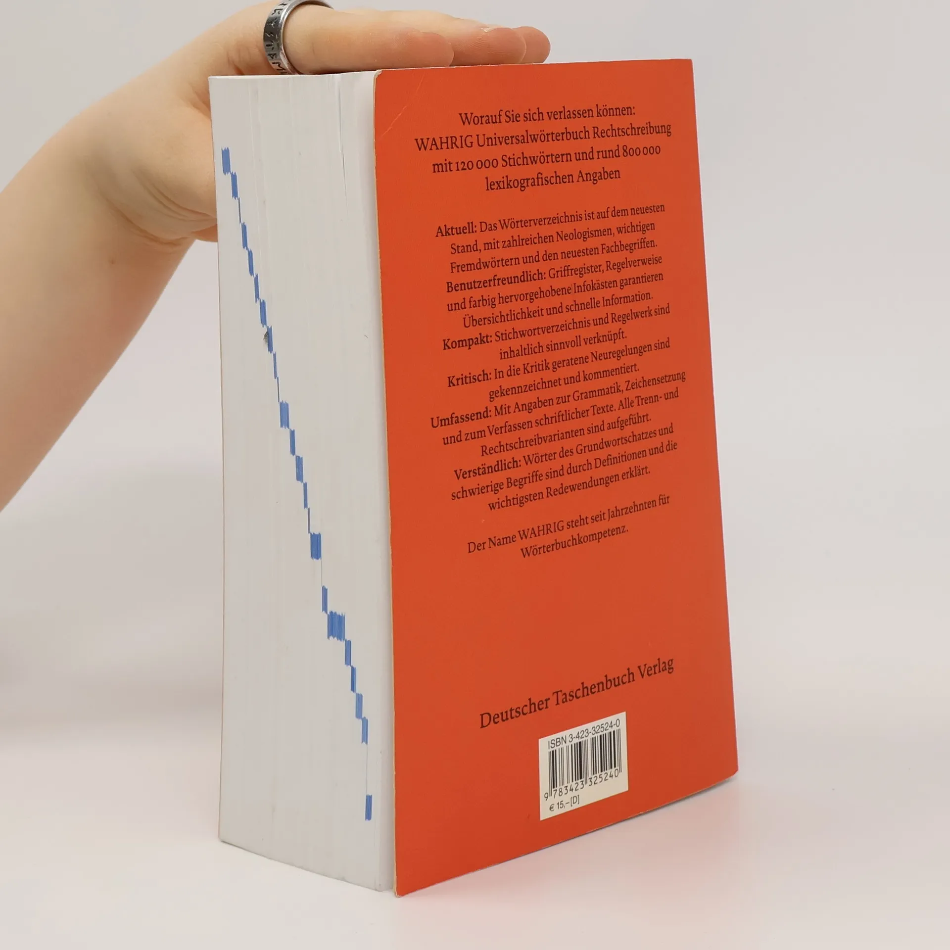 Das übersichtliche, aktuelle und handliche Standardwerk zur deutschen Rechtschreibung. Mit seinen mehr als 120.000 Einträgen ist das Wörterverzeichnis auf dem aktuellsten Stand, es umfasst Neologismen ebenso wie wichtige Fremdwörter. Alle orthographischen und Trennvarianten sind kenntlich gemacht, die Stichwörter knapp und prägnant definiert. Wendungen und Beispiele veranschaulichen den Sprachgebrauch. Der Regelteil enthält die gültigen amtlichen Regeln zur deutschen Rechtschreibung sowie ein Regelwerk mit Erläuterungen zu Zweifels- und Ausnahmefällen. Übersichtliche, farbig hervorgehobene Infokästen erklären grammatische Grundbegriffe.