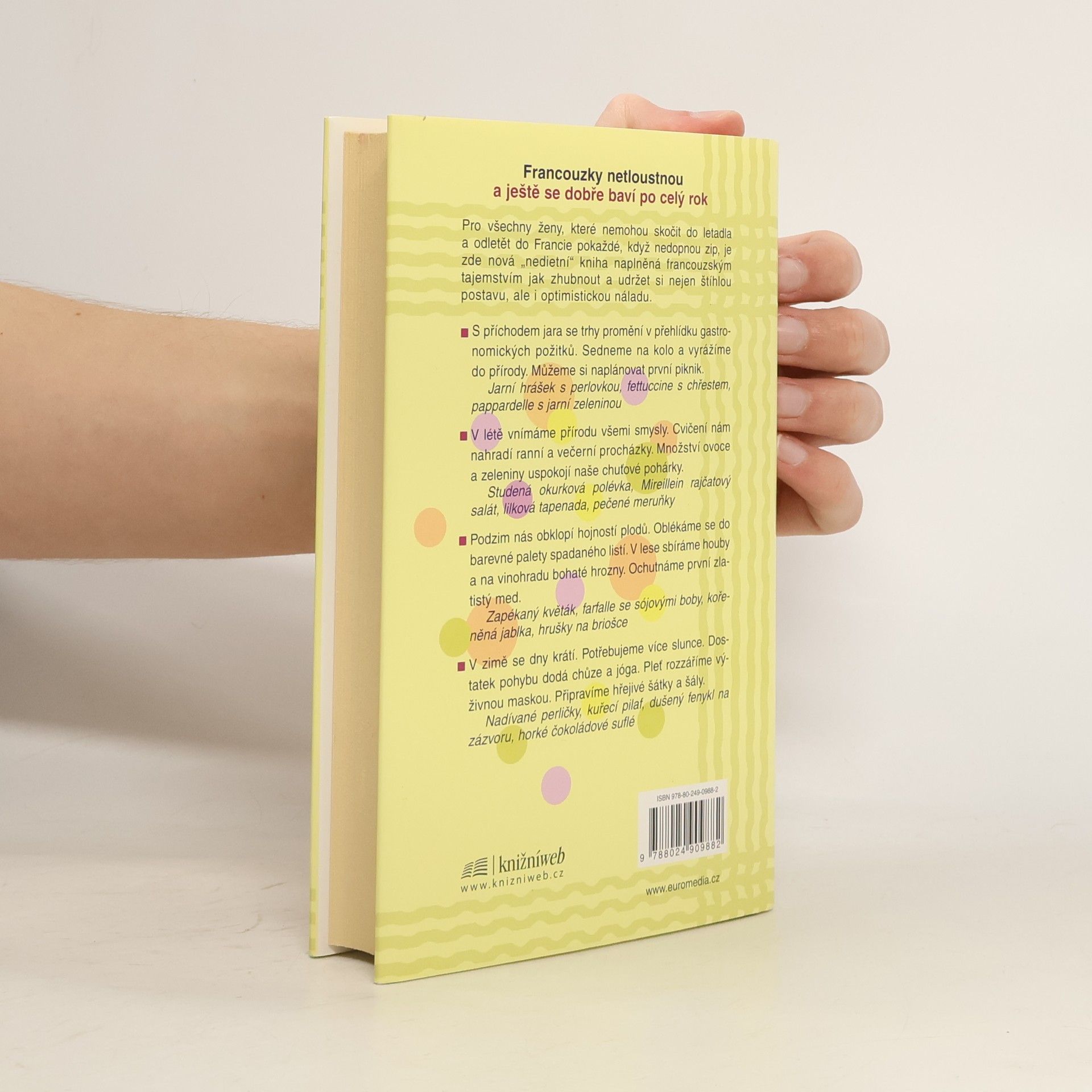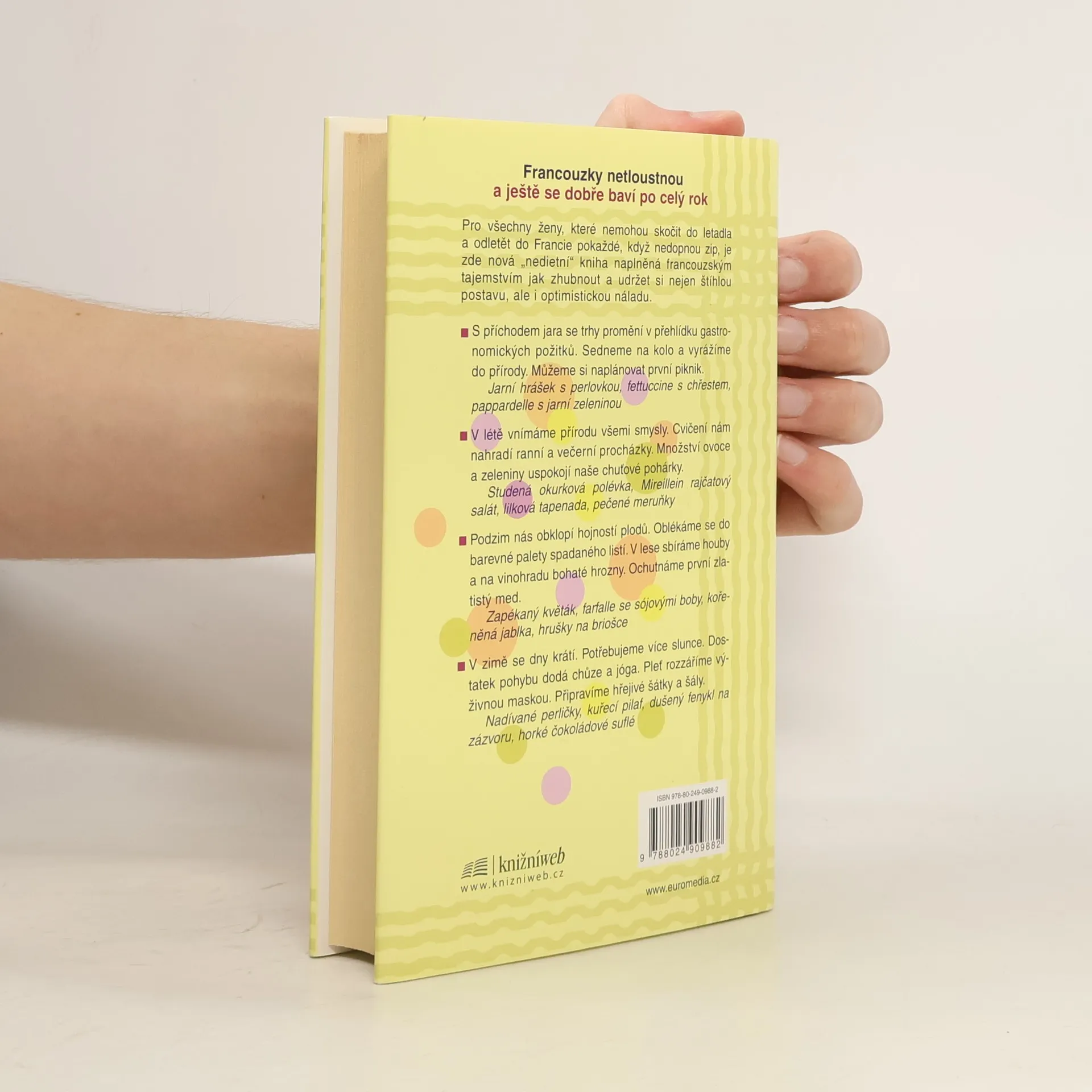 Tajemství, recepty a radůstky od jara do zimy Návody a rady ke snížení tělesné hmotnosti, k vytvoření zdravého a pohodového životního stylu podle vzoru francouzských žen. Změnit způsob myšlení a způsob stravování je nejdůležitější zásadou ke snížení váhy. Podle Francouzek je důležité vychutnat si požitek z jídla, nehladovět, jíst častěji a malé porce. Autorka provází ženy během jednoho roku, od jara od zimy, nabízí rady ke správnému stravování, ne striktní diety, které doplňuje různými tipy, recepty a jídelníčky, doporučuje a popisuje druhy vína a sýrů. Nejmocnější motivací ke snížení tělesné váhy jsou radost a spokojenost. V první knize "Francouzky netloustnou" autorka zasvětila čtenářky do základních prvků radosti ze života, zde učí ženy žít naplno.