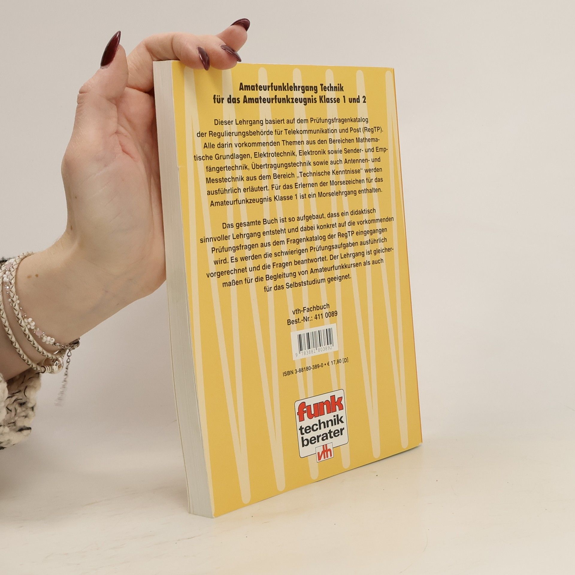 Dieser Lehrgang basiert auf dem Prüfungsfragenkatalog 2007 der Bundesnetzagentur (BNetzA). Alle darin vorkommenden Themen aus den Bereichen Mathematische Grundlagen, Elektrotechnik, Elektronik sowie Sender- und Empfängertechnik, Übertragungstechnik, Antennentechnik und Messtechnik aus dem Bereich "Technische Kenntnisse" werden ausführlich erläutert. Es werden die Kenntnisse aus dem Amateurfunklehrgang für das Amateurfunkzeugnis Klasse E vorausgesetzt. Als zusätzliche Unterlage wird der aktuelle Fragenkatalog der Bundesnetzagentur (BNetzA) benötigt. Das Buch ist so aufgebaut, dass ein didaktisch sinnvoller Lehrgang entsteht und dabei konkret auf die vorkommenden Prüfungsfragen aus dem Fragenkatalog der BNetzA eingengangen wird. Es werden die schwierigen Prüfungsaufgaben beantwortet. Der Lehrgang ist gleichermaßen für die Begleitung von Amateurfunkkursen als auch für das Selbststudium geeignet.