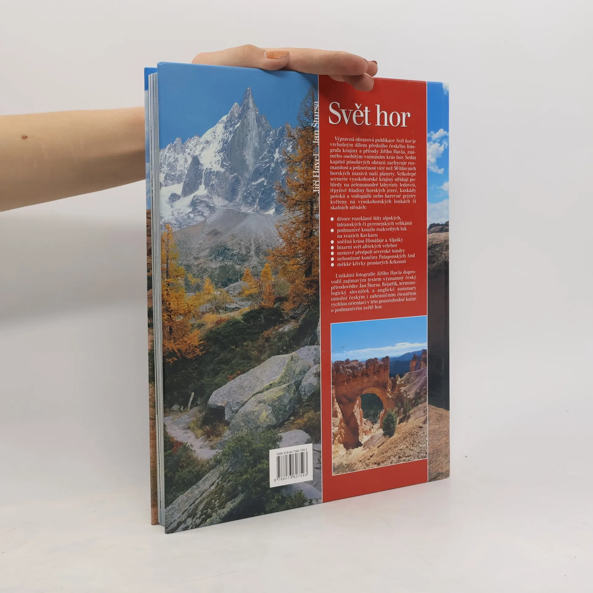 Výpravná obrazová publikace Svět hor je vrcholným dílem předního českého fotografa krajiny a přírody Jiřího Havla, známého osobitým vnímáním krás hor. Sedm kapitol působivých obrazů zachycuje rozmanitost a jedinečnost více než 50 hlavních horských masivů naší planety. Unikátní fotografie Jiřího Havla doprovodil zajímavým textem významný český přírodovědec Jan Štursa.