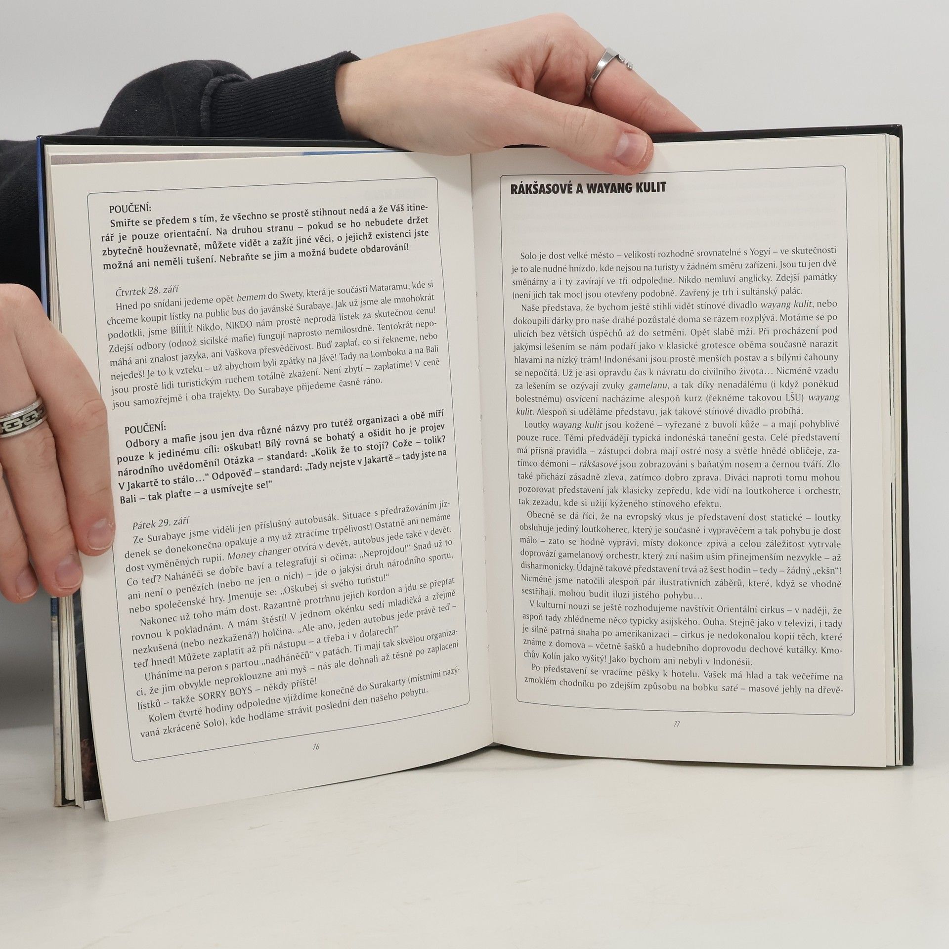 Putování po indonéských ostrovech je popisováno pohledem zkušených cestovatelů a se smyslem pro humor. Zajímavý a přehledný cestopis. Autoři se snaží objevit všechny krásy této části světa a neodrazují je žádné potíže, které přecházejí s humorem a nadhledem. Všechny překážky, které mohou nezkušeného cestovatele potkat, shrnuje autorka do pregnantních poučení, které zakončují každou kapitolu a jsou pro budoucího cestovatele jistě velmi přínosné. Kniha obsahuje i velmi kvalitní a zajímavé fotografie.