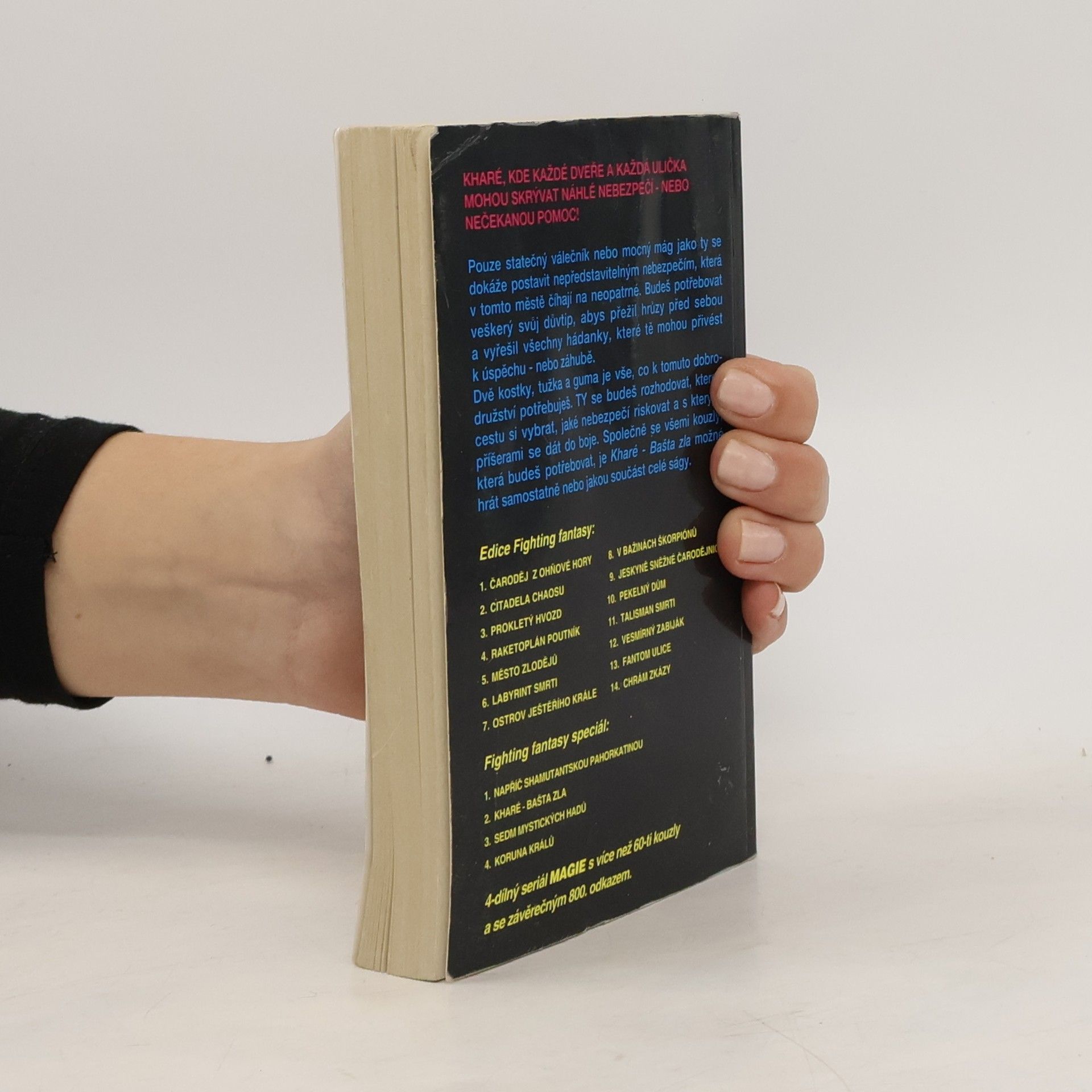 Pouze statečný válečník nebo mocný mág jako ty se dokáže postavit nepředstavitelným nebezpečím, která v tomto městě číhají na neopatrné. Budeš potřebovat veškerý svůj důvtip, abys přežil hrůzy před sebou a vyřešil všechny hádanky, které tě mohou přivést k úspěchu – nebo záhubě. Dvě kostky, tužka a guma je vše, co k tomuto dobrodružství potřebuješ. Ty sám budeš rozhodovat, kterou cestu si vybrat, jaké nebezpečí riskovat a s kterými příšerami se dát do boje. Společně se všemi kouzly, která budeš potřebovat, je možné Kharé – bašta zla hrát jako samostatné dobrodružství nebo jako součást celé ságy. Vydalo nakladatelství Perseus.