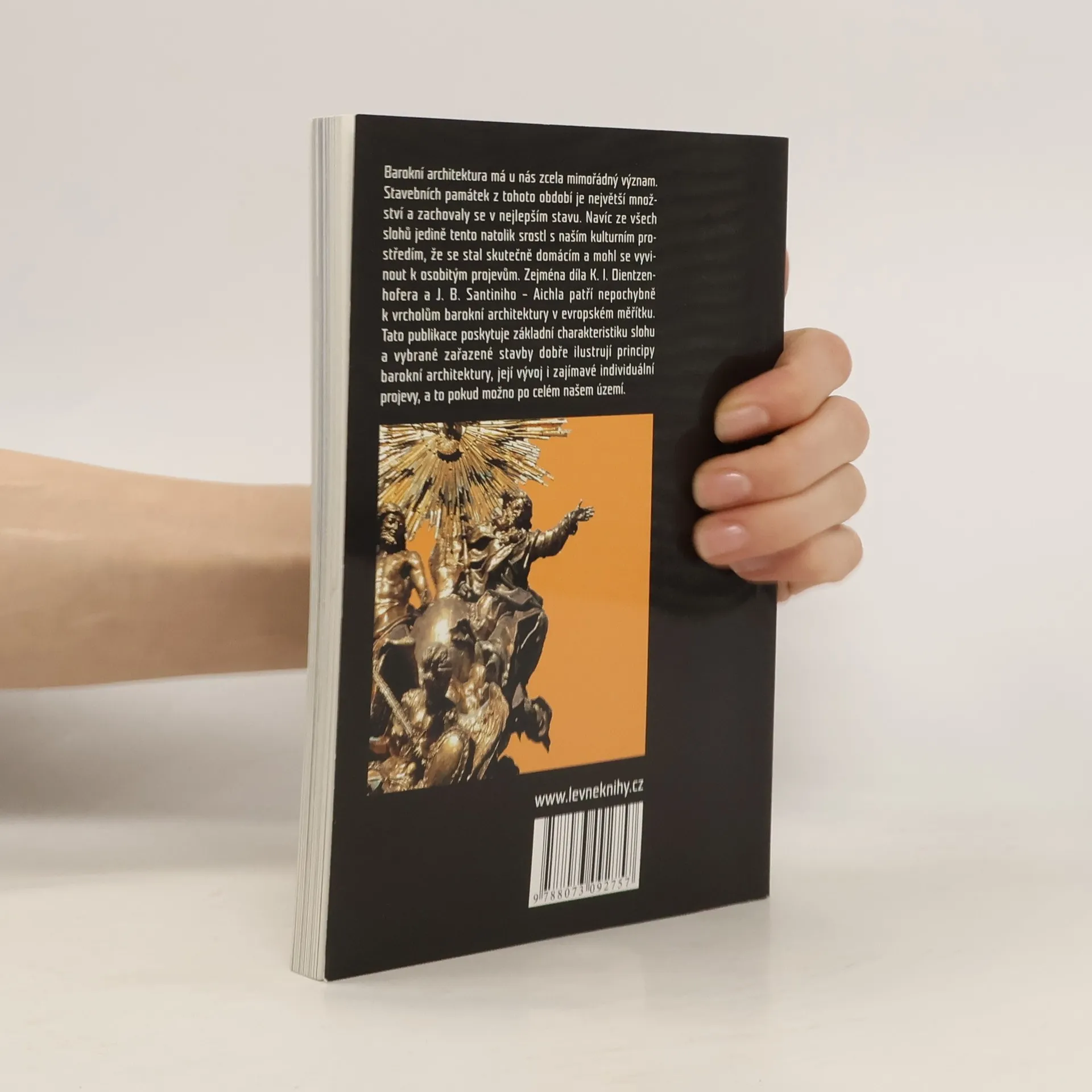 Barokní architektura má u nás zcela mimořádný význam. Stavebních památek z tohoto období je největší množství a zachovaly se v nejlepším stavu. Navíc ze všech slohů jedině tento natolik srostl s naším kulturním prostředím, že se stal skutečně domácím a mohl se vyvinout k osobitým projevům. Tato publikace poskytuje základní charakteristiku slohu a vybrané zařazené stavby dobře ilustrují principy barokní architektury, její vývoj i zajímavé individuální projevy, a to pokud možno po celém našem území.