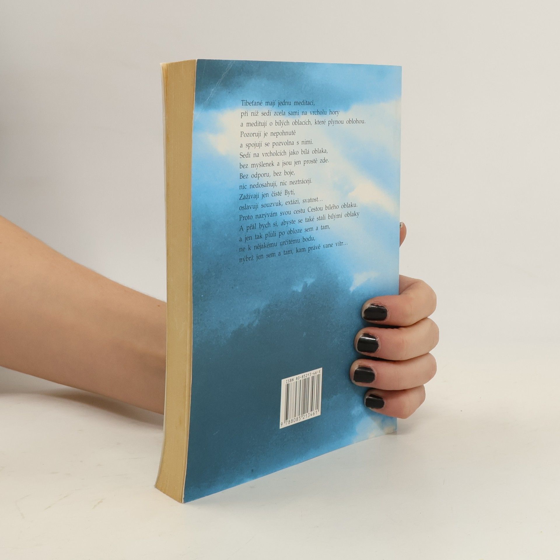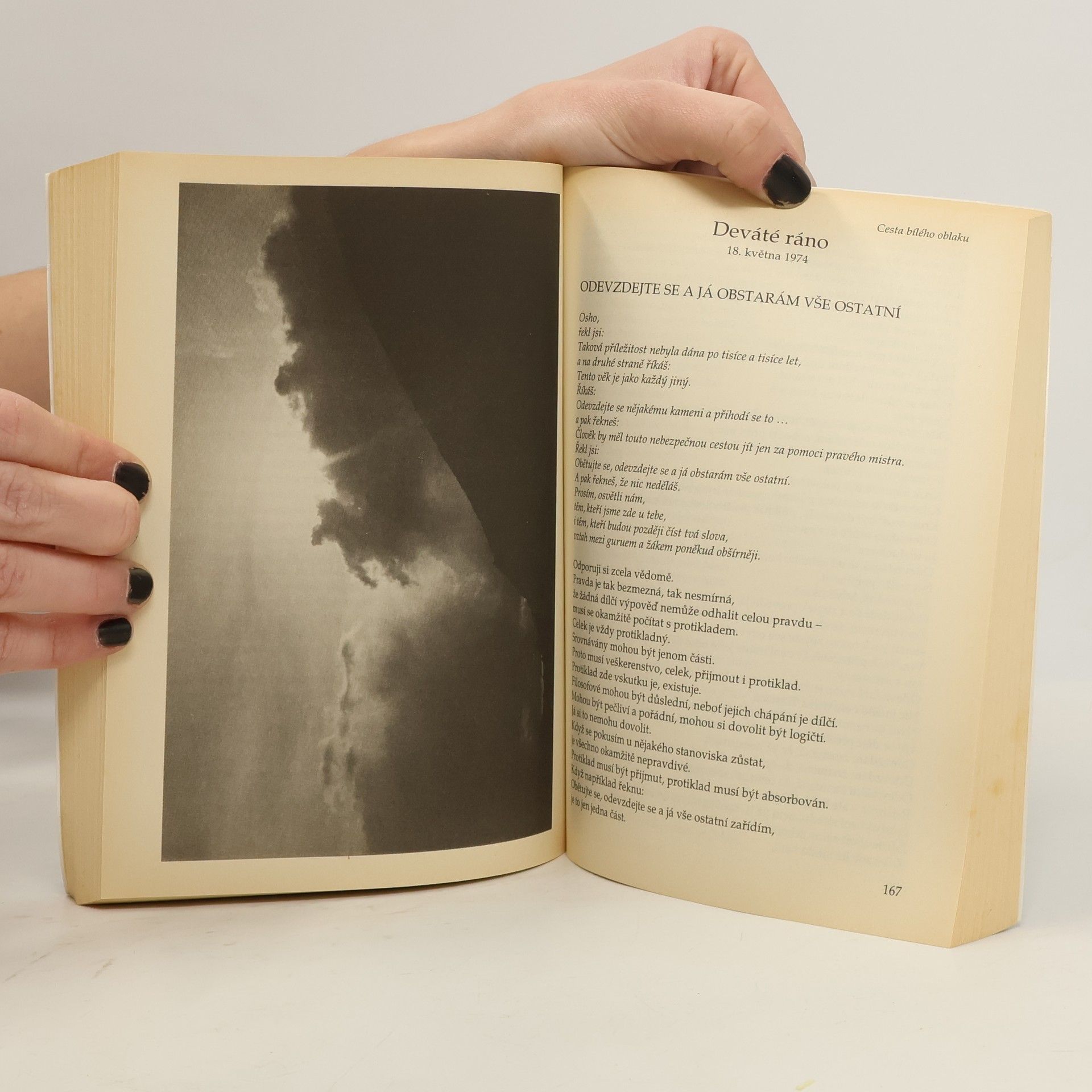 Tibeťané mají jednu meditaci, při níž sedí zcela sami na vrcholu hory a meditují o bílých oblacích, které plynou oblohou. Pozorují je nepohnutě a spojují se pozvolna s nimi. Sedí na vrcholcích jako bílá oblaka bez myšlenek a jsou jen prostě zde. Bez odporu, bez boje nic nedosahují, nic neztrácejí. Zažívají jen čisté Bytí, oslavují souzvuk, extázi, svatost ... Proto nazývám svou cestu Cestou bílého oblaku. A přál bych si, abyste se také stali bílými oblaky a jen tak pluli po obloze sem a tam, ne k nějakému určitému bodu, nýbrž jen sem a tam, kam právě vane vítr...... celý text