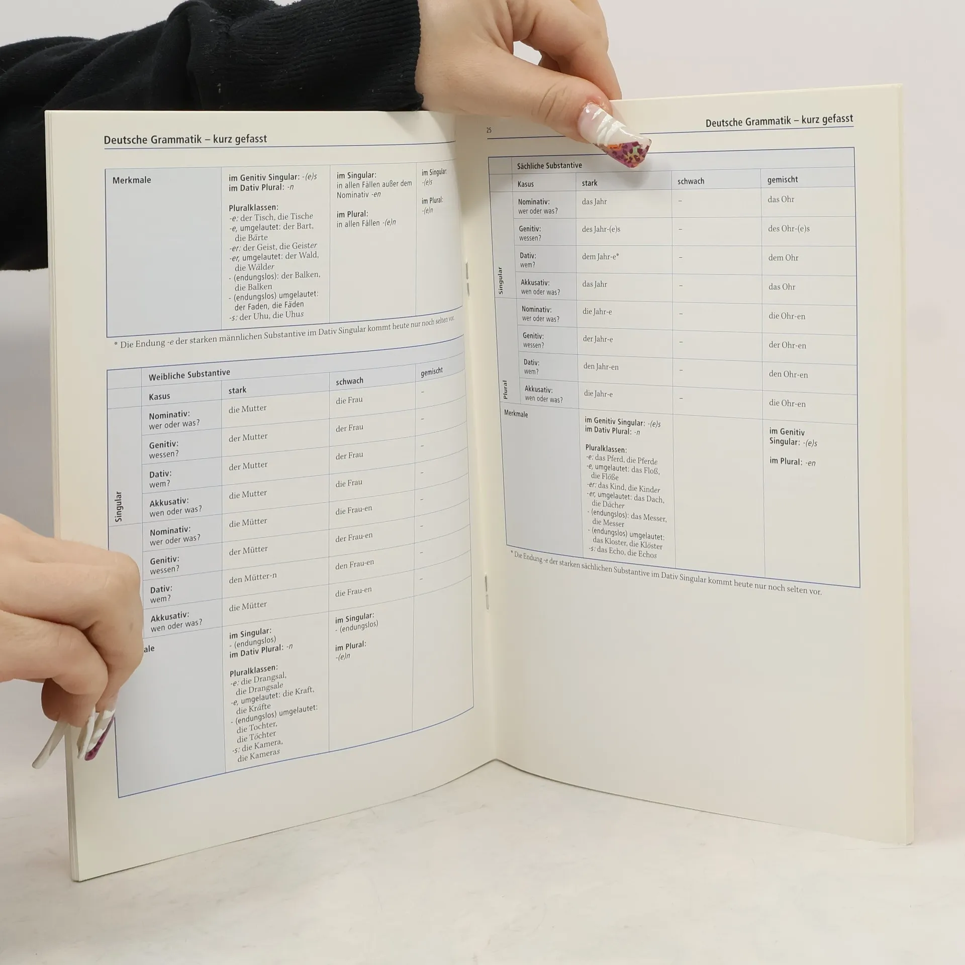 Deutsche Grammatik in Kürze: In dieser kleinen Broschüre ist die Deutsche Grammatik kurz gefasst enthalten. Sie vermittelt Erklärungen, Regeln und Anwendungsbeispiele, zumeist in tabellarischer Form zu den Wortarten, Verbformen, den sechs Zeitformen, den Konjugationen, Deklinationsarten, den Pronomen, dem Adjektiv, Adverb, der Präposition und dem Aufbau eines Satzes etc., kurz zu den wesentlichen Strukturelementen der Deutschen Sprache. Übersichtlich und leicht verständlich gegliedert, ist das Büchlein zum Auffrischen, sowie Wiederholen vorhandener Grundkenntnisse der Deutschen Sprache gedacht. Nur schade, dass kein Wortregister vorhanden ist, welches das schnelle Nachschlagen erleichtern würde. Ab 10 Jahren, gut, Beatrice Balint.
