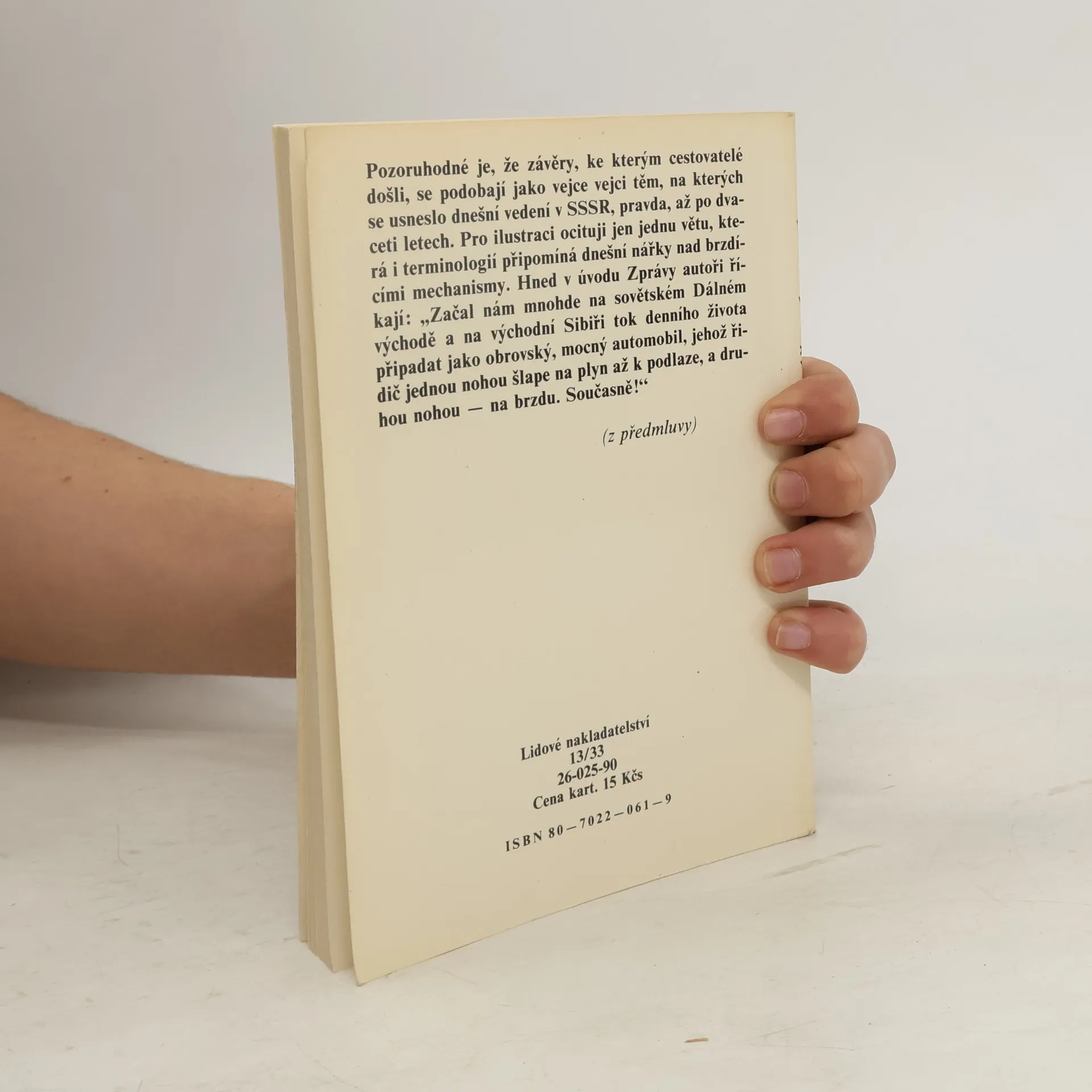 Sociálně kritická studie o hospodářském a sociálním stavu na území mezi Uralem a Dálným východem, vypracovaná v r. 1964. Pozoruhodné je, že závěry, ke kterým cestovatelé došli, se podobají jako vejce vejci těm, na kterých se usneslo dnešní vedení v SSSR (předmluva pochází z dřívějších let). Pravda, až po dvaceti letech. Pro ilustraci ocituji jen jednu větu, která i terminologií připomíná dnešní nářky nad brzdícími mechanismy. Hned v úvodu Zprávy autoři říkají: „Začal nám mnohde na sovětském Dálném východě a na východní Sibiři tok denního života připadat jako obrovský, mocný automobil, jehož řidič jednou nohou šlape na plyn až k podlaze a druhou nohou – na brzdu. Současně!“ (z předmluvy)