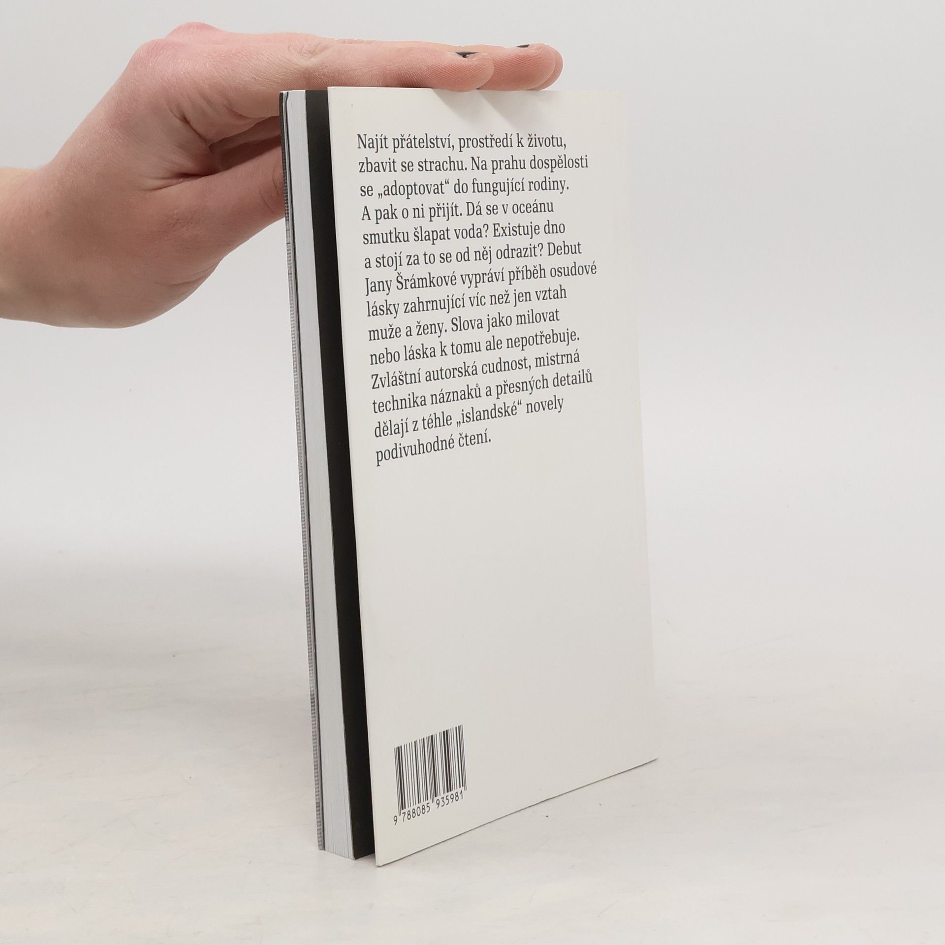 Najít přátelství, prostředí k životu, zbavit se strachu a na prahu dospělosti se „adoptovat“ do fungující rodiny. Dá se v oceánu smutku šlapat voda? Existuje dno a stojí za to se od něj odrazit? Debut Jany Šrámkové vypráví příběh osudové lásky zahrnující víc než jen vztah muže a ženy. Slova jako milovat nebo láska k tomu ale nepotřebuje. Zvláštní autorská cudnost, mistrná technika náznaků a přesných detailů dělají z téhle „islandské“ novely podivuhodné čtení. Kniha získala Cenu Jiřího Ortena 2009.