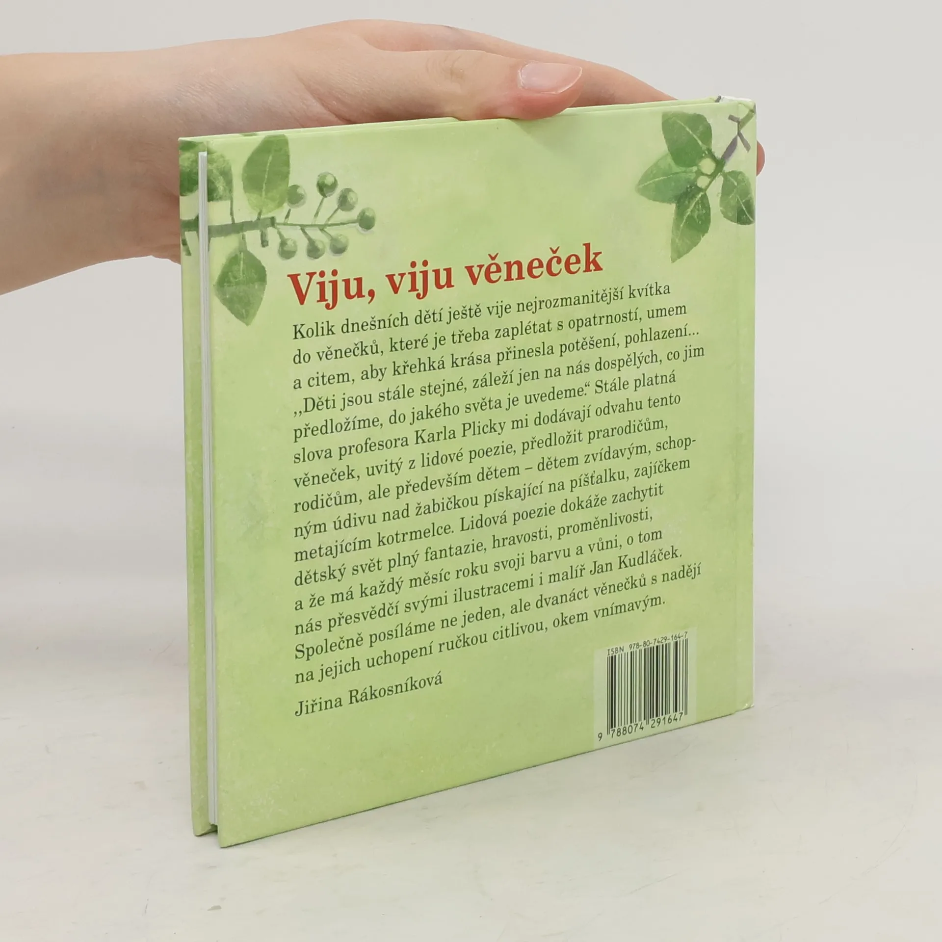 Dětská knížka Viju, viju věneček od oblíbených autorů Jiřiny Rákosníkové a Jana Kudláčka. Pletla v kytku rozmarýnu,devatero divný květ, házela je po voděnce, aby plula v širý svět…ano, tak jako se házely věnečky zaplétané z nejrozmanitějších kvítků po vodě s nadějí, že přinesou pozdravení, potěšení milované osobě, tak i já posílám po pomyslné čisté voděnce věneček těch nejprostších veršů, říkadel, které vytryskly doslova z touhy vyjádřit momentální náladu, pocit. Doba i společnost se přirozeně mění, ale jsem přesvědčena, že ona potřeba čistoty a krásy, krásy prosté, zbavené všech pozlátek přetrvává.Kéž by tento věneček, upletený z obdivu a úcty k odkazu našich předků, našel své adresáty, kteří jej nejen z onoho pomyslného proudu vyloví, ale též rozeznají krásu i vůni vpletených kvítků lidové poezie.