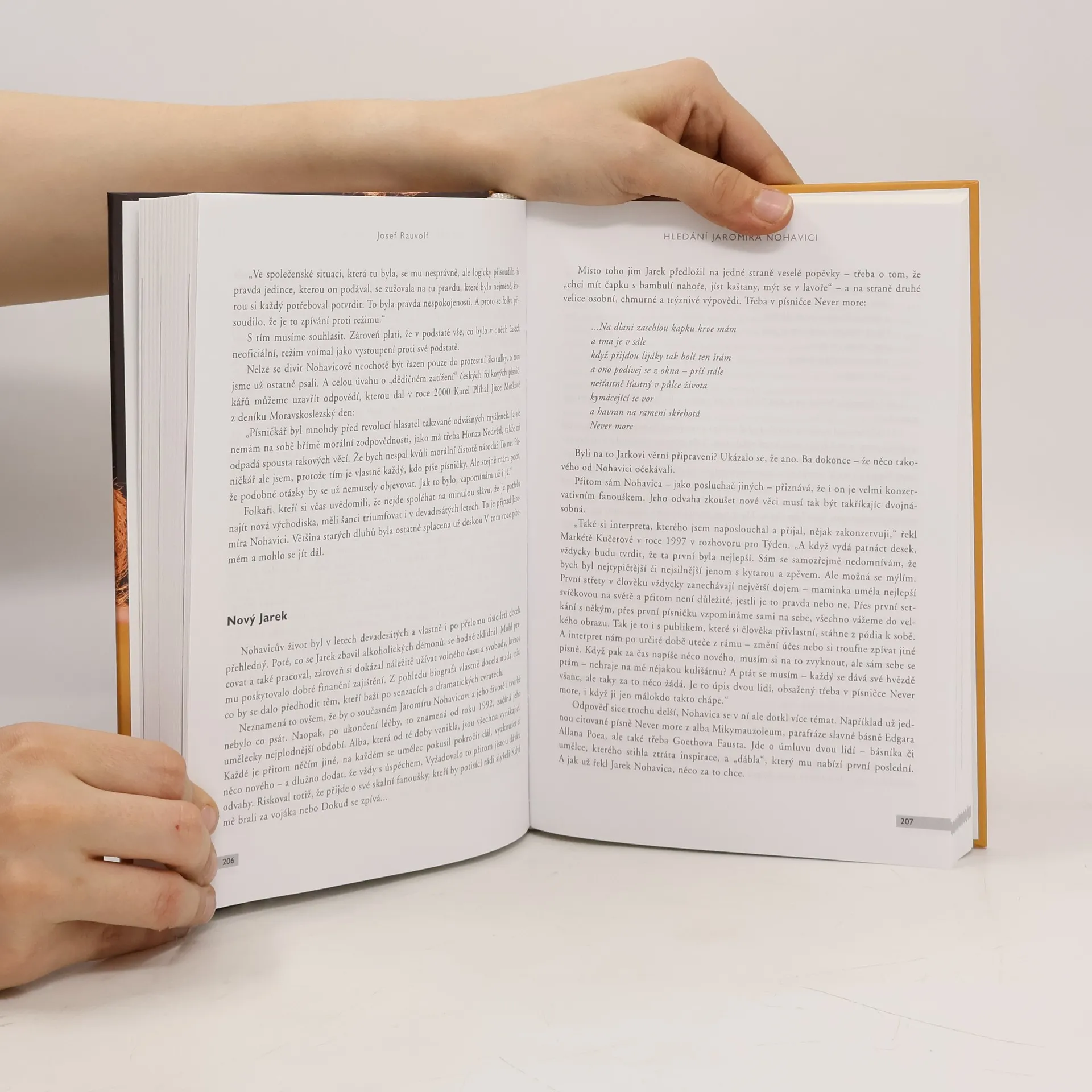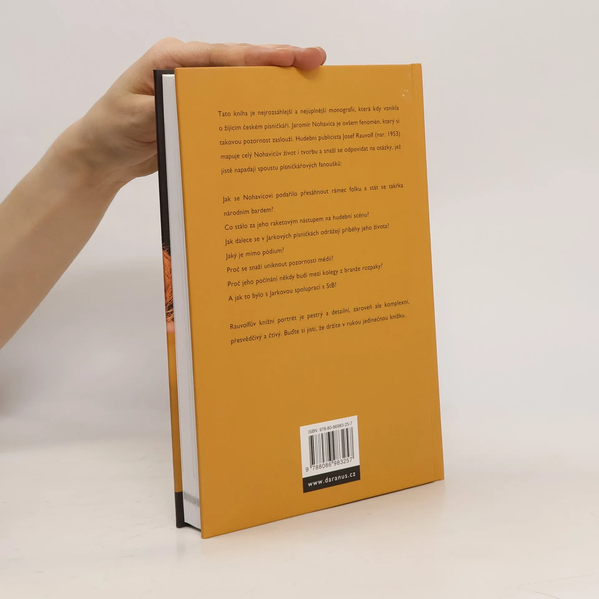 Přestože je Jaromír Nohavica naší nejvýraznější písničkářskou osobností, která v mnohém přesahuje rámec folkové hudby, dosud o něm nevyšla žádná monografie. Rozsáhlá publikace z pera hudebního publicisty Josefa Rauvolfa je tedy svým způsobem unikátní. Autor se na základě mnoha pramenů, ale také přímých svědectví pokouší rozklíčovat fenomén Nohavica. Dává jeho tvorbu do kontextu s písničkářovým životaběhem i s dobovými událostmi. Rauvolfův knižní portrét je pestrý a detailní, zároveň ale komplexní, přesvědčivý a veskrze objektivní. A to i díky tomu, že svými svědectvími přispěly takové osobnosti folkové scény, jako např. Pavel Žalman Lohonka, Wabi Daněk či Pavlína Jíšová.