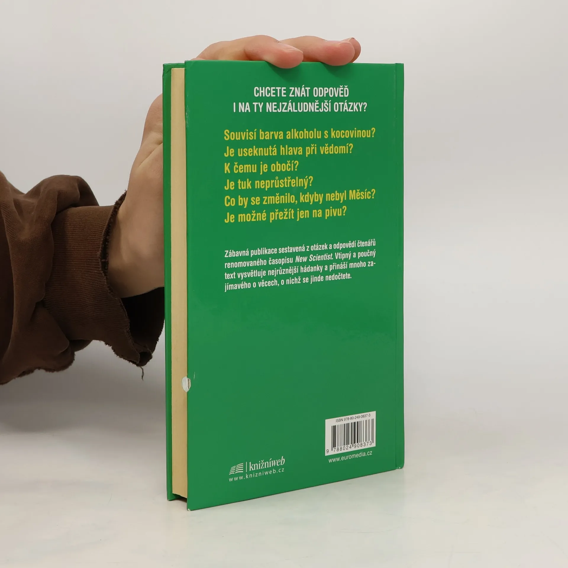 Chcete znát odpověď i na ty nejzáludnější otázky? Souvisí barva alkoholu s kocovinou? Je useknutá hlava při vědomí? K čemu je obočí? Je tuk neprůstřelný? Co by se změnilo, kdyby nebyl Měsíc? Je možné přežít jen na pivu? Zábavná publikace sestavená z otázek a odpovědí čtenářů renomovaného časopisu New Scientist. Vtipný a poučný text vysvětluje nejrůznější hádanky a přináší mnoho zajímavého o věcech, o nichž se jinde nedočtete.