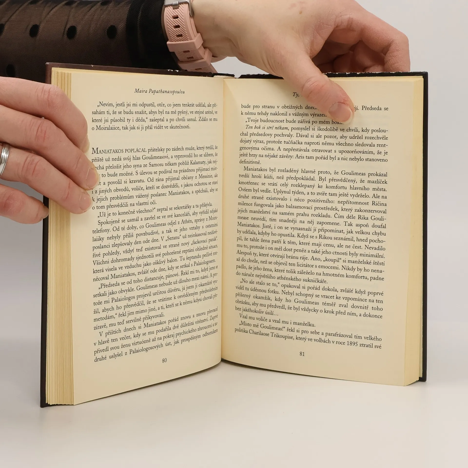 Již třetí román současné řecké autorky (česky Jidáš líbal skvěle, 2003, Toxická spojení mužského rodu, 2004) nás tentokrát přenáší mezi fiktivní problémy a postavy řecké politiky, které však k realitě nemají příliš daleko. Ocitáme se v Athénách v době před volbami, kdy proti sobě stojí dvě politické strany, jedna vládní a druhá opoziční. Příběh se odehrává mezi opozičními politiky, a to v několika rovinách, které se postupně prolínají a někde až neuvěřitelně spojují.