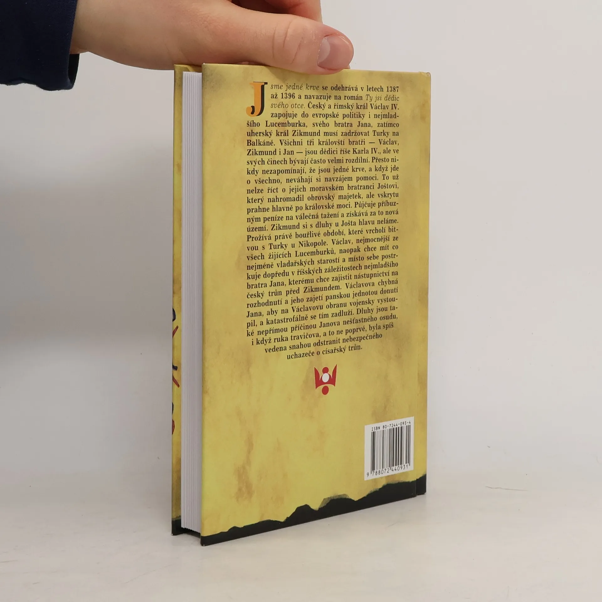 Jsme jedné krve navazuje na román Ty jsi dědic svého otce. Český a římský král Václav IV. zapojuje do evropské politiky i nejmladšího Lucemburka, svého bratra Jana Zhořeleckého, zatímco uherský král Zikmund musí zadržovat Turky na Balkáně. Všichni tři královští bratři -- Václav, Zikmund i Jan -- jsou dědici říše Karla IV., ale ve svých činech bývají často velmi rozdílní. Přesto nikdy nezapomínají, že jsou jedné krve, a když jde o všechno, neváhají si navzájem pomoci. To už nelze říct o jejich moravském bratranci Joštovi, který nahromadil obrovský majetek, ale vskrytu prahne po královské moci. Půjčuje příbuzným peníze na válečná tažení a získává za to nová území. Zikmund si s dluhy u Jošta hlavu neláme. Prožívá právě bouřlivé období, které vrcholí bitvou s Turky u Nikopole. Václav, nejmocnější ze všech žijících Lucemburků, chce mít co nejméně vladařských starostí a místo sebe postrkuje dopředu v říšských záležitostech bratra Jana, kterého měl velmi rád a chtěl mu zajistit nástupnictví na český trůn před Zikmundem. Václavova chybná rozhodnutí a jeho zajetí panskou jednotou donutí Jana, aby na Václavovu obranu vojensky vystoupil, a katastrofálně se tím zadluží. Dluhy jsou také nepřímou příčinou Janova nešťastného osudu, i když ruka travičova, a to ne poprvé, byla spíš vedena snahou odstranit nebezpečného uchazeče o císařský trůn.