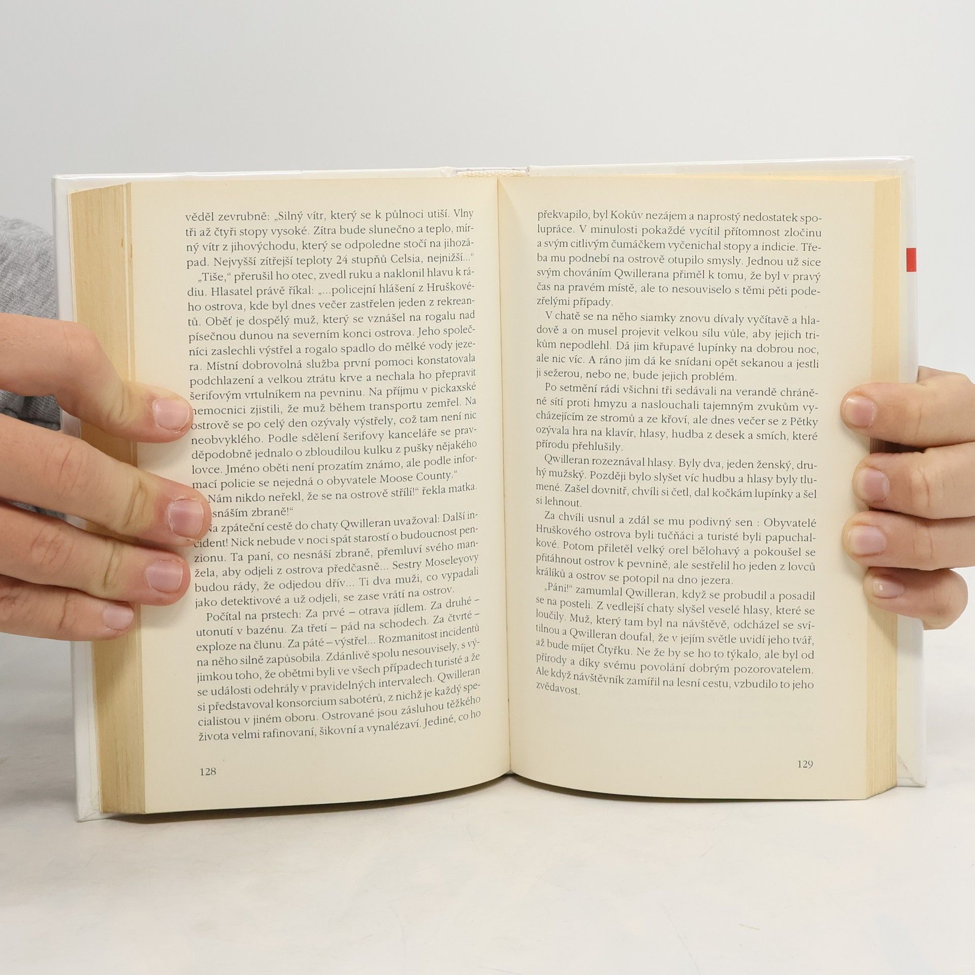 Qwilleran v obvyklém siamském doprovodu navštíví ostrov mnoha jmen. Jinak jej nazývají domorodci, jinak bohatí, kteří se sem stěhují na léto, i projektanti a turisté, kteří toto kdysi klidné místo obrátili vzhůru nohama. V každém případě se tu dá báječně lenošit, rybařit, plachtit... Qwill tu hodlá strávit delší dobu a poněkud se zotavit. Prázdninová pohoda se však nekoná, řada nehod v Jachtklubu a vražda ji zaplašily. Qwillův tým je tedy opět jednou ve správnou dobu na správném místě a několik kostek domina, které Koko správně seřadí, ho přivede na správnou stopu.