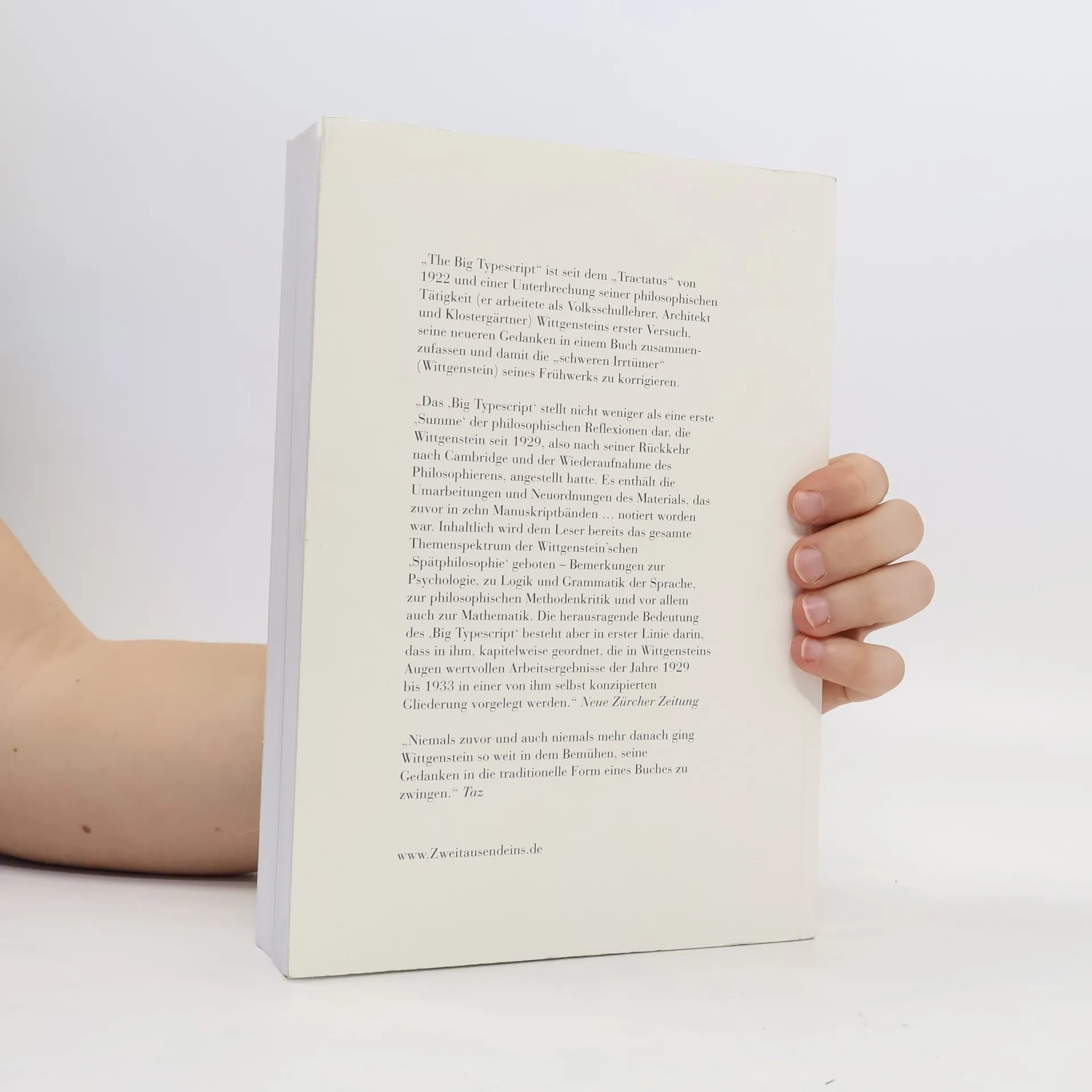 Wittgenstein revidiert Wittgenstein: The Big Typescript. Sein „Tractatus logico-philosophicus“ schien die philosophischen Probleme „im Wesentlichen endgültig gelöst“ (Wittgenstein) zu haben. Doch dann machte Wittgenstein Notizen für ein „zweites Buch“, das die, so Wittgenstein, „schweren Irrtümer“ seines Frühwerkes korrigieren sollte. Vieles davon vernichtete er, doch in seinem Nachlass fanden sich noch immer ca. 20.000 beschriebene Blätter. „‚The Big Typescript‘ ist deswegen bedeutsam, weil in ihm die enge Verbindung von mathematisch-logischer und sprachphilosophischer Reflexion in Wittgensteins Denken geradezu exemplarisch vorgeführt wird“ (Börsenblatt). Der komplette Text der Originalausgabe (deutscher Text) zu 155,94 EUR als Sonderedition im Format 16,5x24 cm. Nur bei uns.