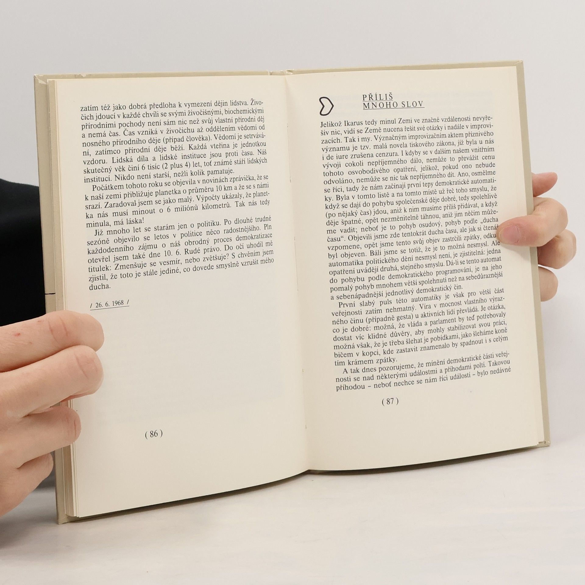 Kniha obsahuje 32 fejetonů, které vznikly od července 1967 do října 1968 a byly pod šifrou Vl (odmocnina z jedné = VL) publikovány na stránkách čtrnáctideníku Filmové a televizní noviny. Tematická linie prvního plánu se vyvíjí od prezentace kritického vztahu k televizi a masovým médiím vůbec až k výslovně politickým komentářům vrcholícího tzv. obrodného procesu konce 60. let a autorovy vlastní role v něm. Velmi často jsou však tyto výchozí situace pouhou záminkou a podnětem k úvahám obecnějšího charakteru. Základním tématem fejetonů se pak stávají individuálnost a originalita lidského jedince, jeho vztah k dějinným procesům, charakterová svébytnost a názorová koherence osobnosti, nesamozřejmost těchto vlastností a svízelný zápas o ně sváděný s vlastní pohodlností a lhostejností, s politickou mocí i oportunním lidským okolím. (Slovník české literatury)... celý text