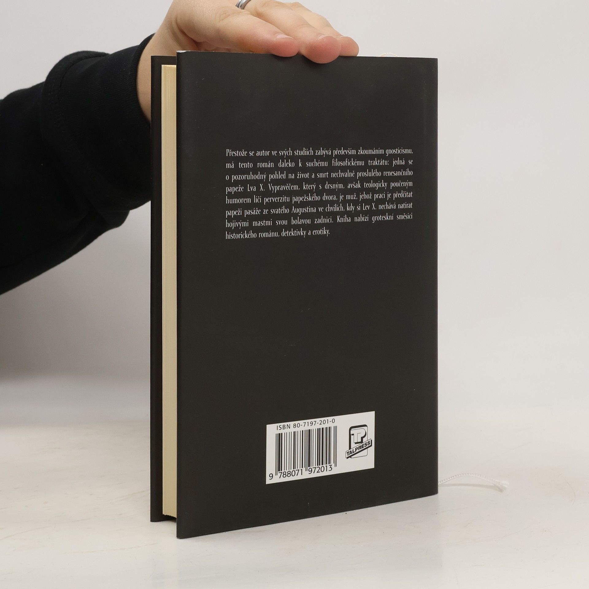 Pod pseudonymem D. Madsen se skrývá britský filosof a teolog, který se ve svých studiích zabývá především zkoumáním gnosticismu. Román má však daleko k suchému filosofickému traktátu: jedná se o pozoruhodný pohled na život a smrt nechvalně proslulého renesančního papeže Lva X. Vypravěčem, který s drsným, avšak teologicky poučeným humorem líčí perverzitu papežského dvora, je muž, jehož prací je předčítat papeži pasáže ze svatého Augustina ve chvílích, kdy si Lev X. nechává natírat hojivými mastmi svou bolavou zadnici. Kniha nabízí groteskní směsici historického románu, detektivky a erotiky.