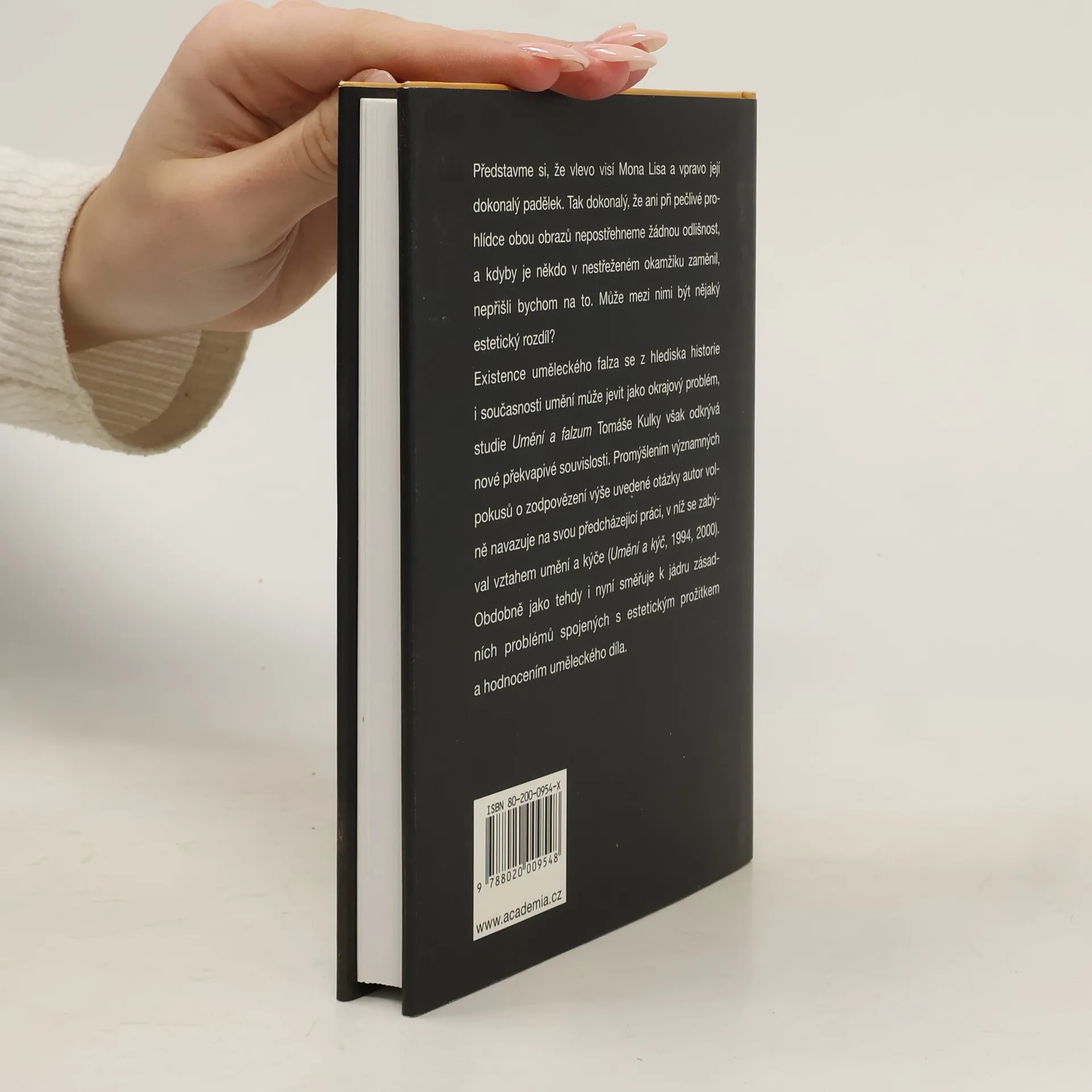 Představme si, že vlevo visí Mona Lisa a vpravo její dokonalý padělek. Tak dokonalý, že ani při pečlivé prohlídce obou obrazů nepostřehneme žádnou odlišnost, a kdyby je někdo v nestřeženém okamžiku zaměnil, nepřišli bychom na to. Může mezi nimi být nějaký estetický rozdíl? Existence uměleckého falza se z hlediska historie i současnosti umění může jevit jako okrajový problém, studie Umění a falzum Tomáše Kulky však odkrývá nové překvapivé souvislosti. Promýšlením významných pokusů o zodpovězení výše uvedené otázky autor volně navazuje na svou předcházející práci, v níž se zabýval vztahem umění a kýče (Umění a kýč, 1994, 2000). Obdobně jako tehdy i zde směřuje do centra zásadních problémů spojených s estetickým prožitkem a hodnocením uměleckého díla.