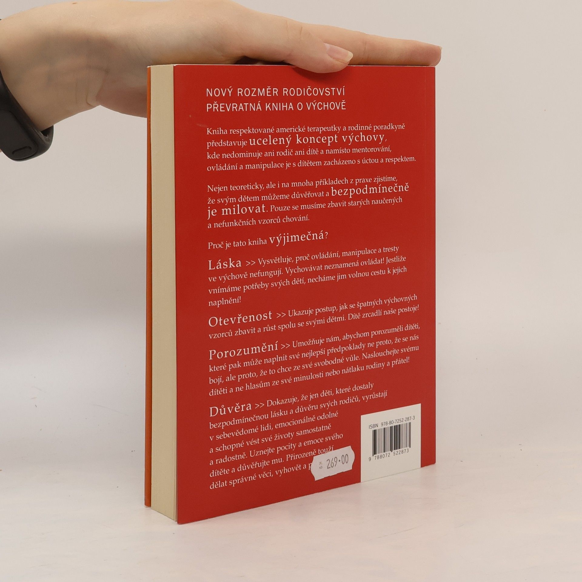 Kniha respektované americké terapeutky a rodinné poradkyně představuje ucelený koncept výchovy, kde nedominuje ani rodič ani dítě a namísto mentorování, ovládání a manipulace je s dítětem zacházeno s úctou a respektem. Nejen teoreticky, ale i na mnoha příkladech z praxe zjistíme, že svým dětem můžeme důvěřovat a bezpodmínečně je milovat. Pouze se musíme zbavit starých naučených a nefunkčních vzorců chování. Proč je tato kniha výjimečná? láska- vysvětluje, proč ovládání, manipulace a tresty ve výchově nefungují. otevřenost- ukazuje postup, jak se špatných výchovných vzorců zbavit a růst spolu se svými dětmi. porozumění- umožňuje nám, abychom porozuměli dítěti, které pak může naplnit své nejlepší předpoklady. důvěra- dokazuje, že jen děti, které dostaly bezpodmínečnou lásku a důvěru svých rodičů, vyrůstají v sebevědomé lidi, emocionálně odolné a schopné vést své životy samostatně a radostně.