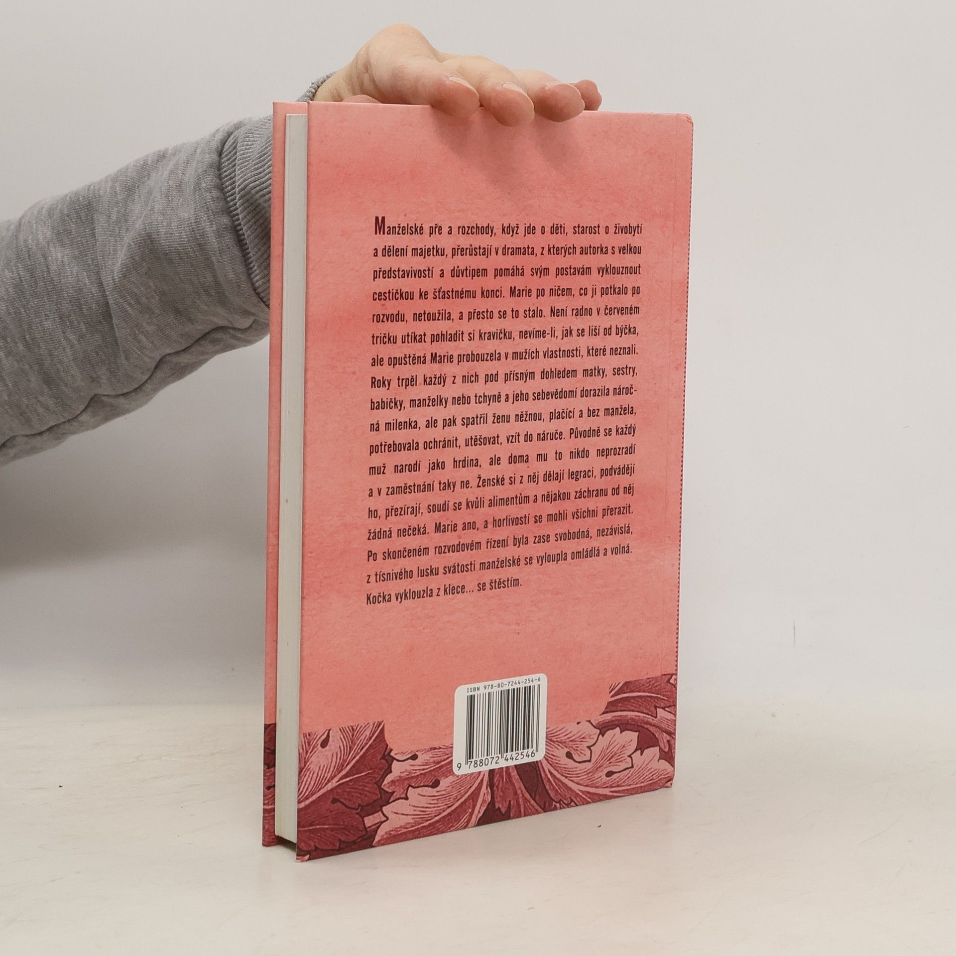 Kniha o lásce, manželství a partnerských rozchodech, které by neměly končit nešťastně, když jde o děti a smysl dalšího života. Manželské pře a rozchody, když jde o děti, starost o živobytí a dělení majetku, přerůstají v dramata, z kterých autorka s velkou představivostí a důvtipem pomáhá svým postavám vyklouznout cestičkou ke šťastnému konci. Marie po ničem, co ji potkalo po rozvodu, netoužila, a přesto se to stalo. Není radno v červeném tričku utíkat pohladit si kravičku, nevíme-li, jak se liší od býčka, ale opuštěná Marie probouzela v mužích vlastnosti, které neznali. Roky trpěl každý z nich pod přísným dohledem matky, sestry, babičky, manželky nebo tchyně a jeho sebevědomí dorazila náročná milenka, ale pak spatřil ženu něžnou, plačící a bez manžela, potřebovala ochránit, utěšovat, vzít do náruče. Původně se každý muž narodí jako hrdina, ale doma mu to nikdo neprozradí a v zaměstnání taky ne. Ženské si z něj dělají legraci, podvádějí ho, přezírají, soudí se kvůli alimentům a nějakou záchranu od něj žádná nečeká. Marie ano, a horlivostí se mohli všichni přerazit. Po skončeném rozvodovém řízení byla zase svobodná, nezávislá, z tísnivého lusku svátosti manželské se vyloupla omládlá a volná. Kočka vyklouzla z klece... se štěstím.