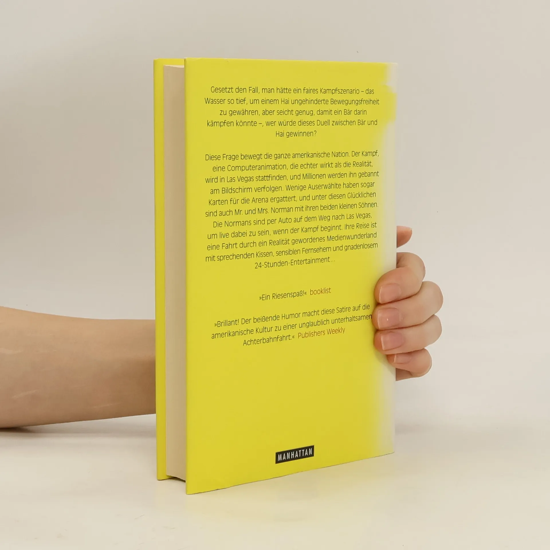 Gesetzt den Fall, man hätte ein faires Kampfszenario, das Wasser so tief, um einem Hai ungehinderte Bewegungsfreiheit zu gewähren, aber seicht genug, damit ein Bär darin stehen und kämpfen könnte, wer würde dieses Duell zwischen Bär und Hai gewinnen? Diese Frage bewegt die ganze amerikanische Nation. Der Kampf, eine Computeranimation die echter wirkt als die Realität, wird in Las Vegas stattfinden und Millionen werden ihn gebannt am Bildschirm verfolgen. Wenige Auserwählte haben sogar Karten für die Arena ergattert, und unter diesen Glücklichen sind auch die Normans, eine amerikanische Durchschnittsfamilie: Vater Norman, Mutter Norman sowie die beiden Söhne Curtis und Matthew. Gemeinsam machen sie sich auf den Weg nach Las Vegas, begleitet von Stimmen aus Radio und Fernsehen, von Kameras sowie von Kommentaren aus allen kulturellen Nischen: Freudianer, Theologen, Bär-gegen-Hai-Fans, einsame Folksänger, Untergrundorganisationen. Sie alle haben etwas zu dem bevorstehenden Großereignis zu sagen. Es ist das bunte Rauschen einer Medienkultur, die keinen höheren Wert als das Entertainment kennt. So lehnen sich auch die Normans schließlich auf ihrem Platz zurück und warten darauf, dass das Spektakel beginnt.