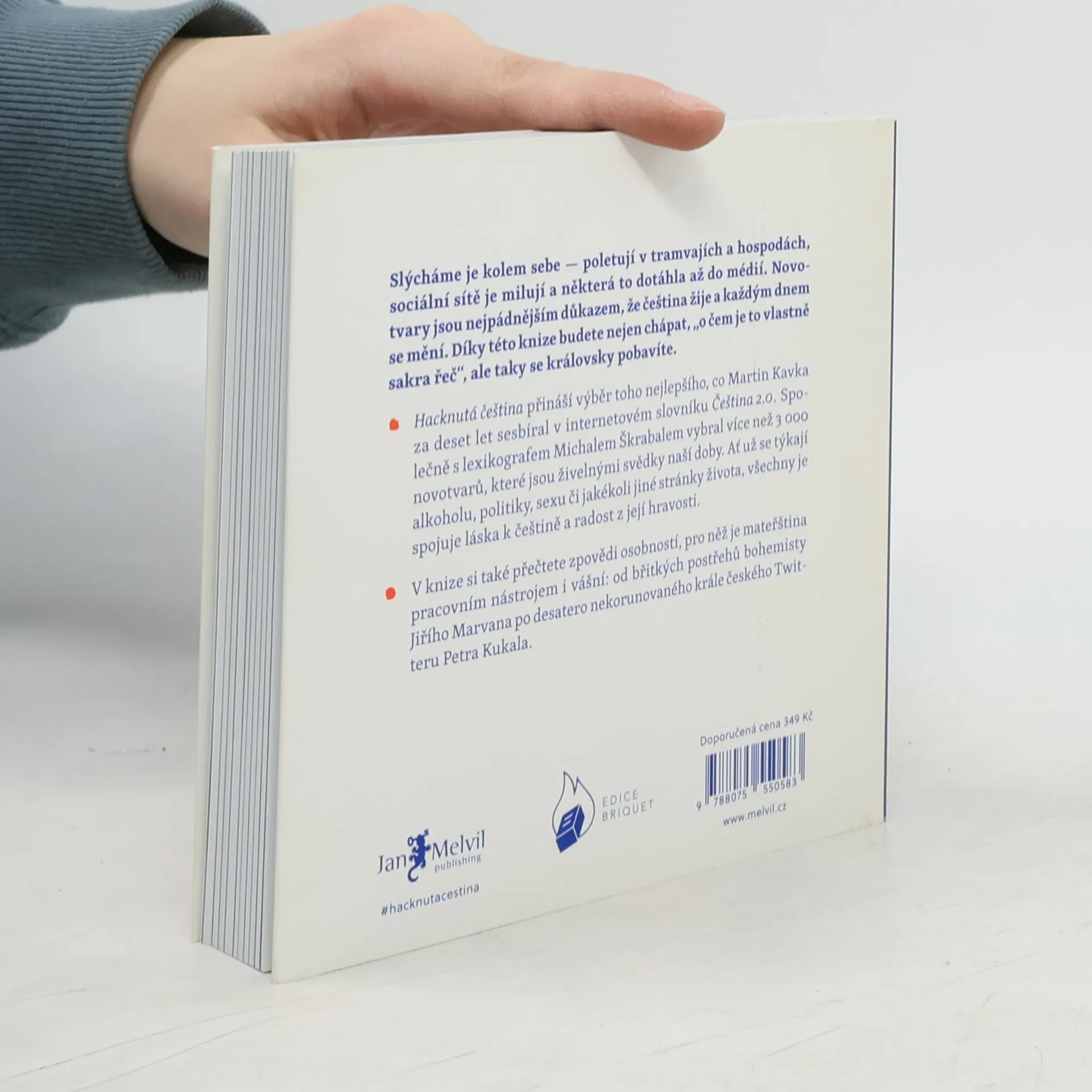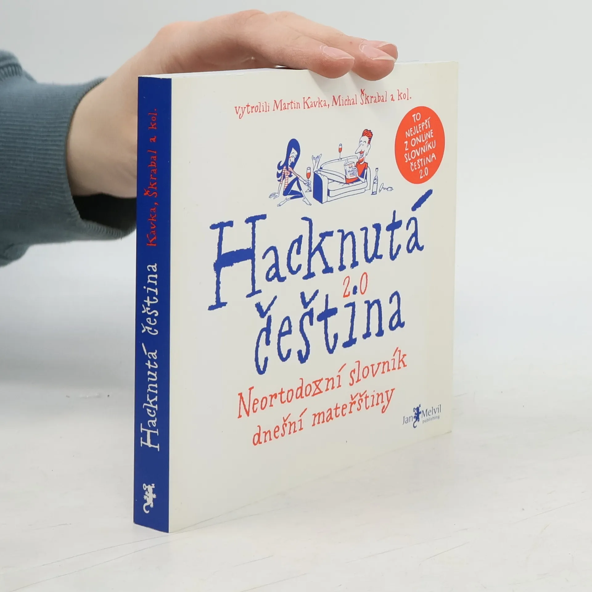 Často slýcháte nářky nad úpadkem češtiny? Opak je pravdou. Čeština vzkvétá a obohacuje se jak domácími, tak přejatými prvky. Důkazem je on-line slovník Čeština 2.0, do kterého už deset let přidávají uživatelé originální česká slova. Tento projekt se stal hřištěm pro jazykové nadšence, kteří zajišťují, že novotvary a další slova nezapadnou, ale zůstanou jako svědci doby. Z tisíců on-line hesel se do knihy vešlo přes 3000 výrazů, které s jazykovou kreativitou popisují vše od politiky po každodenní život. Slovník hacknuté češtiny obohatí vaši slovní zásobu. Zjistíte, kdo je krachonoš, vadína, surikata, řvoused nebo kontokorentiér, co obnáší mít čvančary, memopauzu, chcavenku či kurvítko, a co znamená jet haldy, milošekunda, nánotechnologie, alzaheimer nebo benevtip. Kromě slovníkového „best of“ kniha obsahuje povídání zakladatele slovníku Martina Kavky s devíti osobnostmi, pro něž je čeština pracovním nástrojem. O tom, jak si s jazykem hrají a jaké v nich vzbuzuje emoce, vyprávějí blogerka Michelle Losekoot, lektor René Nekuda, herec Jan Zadražil, básník Petr Kukal, překladatelka Anežka Charvátová, sloganistka Lenka Papřoková, komik Pavel Tomeš, lingvistka Michaela Lišková a jazykozpytec Jiří Marvan.