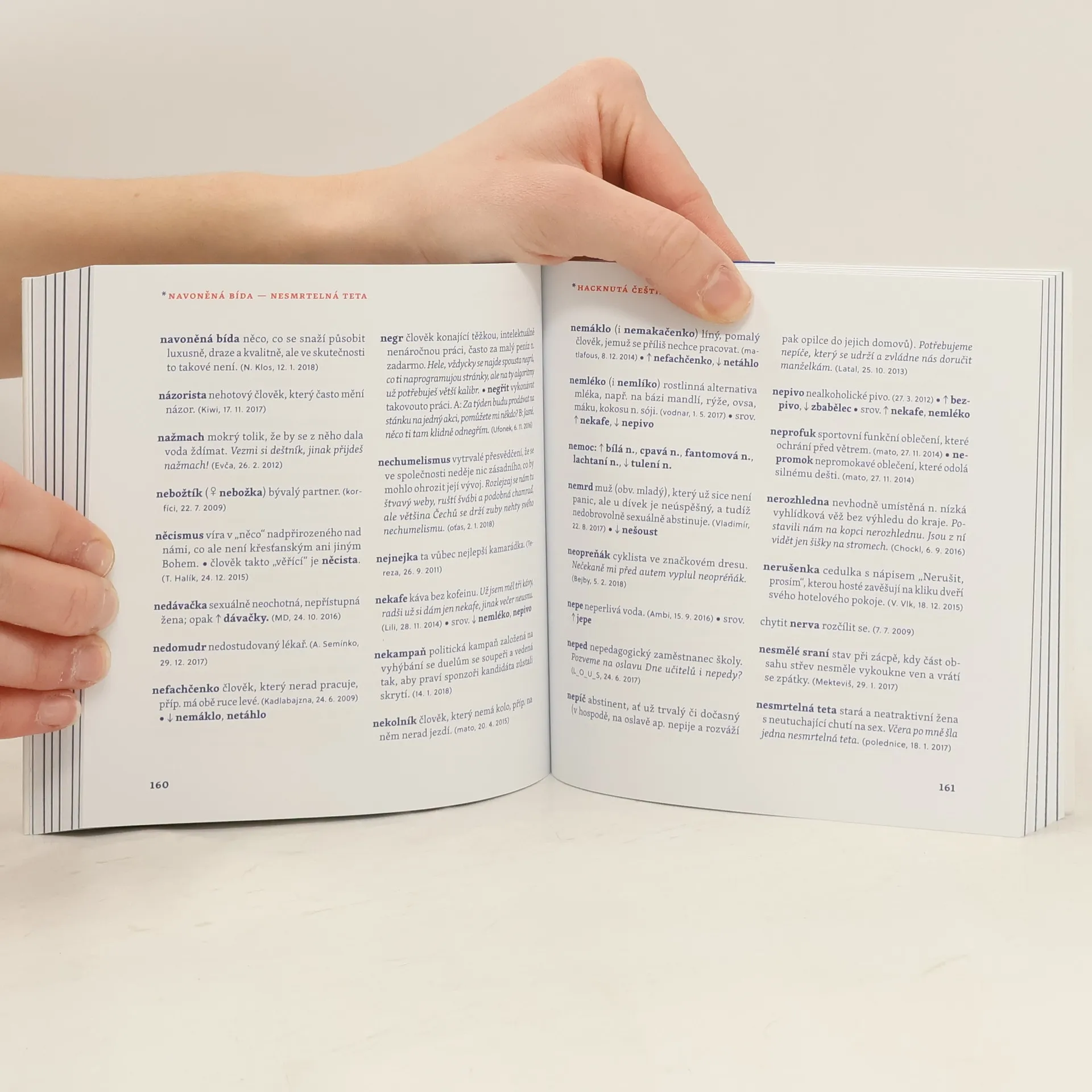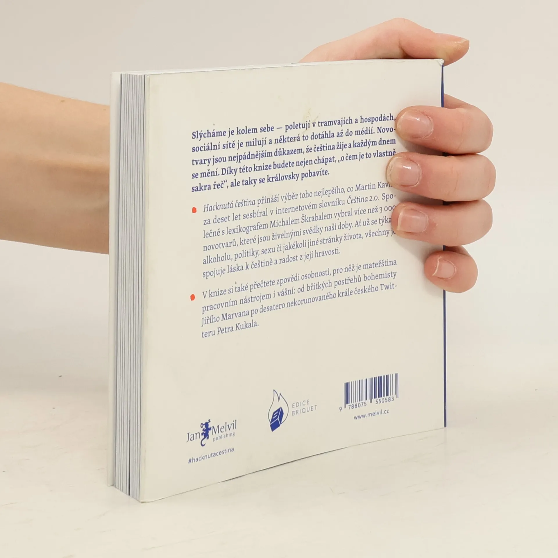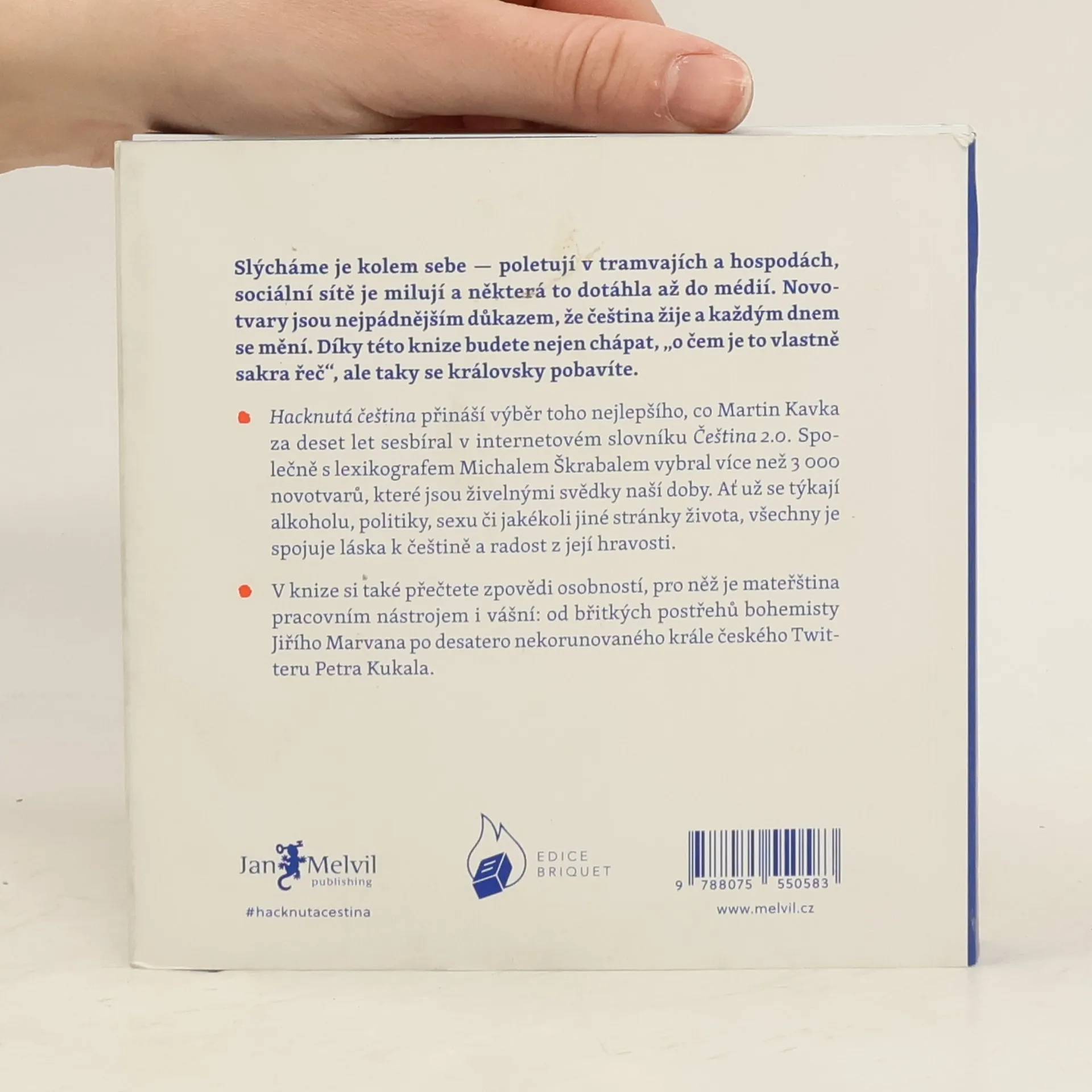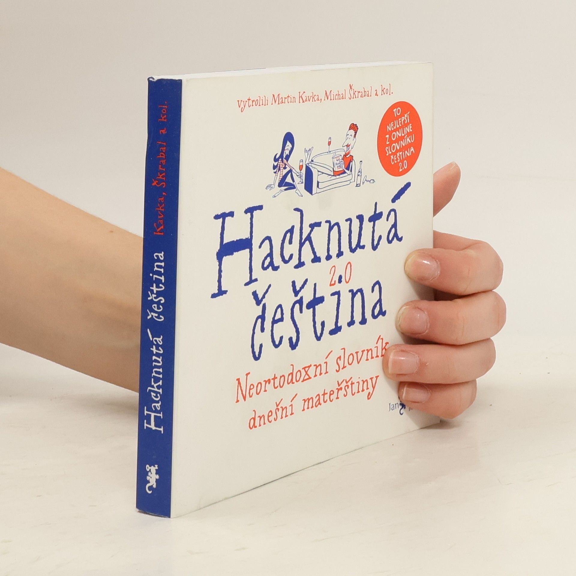Často slýcháte nářky nad úpadkem češtiny? Opak je pravdou. Čeština vzkvétá a obohacuje se jak domácími, tak přejatými prvky. Důkazem je on-line slovník Čeština 2.0, do kterého už deset let přidávají uživatelé originální česká slova. Tento projekt se stal hřištěm pro jazykové nadšence, kteří zajišťují, že novotvary a další slova nezapadnou, ale zůstanou jako svědci doby. Z tisíců on-line hesel se do knihy vešlo přes 3000 výrazů, které s jazykovou kreativitou popisují vše od politiky po každodenní život. Slovník hacknuté češtiny obohatí vaši slovní zásobu. Zjistíte, kdo je krachonoš, vadína, surikata, řvoused nebo kontokorentiér, co obnáší mít čvančary, memopauzu, chcavenku či kurvítko, a co znamená jet haldy, milošekunda, nánotechnologie, alzaheimer nebo benevtip. Kromě slovníkového „best of“ kniha obsahuje povídání zakladatele slovníku Martina Kavky s devíti osobnostmi, pro něž je čeština pracovním nástrojem. O tom, jak si s jazykem hrají a jaké v nich vzbuzuje emoce, vyprávějí blogerka Michelle Losekoot, lektor René Nekuda, herec Jan Zadražil, básník Petr Kukal, překladatelka Anežka Charvátová, sloganistka Lenka Papřoková, komik Pavel Tomeš, lingvistka Michaela Lišková a jazykozpytec Jiří Marvan.