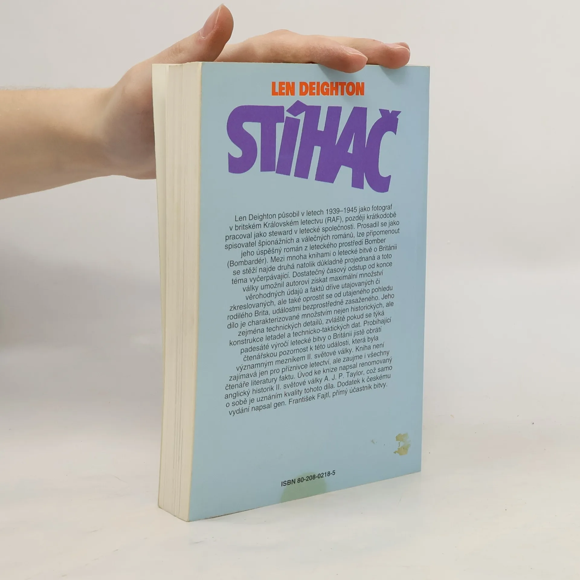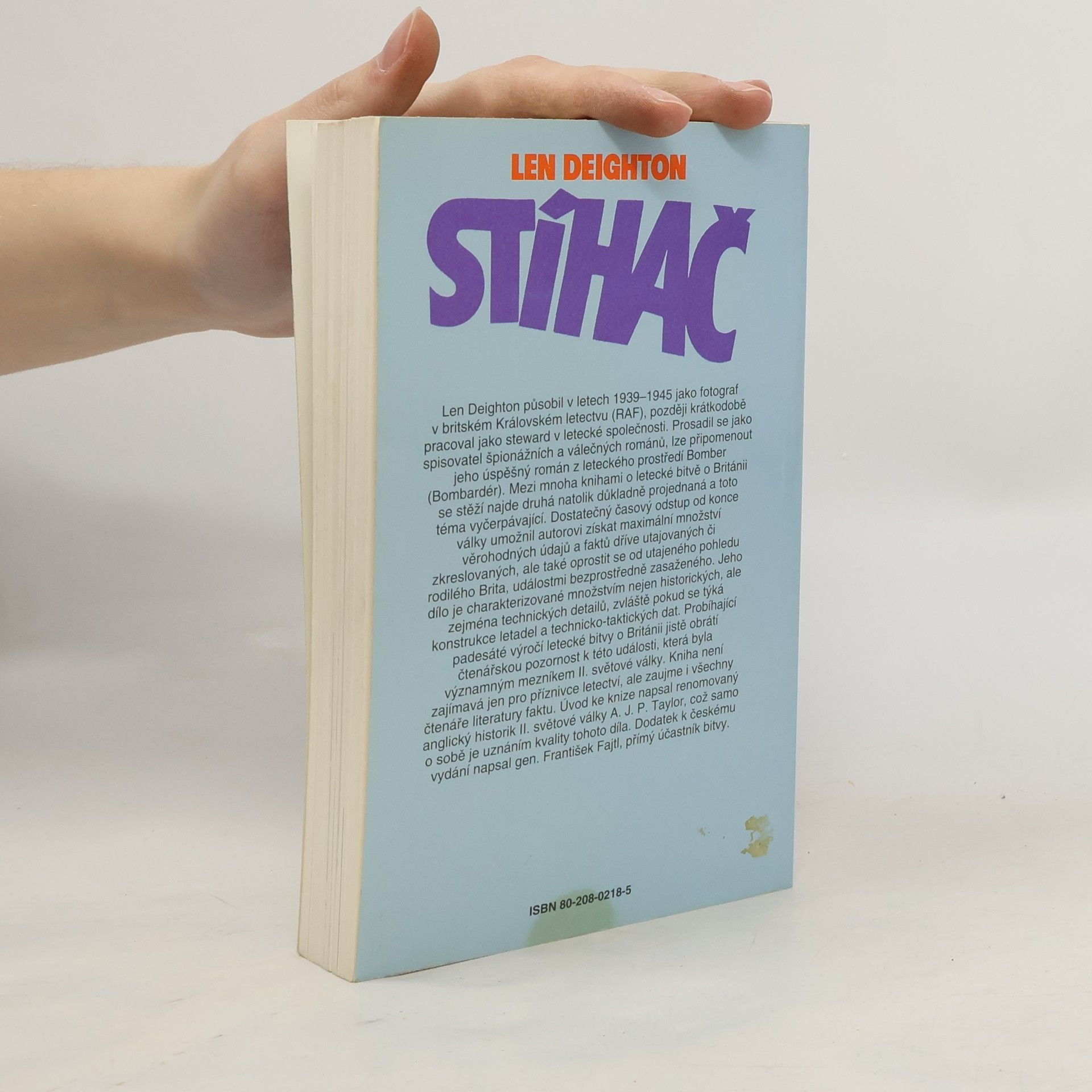 Bitva o Británii – jak to skutečně bylo. Len Deighton působil v letech 1939–1945 jako fotograf v britském Královském letectvu (RAF), později krátkodobě pracoval jako steward v letecké společnosti. Prosadil se jako spisovatel špionážních a válečných románů, lze připomenout jeho úspěšný román z leteckého prostředí Bomber (Bombardér). Mezi mnoha knihami o letecké bitvě o Británii se stěží najde druhá natolik důkladně projednaná a toto téma vyčerpávající. Dostatečný časový odstup od konce války umožnil autorovi získat maximální množství věrohodných údajů a faktů dříve utajovaných či zkreslovaných, ale také oprostit se od utajeného pohledu rodilého Brita, událostmi bezprostředně zasaženého. Jeho dílo je charakterizované množstvím nejen historických, ale zejména technických detailů, zvláště pokud se týká konstrukce letadel a technicko-taktických dat. Probíhající padesáté výročí letecké bitvy o Británii jistě obrátí čtenářskou pozornost k této události, která byla významným mezníkem II. světové války. Kniha není zajímavá jen pro příznivce letectví, ale zaujme i všechny čtenáře literatury faktu. Úvod ke knize napsal renomovaný anglický historik II. světové války A. J. P. Taylor, což samo o sobě je uznáním kvality tohoto díla. Dodatek k českému vydání napsal gen. František Fajtl, přímý účastník bitvy.
