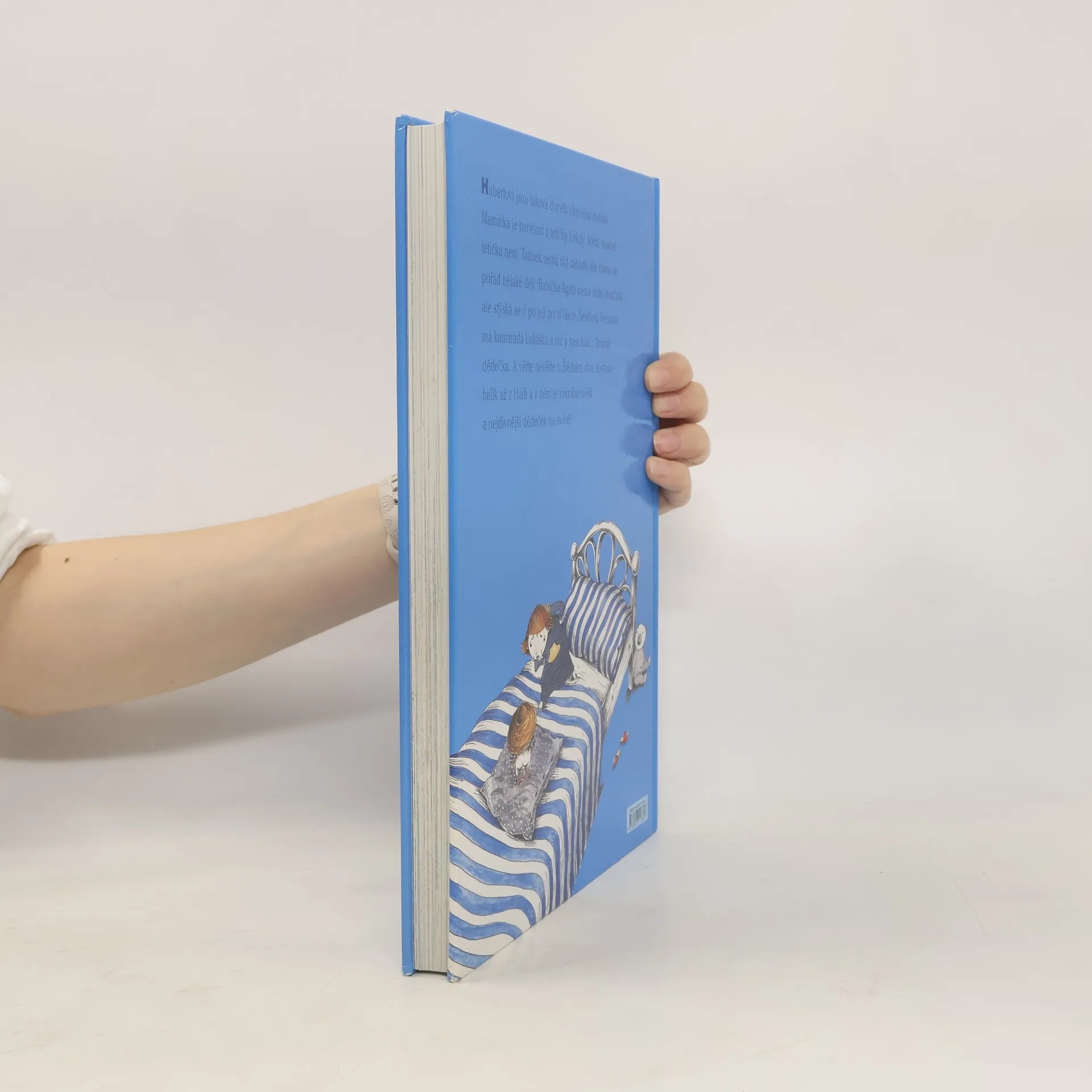 Hubertovi jsou taková docela obyčejná rodina. Maminka je nervózní z tetičky Uršuly, která vlastně tetička není. Tatínek nemá rád záhady, ale doma se pořád nějaké dějí. Babička Agáta nemá ráda morčata, ale stýská se jí po její první lásce. Šestiletá Verunka má kamaráda Lukáška a nic jí neschází ... kromě dědečka. A věřte nevěřte o Štědrém dnu dostane balík až z Haiti a v něm nejzábavnější a nejdivnější dědeček na světě. Ilustrace: Galina Miklínová.