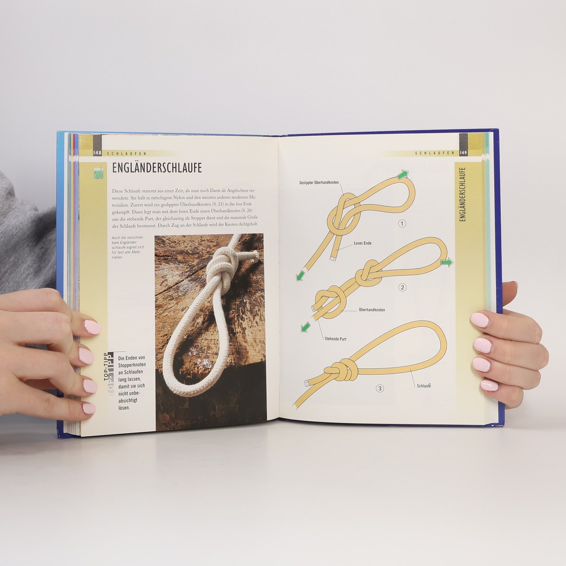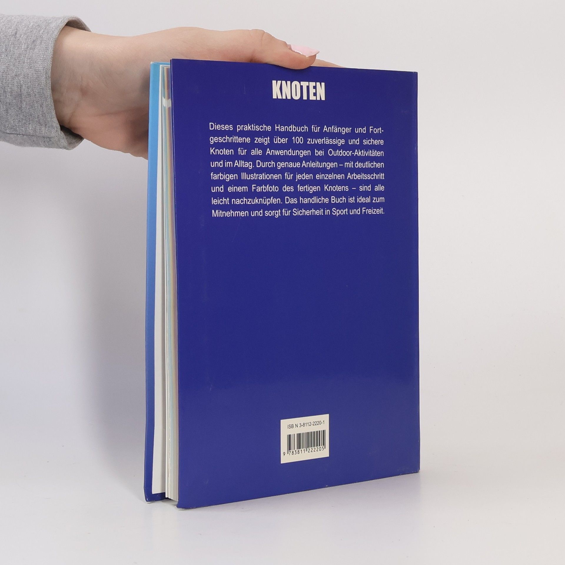 Dieses praktische Handbuch für Anfänger und Fortgeschrittene zeigt über 100 zuverlässige und sichere Knoten für alle Outdoor-Aktivitäten und im Alltag. Durch genaue Anleitungen -- mit deutlichen farbigen Illustrationen für jeden einzelnen Arbeitsschritt -- sind sie leicht nachzuknüpfen. Ein Farbfoto des fertigen Knotens hilft bei der Kontrolle. Das handliche Format passt in jede Tasche und sorgt so stets für Sicherheit in Sport und Freizeit. · Maximale Deutlichkeit durch genaue Schritt-für-Schritt-Illustrationen · Strapazierfähiges Flexibinding · Jedes Kapitel mit Tipps zum Einsatz der Knoten. · Hinweis auf die jeweilige Zielgruppe