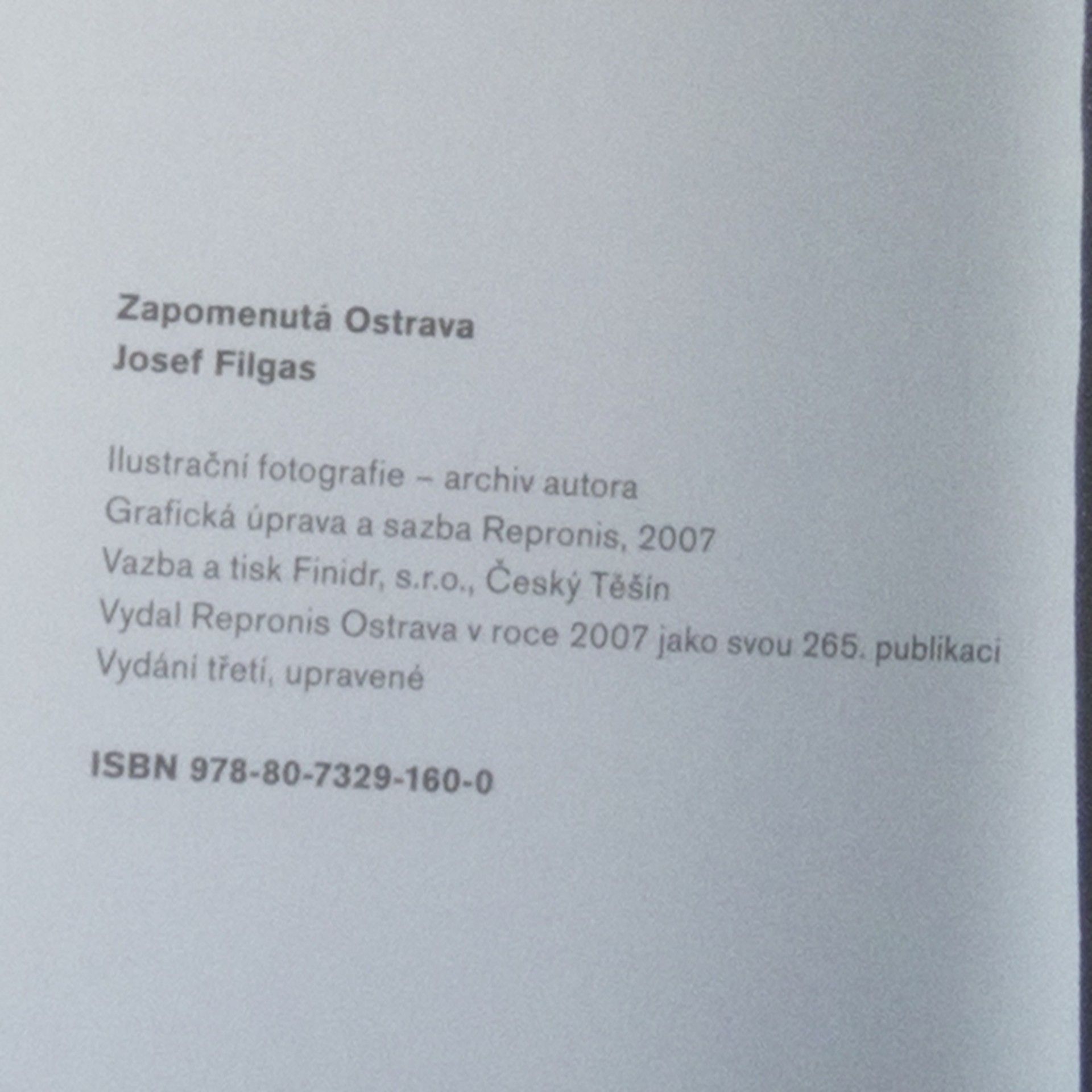Novodobé pojetí knihy Zapomenutá Ostrava novináře a rozhlasového publicisty Josefa Filgase s dokumentárními fotografiemi a dosud nezveřejněnými fejetony mapuje období první republiky v Ostravě. Kniha je doplněna dokumentárními fotografiemi z pozůstalosti Josefa Filgase a fejetony, které v žádné z předchozích vydání uveřejněny nebyly. Autorem úvodu je Radovan Lipus, který jak říká: „Lze zapomenout na mnohé. A po právu. Ne však na Filgasovu Zapomenutou Ostravu.“