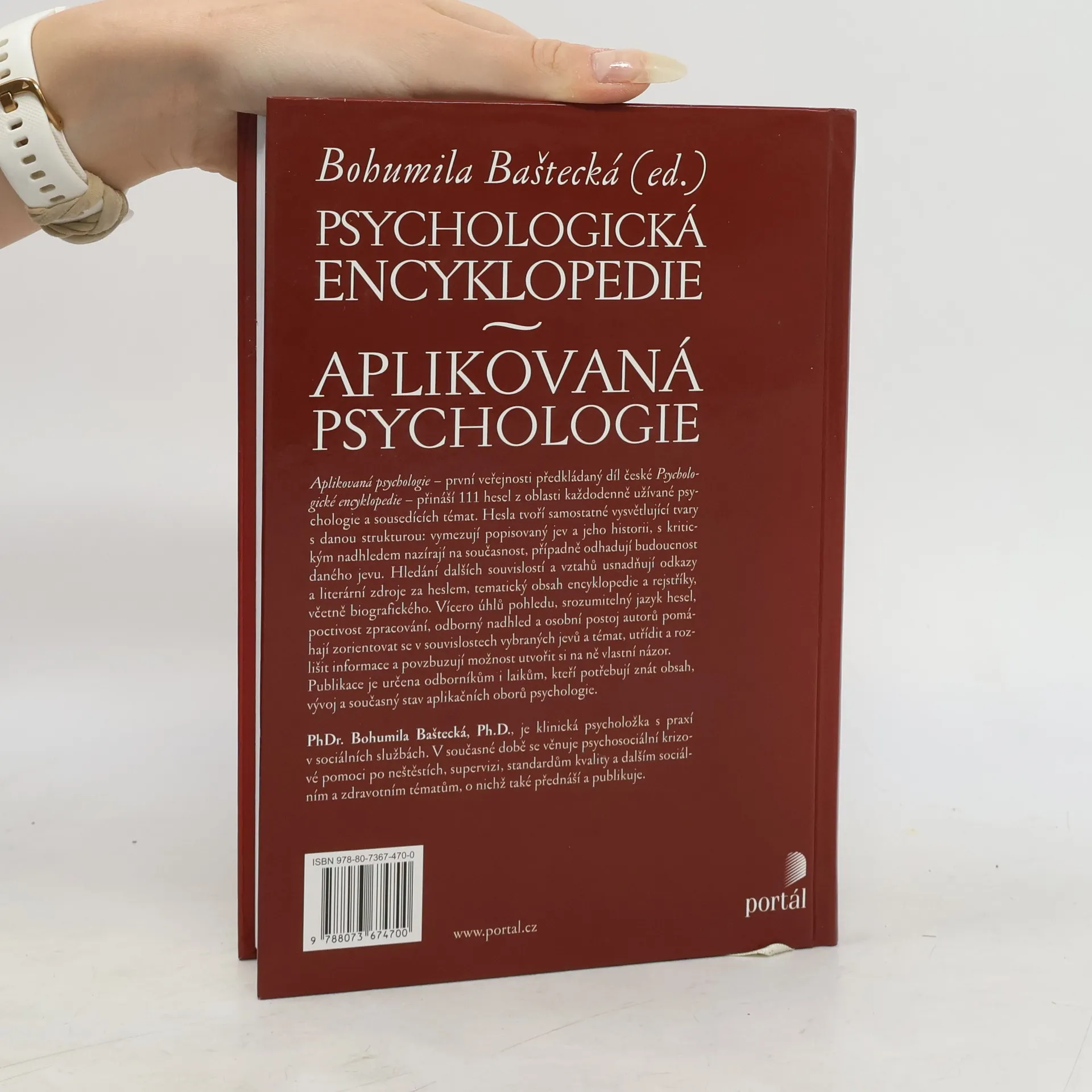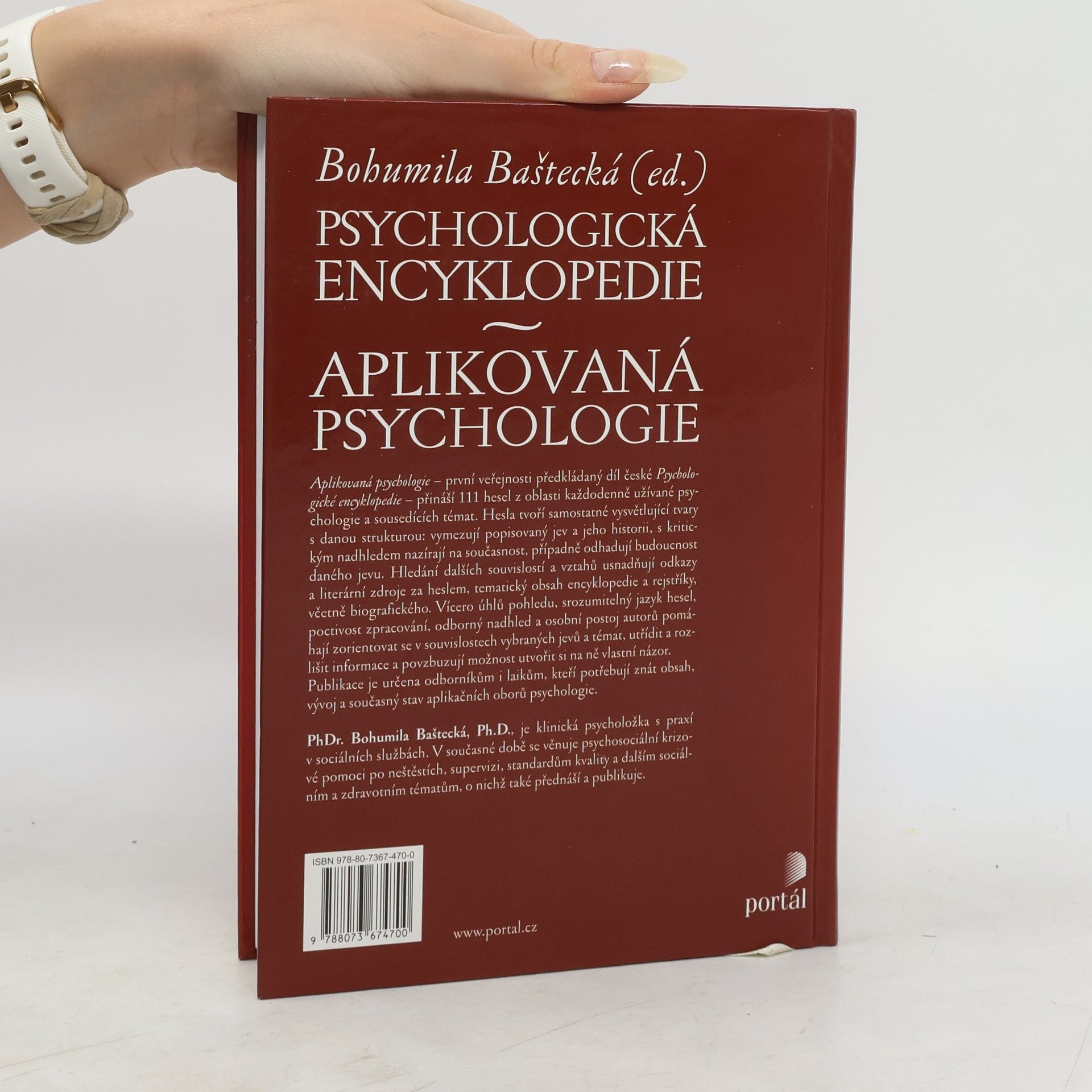 Publikace sestavená týmem našich předních odborníků představuje v ucelených statích současný stav bádání v oblasti aplikované psychologie a některých souvisejících disciplín. Obsah je strukturován do tematických bloků s jednotlivými hesly.Tato moderní encyklopedie by neměla chybět v knihovnách psychologů, psychiatrů, psychoterapeutů a dalších odborníků v pomáhajících profesích. Užitečným pomocníkem se může stát pro studenty psychologie a dalších humanitních oborů. PhDr. Bohumila Baštecká, Ph.D., je klinická psycholožka s praxí v sociálních službách. V současné době působí a vzdělává v oblasti psychosociální krizové pomoci po neštěstích, supervize, standardů kvality a dalších sociálních a zdravotních témat.