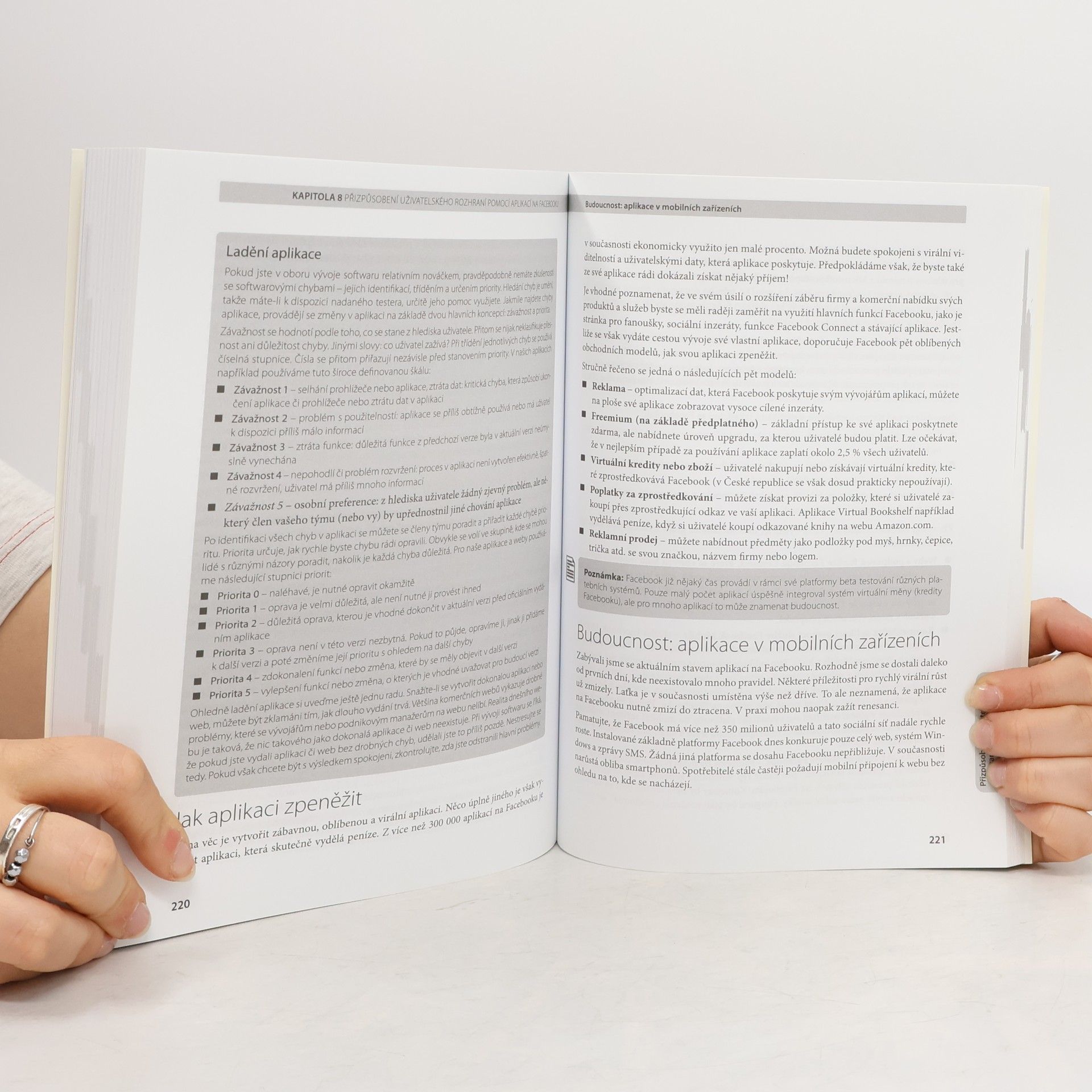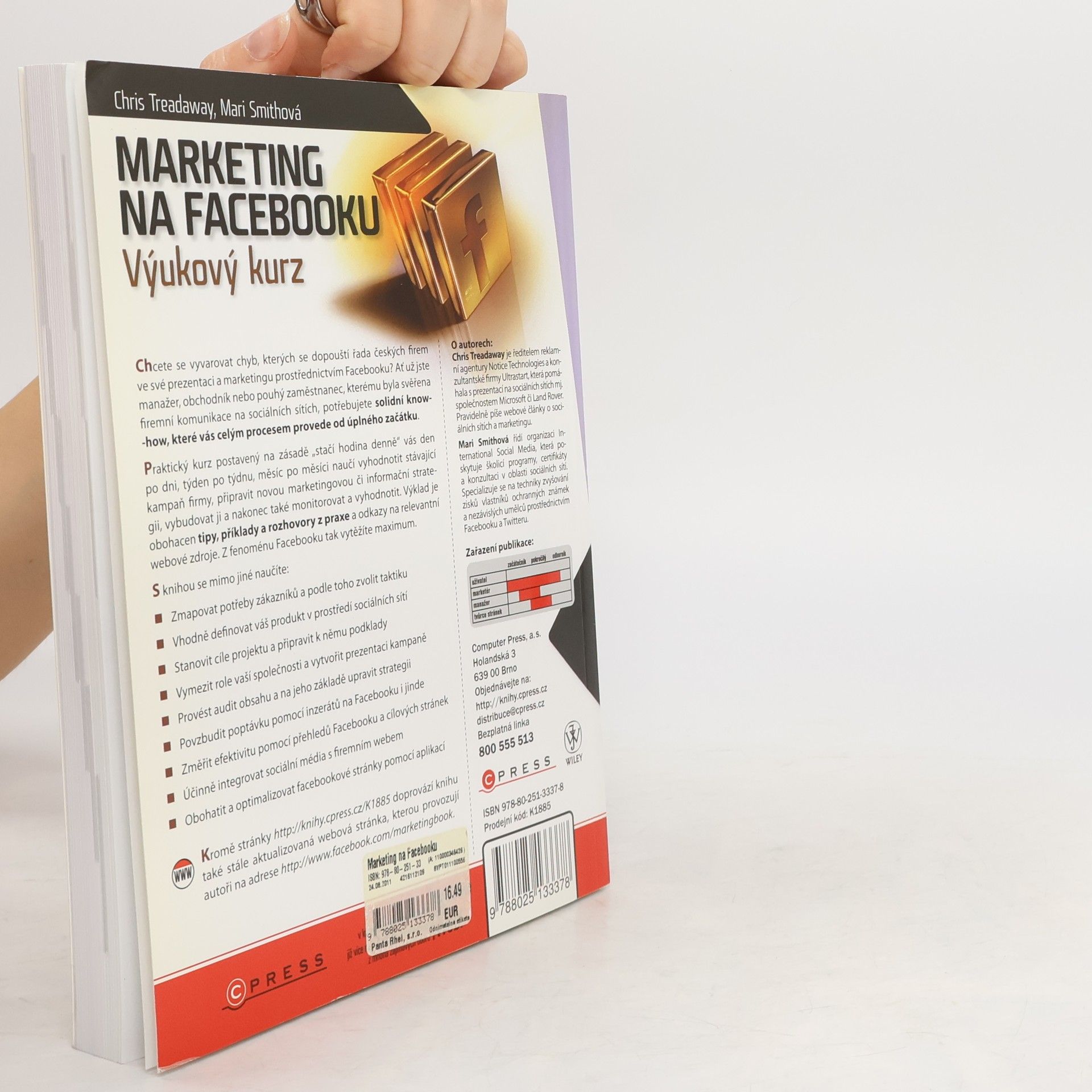 Chcete se vyvarovat chyb v prezentaci a marketingu na Facebooku? Ať už jste manažer, obchodník nebo zaměstnanec odpovědný za firemní komunikaci na sociálních sítích, potřebujete solidní know-how, které vás provede celým procesem od začátku. Praktický kurz, založený na principu „stačí hodina denně“, vás naučí vyhodnotit stávající kampaň, připravit novou marketingovou strategii, vybudovat ji a monitorovat její úspěšnost. Výklad je obohacen tipy, příklady a rozhovory z praxe, stejně jako odkazy na relevantní webové zdroje. Naučíte se zmapovat potřeby zákazníků a zvolit taktiku, vhodně definovat produkt na sociálních sítích, stanovit cíle projektu a připravit potřebné podklady. Dále se dozvíte, jak vymezit role společnosti a vytvořit prezentaci kampaně, provést audit obsahu a upravit strategii na jeho základě. Získáte dovednosti k povzbuzení poptávky pomocí inzerátů na Facebooku, měření efektivity kampaní a integraci sociálních médií s firemním webem. Kromě toho se naučíte obohatit a optimalizovat facebookové stránky pomocí aplikací. Kniha je doplněna stále aktualizovanou webovou stránkou, kterou autoři provozují.