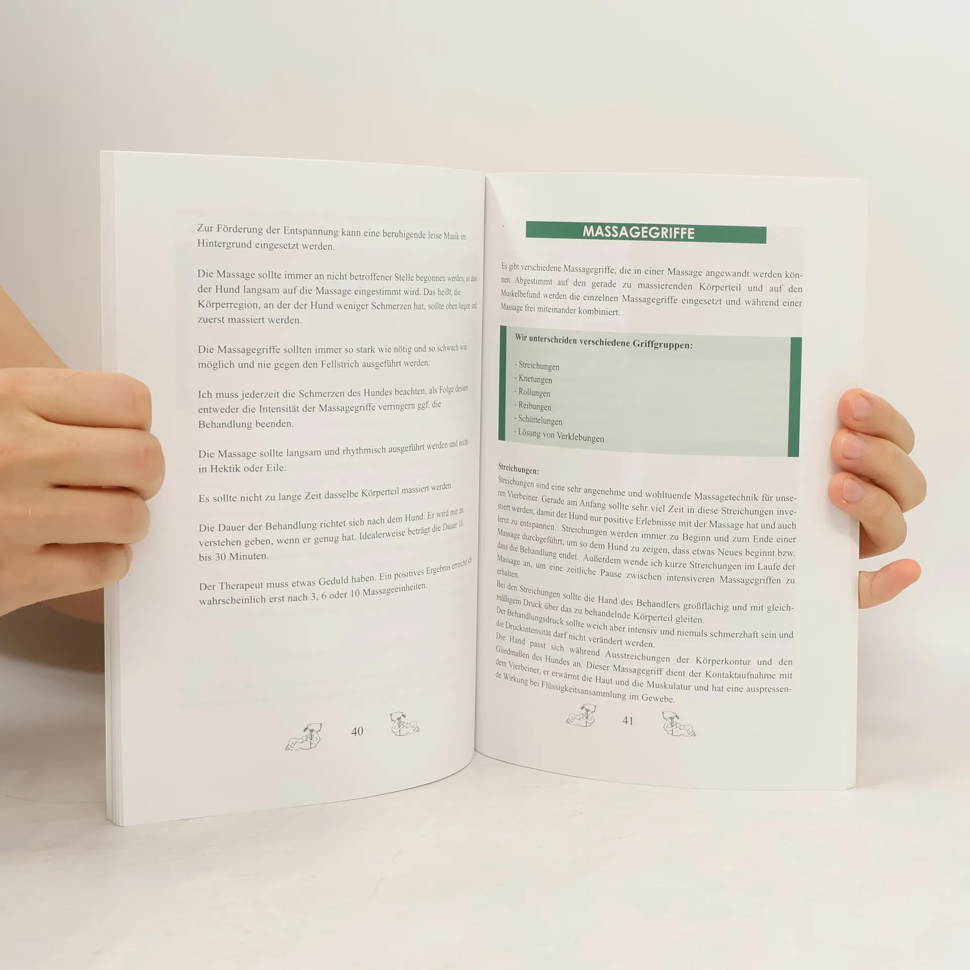 aus dem Inhalt: Vorwort; Wie alles begann…; Chronologie; Krankheiten; Hüftgelenksdysplasie; Bandscheibenvorfall; Arthrose; Arthritis - Gelenksentzündung; Der Schmerz; Die Muskulatur; Entstehung von Muskelverspannungen; Befunderhebung; massagevorbereitende Maßnahmen; Die Massage; Massagegriffe; Ablauf einer Massage; Narbenbehandlung; Igelballmassage; Bürstenmassage; Heiße Rolle; Wickel; Massageessenz; Massagegeräte; Sport, Spiel und Spaß – Was darf ein Hund mit Skeletterkrankungen?; Zum Schluss….; Literaturhinweise; Quellen; Adresshinweise; Danksagung;
