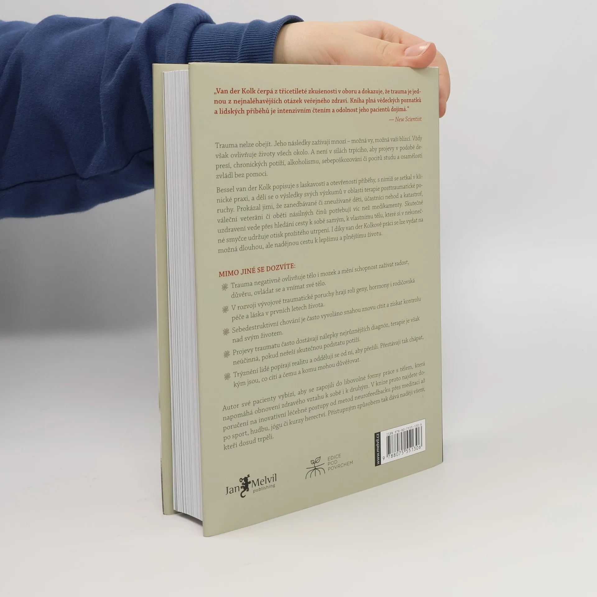 Trauma nelze obejít a jeho následky ovlivňují životy mnoha lidí, včetně vás a vašich blízkých. Trpící jedinci často nezvládají projevy jako deprese, chronické potíže, alkoholismus či osamělost bez pomoci. Autor popisuje příběhy ze své klinické praxe a sdílí výsledky výzkumů v oblasti terapie posttraumatické poruchy. Prokázal, že oběti traumatu, včetně dětí a válečných veteránů, potřebují víc než jen medikamenty. Skutečné uzdravení spočívá v hledání cesty k sobě samým a k tělu, které si uchovává otisk prožitého utrpení. Dozvíte se, že trauma negativně ovlivňuje tělo a mozek, mění schopnost prožívat radost a důvěru. Vývojová traumatická porucha je ovlivněna geny, hormony a rodičovskou péčí. Sebedestruktivní chování často vychází z touhy znovu cítit a získat kontrolu. Projevy traumatu bývají mylně diagnostikovány, a terapie je neúčinná, pokud neřeší skutečnou podstatu potíží. Trýznění lidé se oddělují od reality, což narušuje jejich identitu a schopnost důvěřovat. Autor vybízí pacienty k zapojení do různých forem práce s tělem, které pomáhají obnovit zdravý vztah k sobě i ostatním. Kniha nabízí doporučení na inovativní léčebné metody, jako jsou neurofeedback, meditace, sport, hudba, jóga či herectví, a dává naději těm, kteří trpěli.