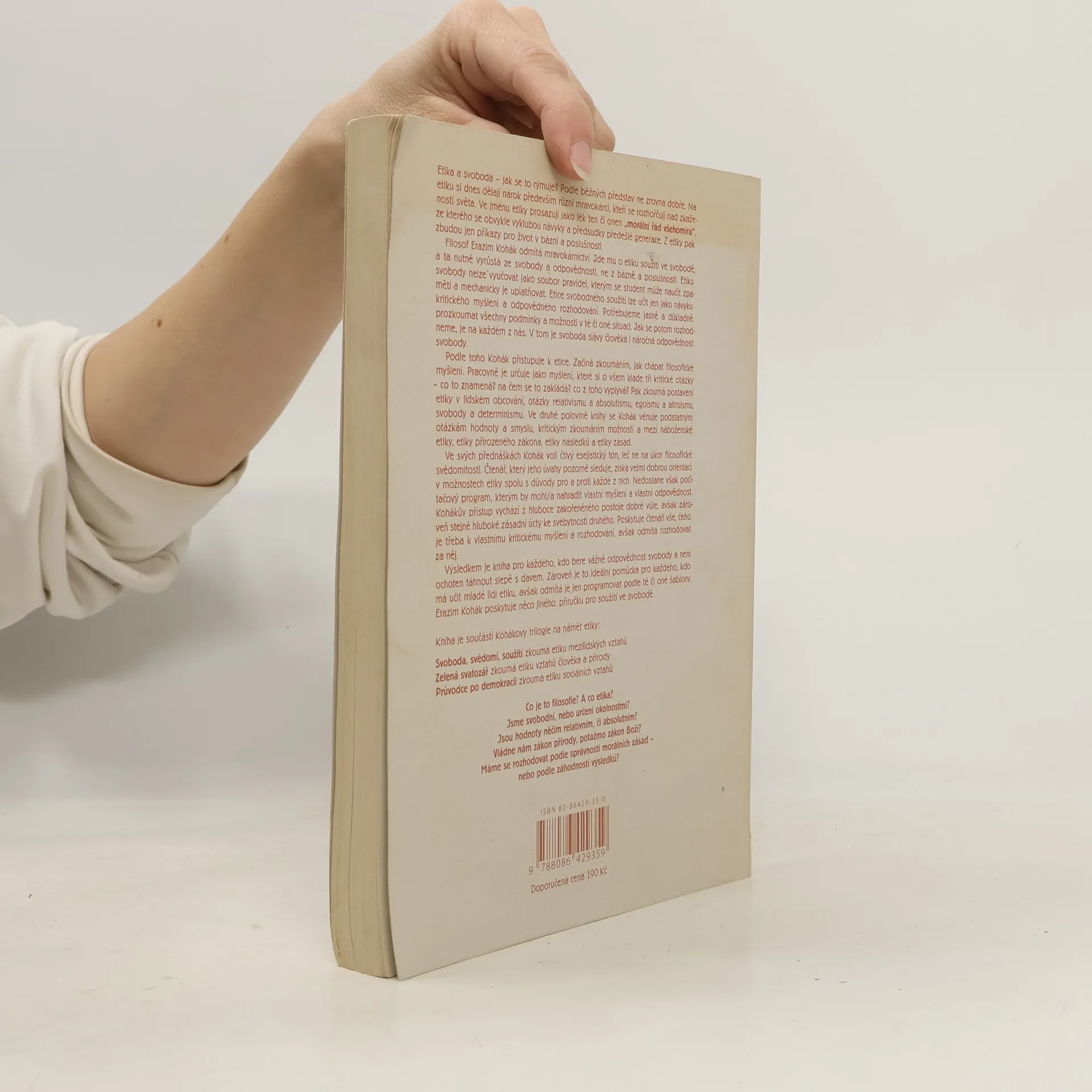Nová kniha známého filosofa. Ve svých přednáškách Kohák volí čtivý esejistický tón, leč ne na úkor filosofické svědomitosti. Čtenář, který jeho úvahy pozorně sleduje, získá velmi dobrou orientaci v možnostech etiky spolu s důvody pro a proti každé z nich. Je to kniha pro každého, kdo bere vážně odpovědnost svobody a není ochoten táhnout slepě s davem. Zároveň je to ideální pomůcka pro každého, kdo má učit mladé lidi etiku, avšak odmítá je jen programovat podle té či oné šablony. Erazim Kohák poskytuje něco jiného: příručku pro soužití ve svobodě.
