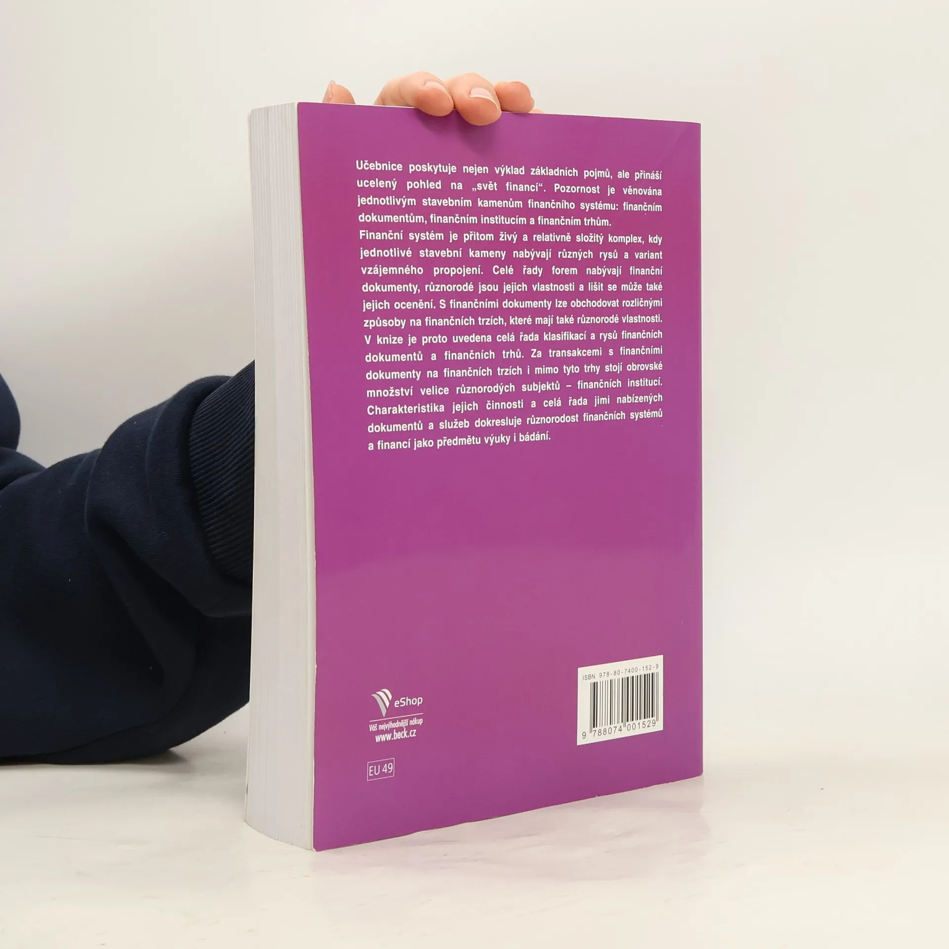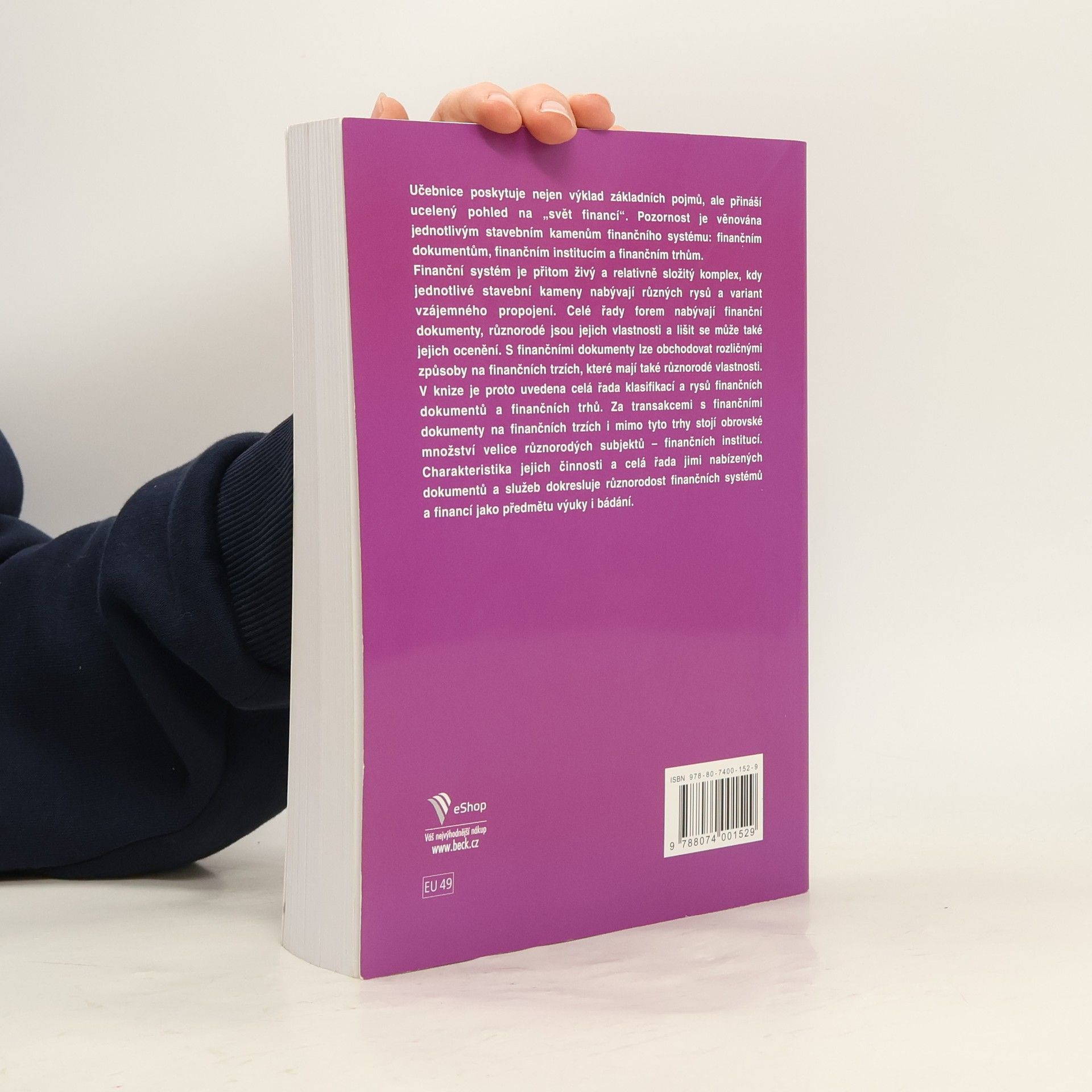 Učebnice poskytuje nejen výklad základních pojmů, ale přináší ucelený pohled na „svět financí“. Pozornost je věnována jednotlivým stavebním kamenům finančního systému: finančním dokumentům, finančním institucím a finančním trhům. Finanční systém je přitom živý a relativně složitý komplex, kdy jednotlivé stavební kameny nabývají různých rysů a variant vzájemného propojení. Celé řady forem nabývají finanční dokumenty, různorodé jsou jejich vlastnosti a lišit se může také jejich ocenění. S finančními dokumenty lze obchodovat rozličnými způsoby na finančních trzích, které mají také různorodé vlastnosti. V knize je proto uvedena celá řada klasifikací a rysů finančních dokumentů a finančních trhů. Za transakcemi s finančními dokumenty na finančních trzích i mimo tyto trhy stojí obrovské množství velice různorodých subjektů – finančních institucí. Charakteristika jejich činnosti a celá řada jimi nabízených dokumentů a služeb dokresluje různorodost finančních systémů a financí jako předmětu výuky i bádání.