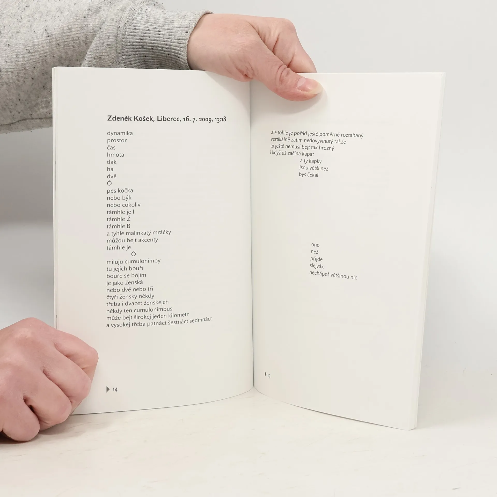 Experimentální poezie. Autor požádal téměř třicet osob, aby se podívali na oblohu a popsali své vjemy. Odpovědi zaznamenal a později přetvořil (střihem, členěním, krácením, domýšlením atd.) do podoby básní. Mezi oslovenými bylo několik básníků (např. Božena Správcová a Martin Langer). Autorova informace o knize a plný text ke stažení: http://www.pavelnovotny.net/texty/mraky/
