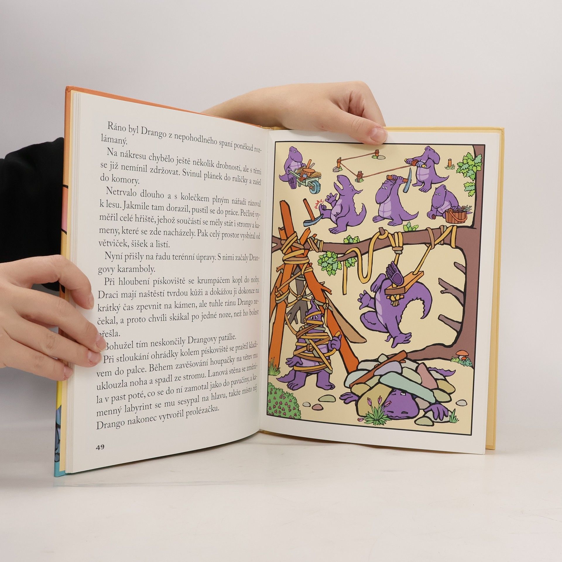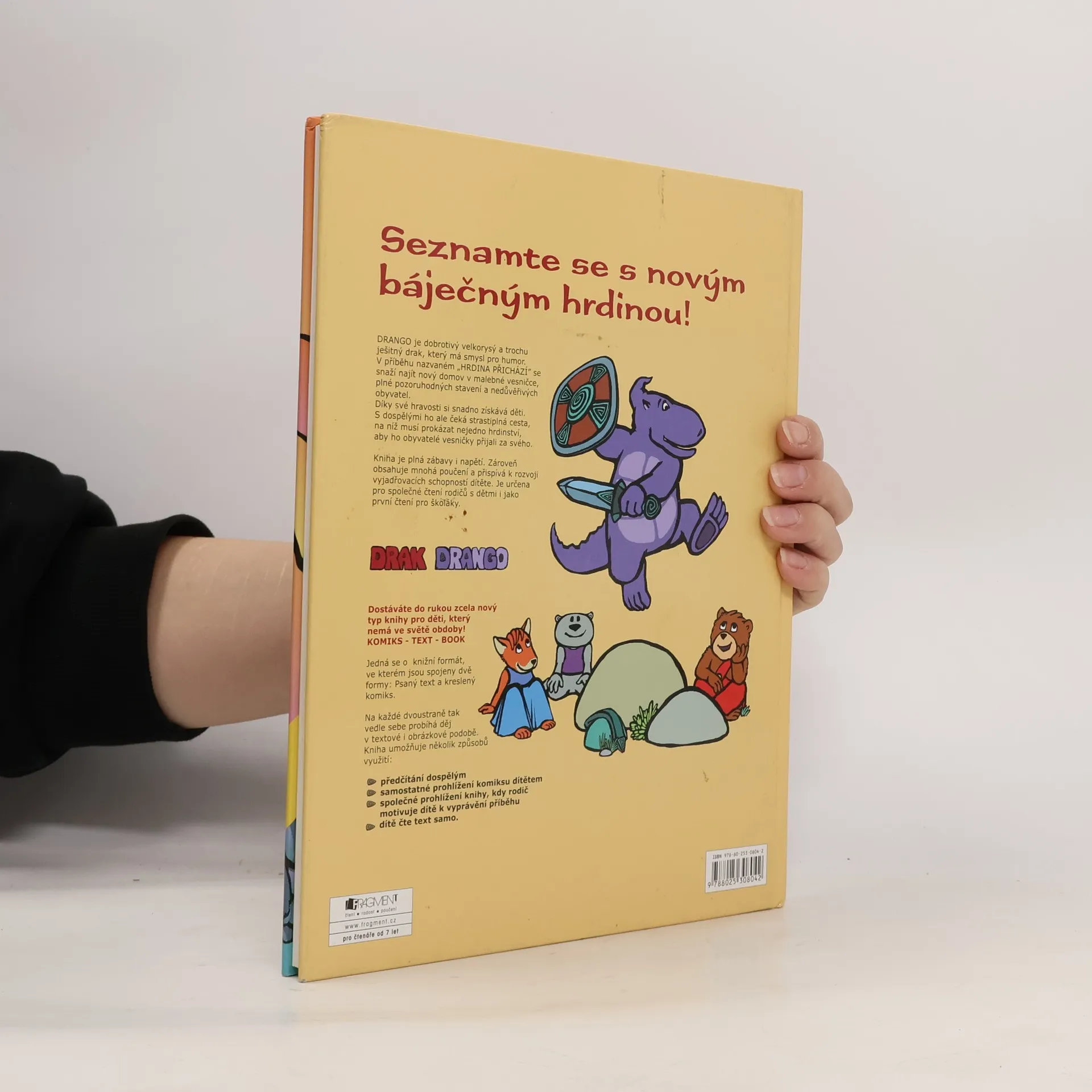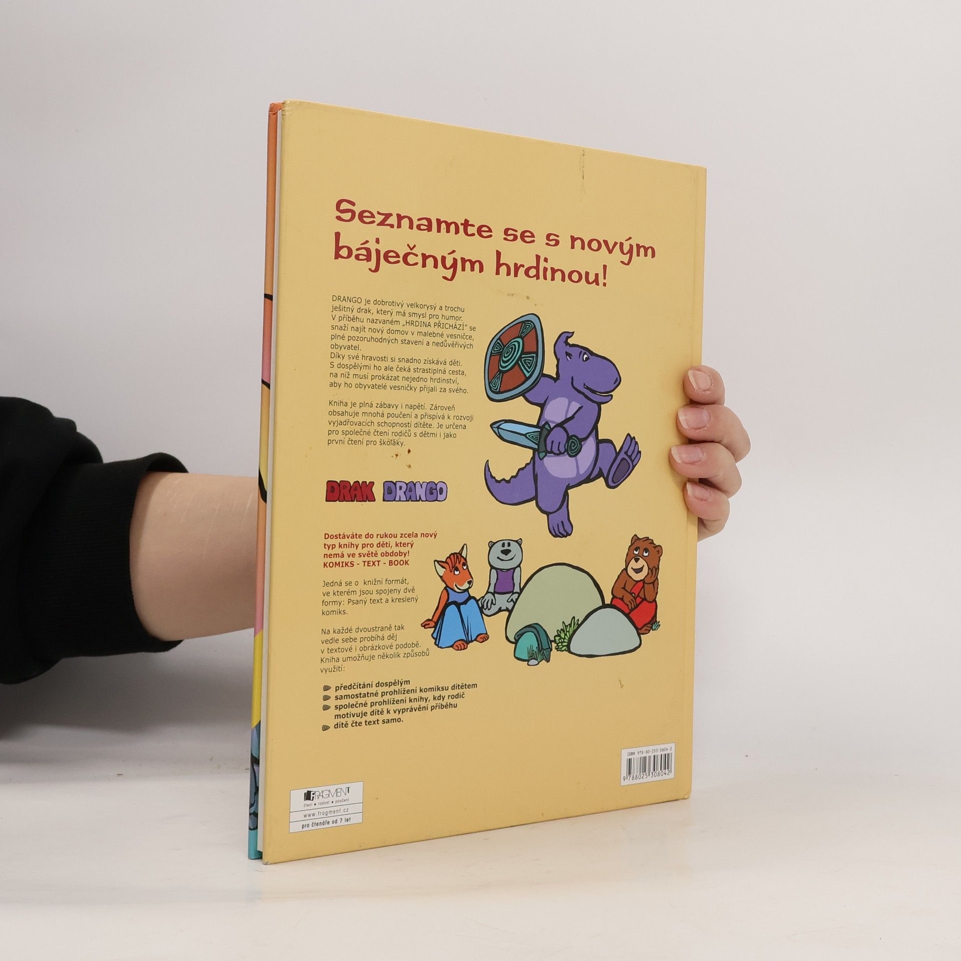 Drango je dobrotivý velkorysý a trochu ješitný drak, který má smysl pro humor. V příběhu nazvaném "Hrdina přichází" se snaží najít nový domov v malebné vesničce, plné pozoruhodných stavení a nedůvěřivých obyvatel. Díky své hravosti si snadno získává děti. S dospělými ho ale čeká strastiplná cesta, na níž musí prokázat nejedno hrdinství, aby ho obyvatelé vesničky přijali za svého. Dostáváte do rukou zcela nový typ knihy pro děti, který nemá ve světě obdoby! KOMIKS - TEXT - BOOK. Jedná se o knižní formát, ve kterém jsou spojeny dvě formy: Psaný text a kreslený komiks. Na každé dvoustraně tak vedle sebe probíhá děj v textové i obrázkové podobě.