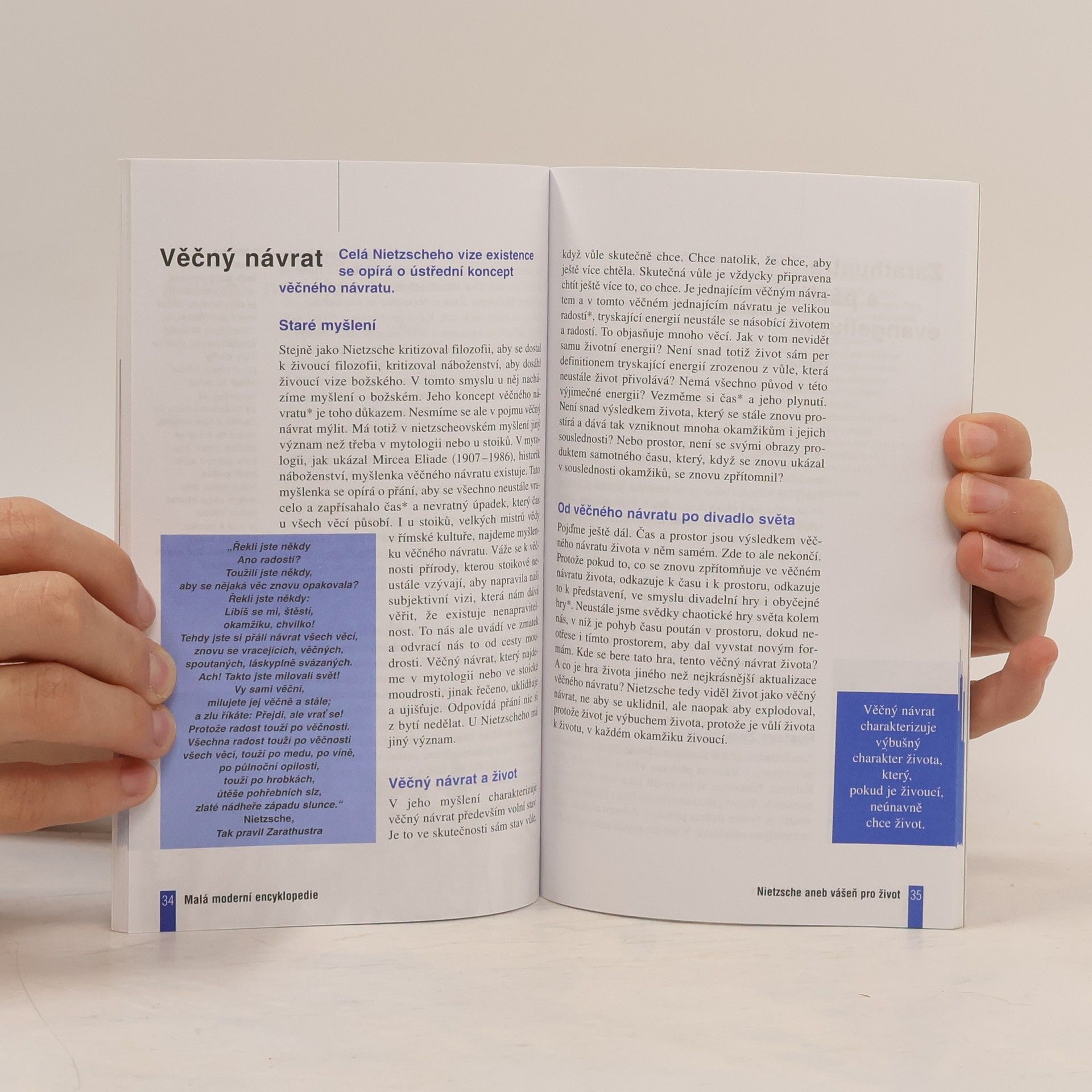 Nietzsche nebyl blázen, jak o něm lidé tvrdili. Byl naopak geniální. Tato kniha by chtěla ukázat v čem. Nastiňuje několik etap jeho myšlenkového vývoje: konstatování úpadku evropské kultury, kritiku filozofie, náboženství a morálky a konečně přitakání kultuře života. Nietzsche, který proletěl temným nebem devatenáctého století jako kometa, zvěstoval budoucnost filozofie návratem k pravdivým slovům.