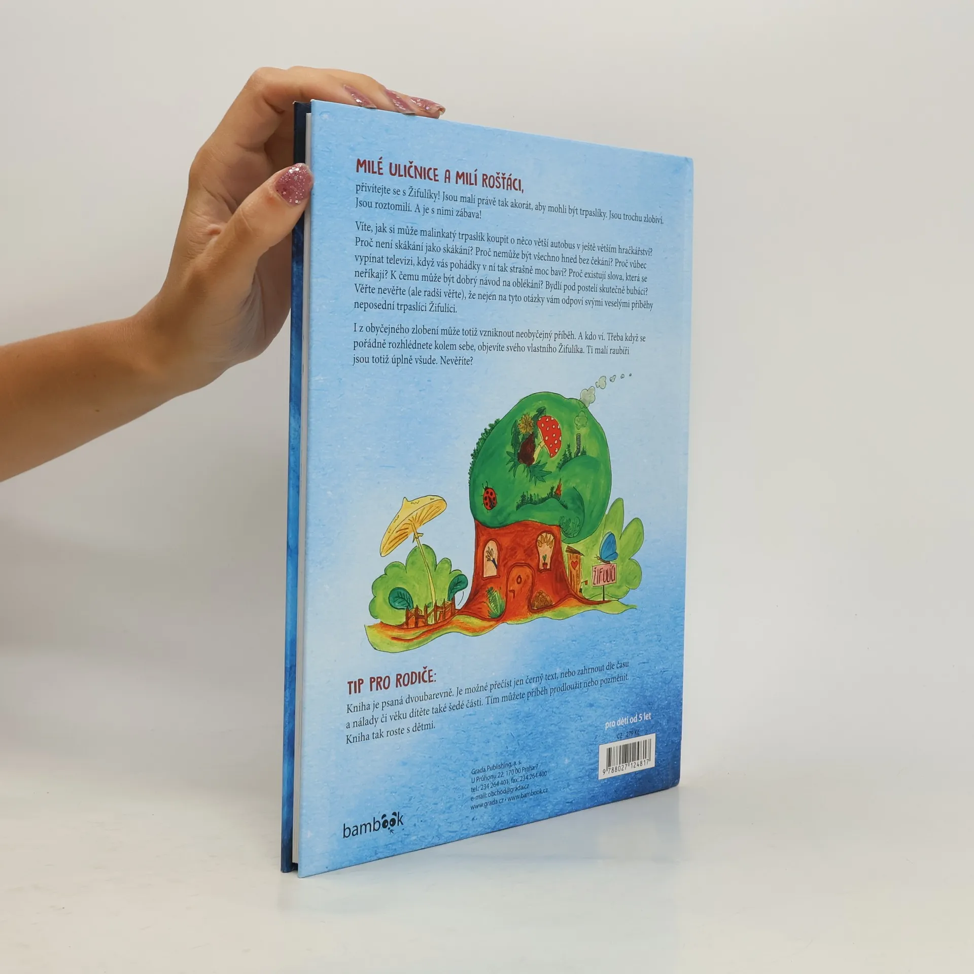 Milí rošťáci a milé uličnice, vážení rodičové, přivítejte se s Žifulíky! Jsou malí právě tak akorát, aby mohli býti trpaslíky. Jsou trochu zlobiví. Jsou roztomilí. A je s nimi zábava! Děti, víte, jak si může malinkatý trpaslík koupit o něco větší autobus v ještě větším hračkářství? Proč není skákání jako skákání? Proč nemůže být všechno hned bez čekání? Proč vůbec vypínat televizi, když nás pohádky v ní tak strašně moc baví? Proč existují slova, která se neříkají? K čemu může být dobrý návod na oblékání? Bydlí pod postelí skutečně bubáci? Věřte nevěřte (ale radši věřte), že nejen na tyto otázky vám odpoví svými veselými příběhy neposední trpaslíci Žifulíci. Tip pro rodiče: Kniha je psaná dvoubarevně. Je možné přečíst jen černý text, nebo zahrnout dle nálady či věku dítěte i šedé části, a tím příběh prodloužit či obměnit. Kniha tak roste s dětmi.