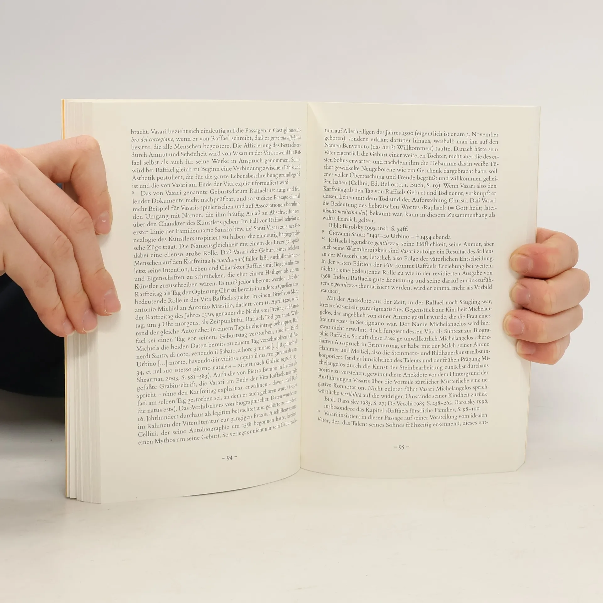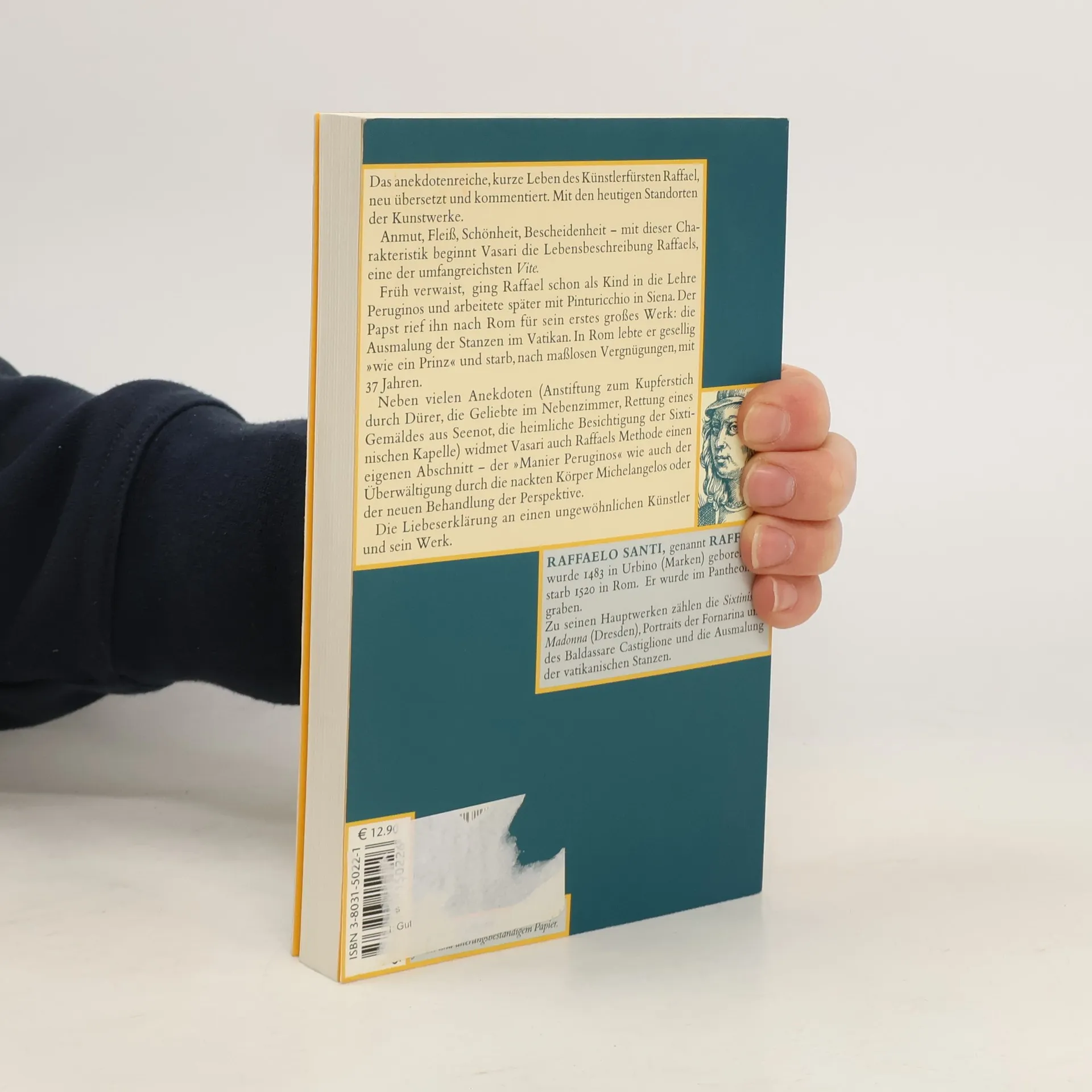 Anmut, Fleiß, Schönheit, Bescheidenheit – mit dieser Charakteristik beginnt Vasari die Lebensbeschreibung Raffaels, eine der umfangreichsten Viten. Geboren in Urbino, früh verwaist, ging Raffael schon als Kind in die Lehre Peruginos, arbeitete später mit Pinturicchio in Siena, ließ dort alles stehen und liegen, um zwei Kartons von Michelangelo und Leonardo zu studieren. Der Papst rief ihn nach Rom für sein erstes großes Werk: die Ausmalung der Stanzen im Vatikan. In Rom lebte er gesellig wie ein Fürst und starb, nach maßlosen Vergnügungen, mit 37 Jahren. Neben vielen Anekdoten (Rettung eines Gemäldes aus Seenot, die heimliche Besichtigung der Sixtinischen Kapelle) widmet Vasari auch Raffaels Methode einen eigenen Abschnitt – der »Manier Peruginos« wie auch der Überwältigung durch die nackten Körper Michelangelos oder der neuen Behandlung der Perspektive. Die Liebeserklärung an einen ungewöhnlichen Künstler und sein Werk.