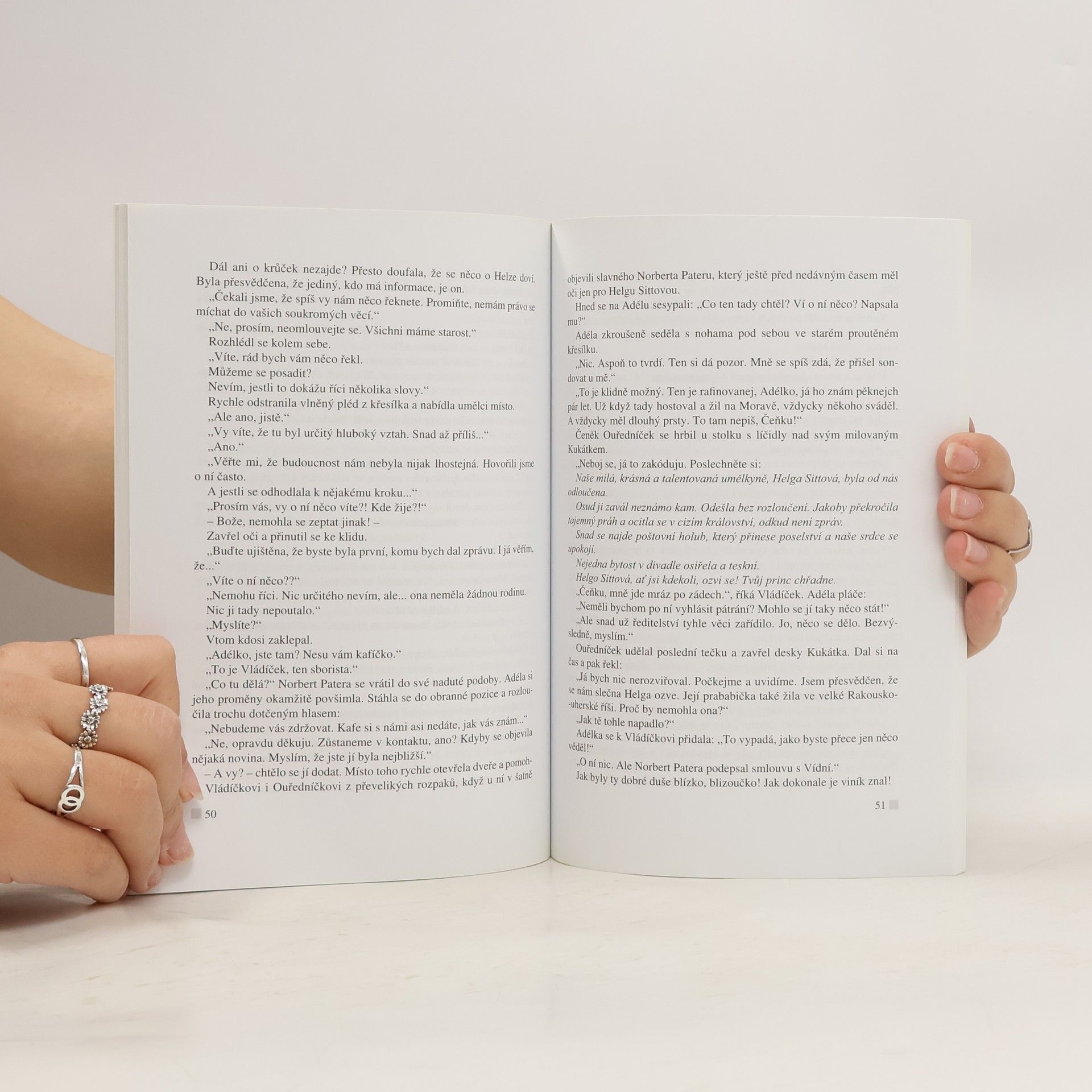 Detektivní román, odehrávající se v normalizačních časech v prostorách Národního divadla, vypráví příběh tragické lásky mezi operním pěvcem a baletkou. Primabalerína Helga, nový člen uměleckého souboru ND, rozvířila vody jinak ustáleného kolektivu. Nejedno mužské oko spočine na jejím dokonalém těle. Helgu však ukořistí místní donchuán Norbert Patera. Jenže jednoho dne Helga zmizí. Emigrovala? Utekla s neznámým mužem?