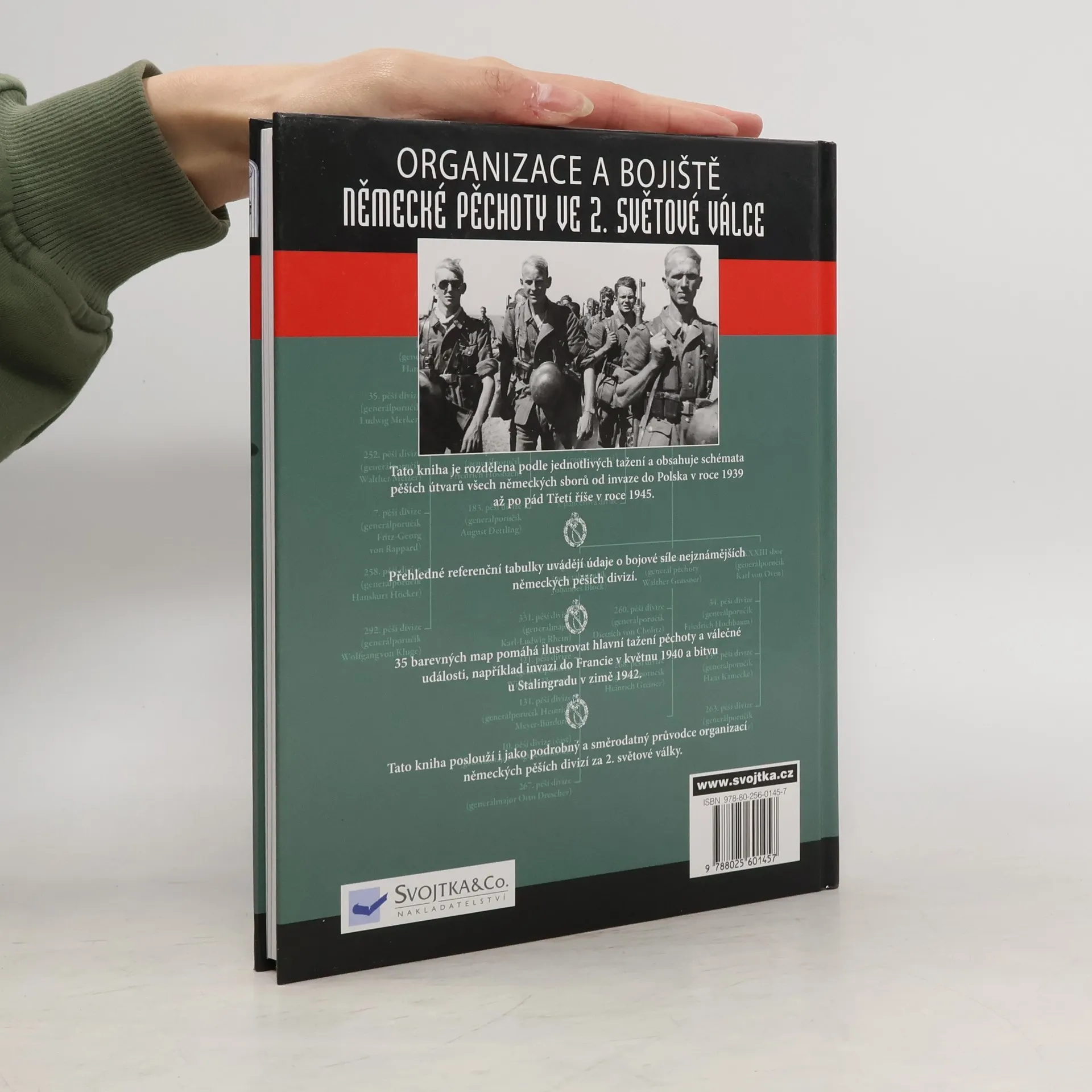 Kniha Organizace a bojiště německé pěchoty ve 2. světové válce je rozdělena podle jednotlivých tažení a obsahuje schémata pěších útvarů všech německých sborů od invaze do Polska v roce 1939 až po pád tzv. třetí říše v roce 1945. Najdete v ní přehledné referenční tabulky s údaji o bojové síle nejznámějších německých pěších divizí a 35 barevných map, které pomáhají ilustrovat hlavní tažení pěchoty a válečné události, například invazi do Francie v květnu 1940 a bitvu u Stalingradu v zimě 1942. Tato publikace poslouží i jako podrobný a směrodatný průvodce organizací německých pěších divizí za 2. světové války.