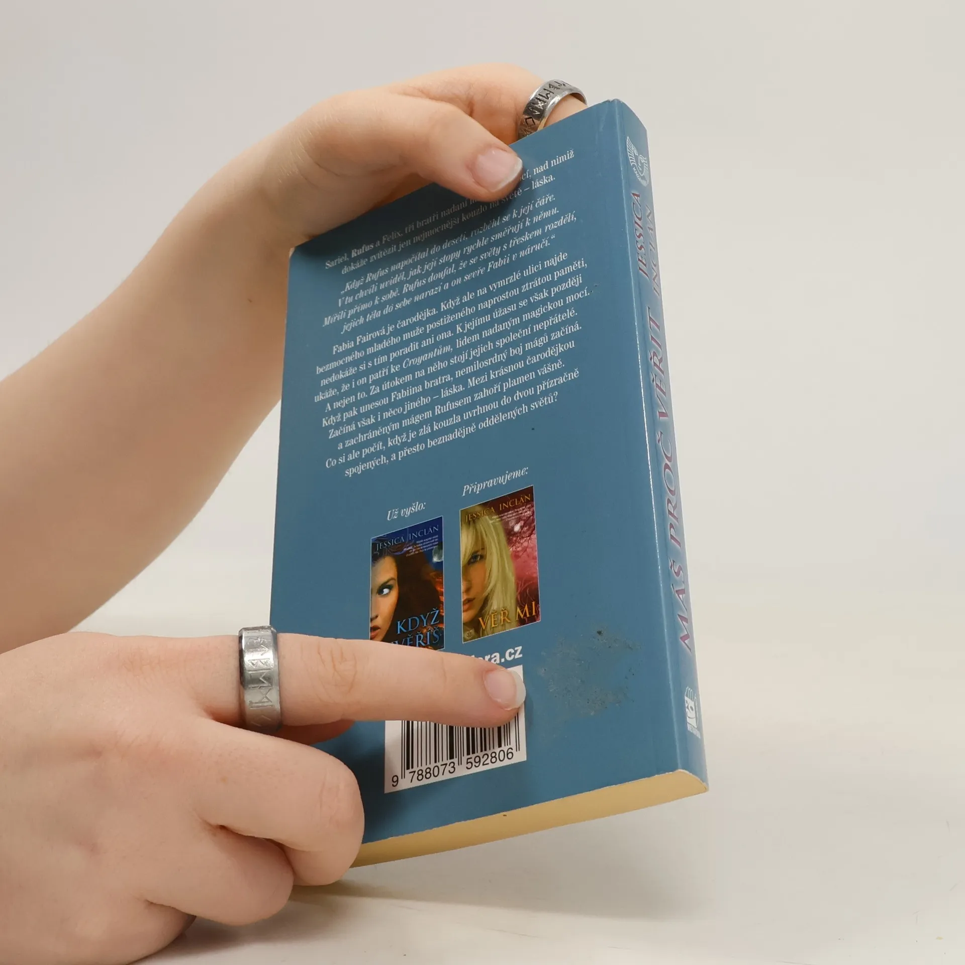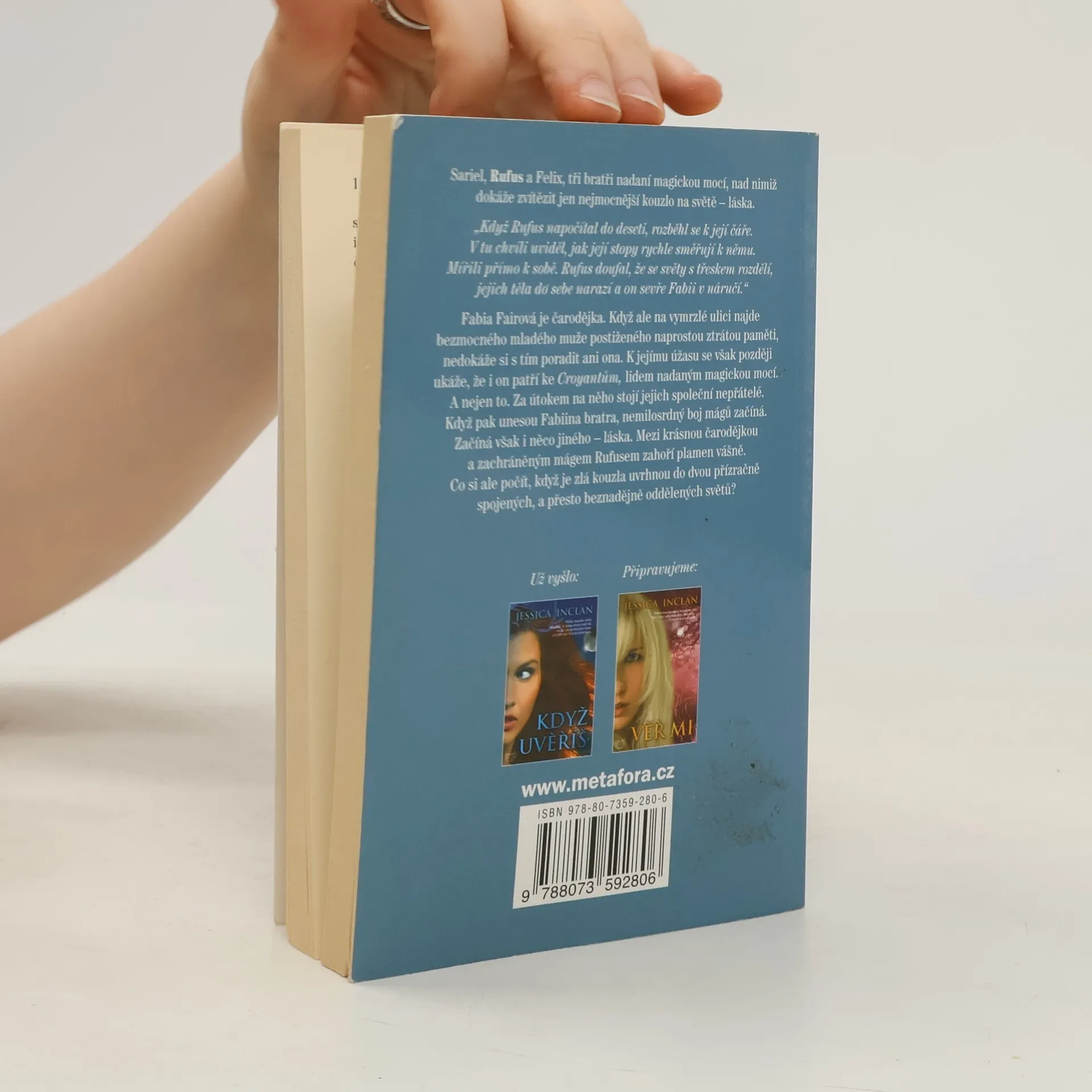 Croyants des Trois, tajemní ochráni, podruhé v boji za dobro a lásku. To nejlepší z Harryho Pottera, ale pro dospělé… Sariel, Rufus a Felix, tři bratři nadaní magickou mocí, nad nimiž dokáže zvítězit jen nejmocnější kouzlo na světě – láska. Fabia Fairová je čarodějka. Když ale na vymrzlé ulici najde bezmocného mladého muže postiženého naprostou ztrátou paměti, nedokáže si s tím poradit ani ona. K jejímu úžasu se však později ukáže, že i on patří ke Croyantům, lidem nadaným magickou mocí. A nejen to. Za útokem na něho stojí jejich společní nepřátelé. Když pak unesou Fabiina bratra, nemilosrdný boj mágů začíná. Začíná však i něco jiného – láska. Mezi krásnou čarodějkou a zachráněným mágem Rufusem zahoří plamen vášně. Co si ale počít, když je zlá kouzla uvrhnou do dvou přízračně spojených, a přesto beznadějně oddělených světů?
