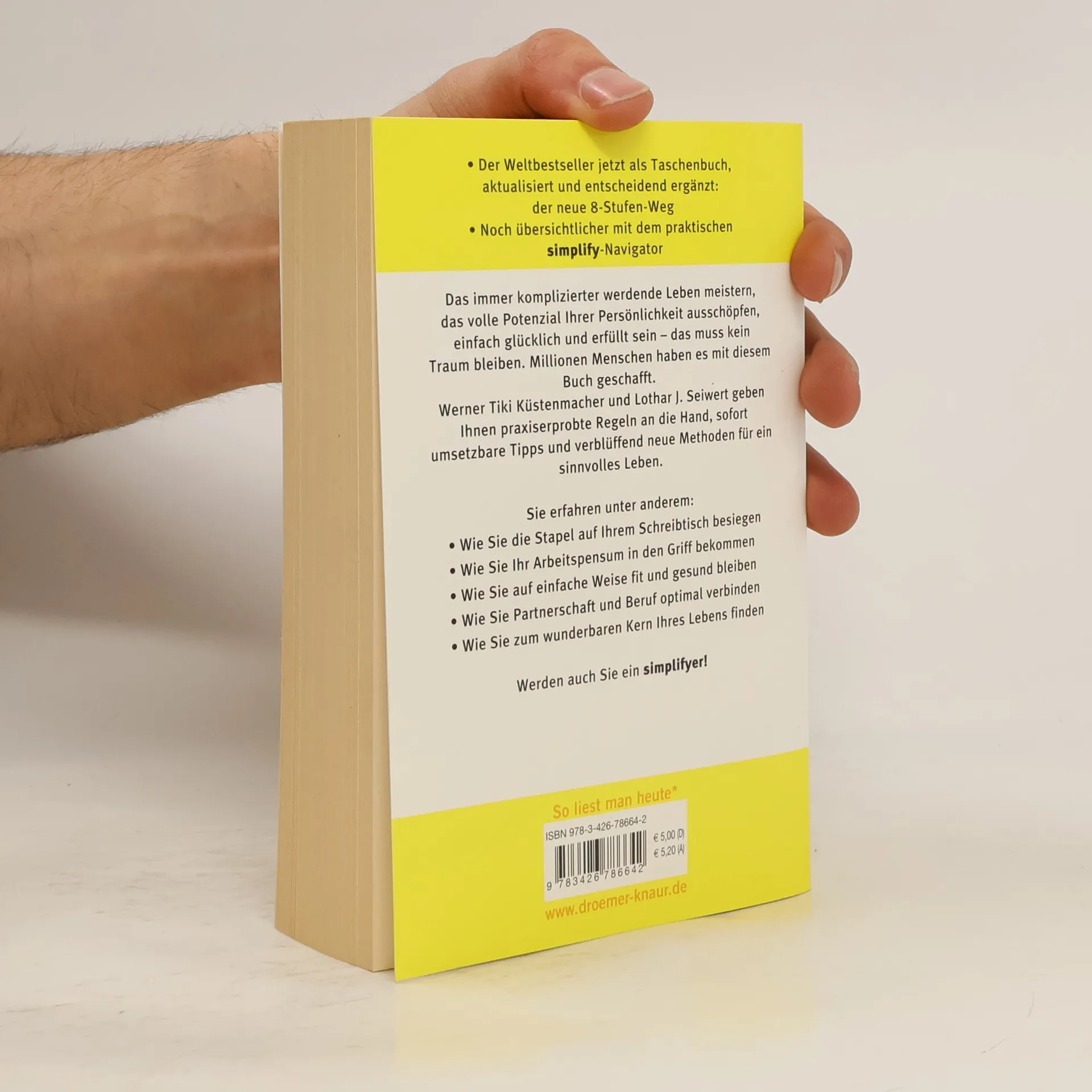 »Der Weltbestseller jetzt als Taschenbuch, aktualisiert und entscheidend ergänzt: der neue 8-Stufen-Weg« »Noch übersichtlicher mit dem praktischen simplify-Navigator« Das immer komplizierter werdende Leben meistern, das volle Potenzial Ihrer Persönlichkeit ausschöpfen, einfach glücklich und erfüllt sein – das muss kein Traum bleiben. Millionen Menschen haben es mit diesem Buch geschafft. Werner Tiki Küstenmacher und Lothar J. Seiwert geben Ihnen praxiserprobte Regeln an die Hand, sofort umsetzbare Tipps und verblüffend neue Methoden für ein sinnvolles Leben. Sie erfahren unter anderem: Wie Sie die Stapel auf Ihrem Schreibtisch besiegen Wie Sie Ihr Arbeitspensum in den Griff bekommen Wie Sie auf einfache Weise fit und gesund bleiben Wie Sie Partnerschaft und Beruf optimal verbinden Wie Sie zum wunderbaren Kern Ihres Lebens finden Werden auch Sie ein simplifyer!