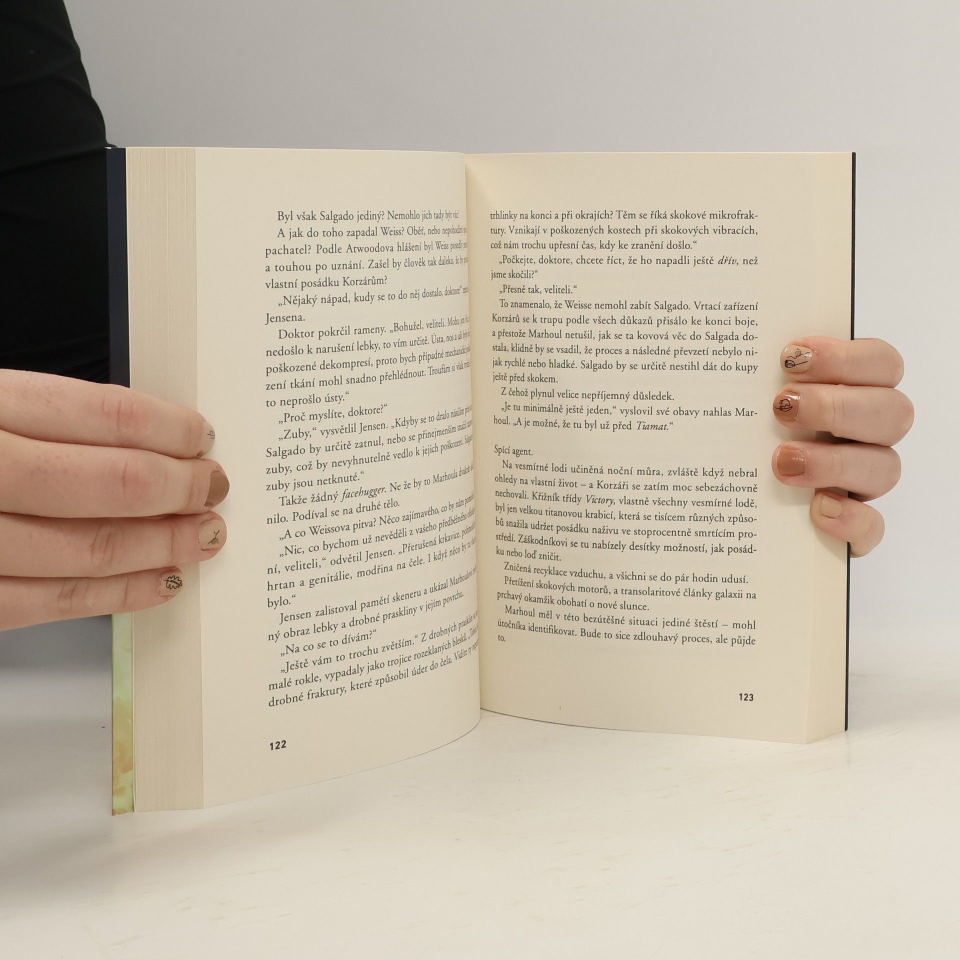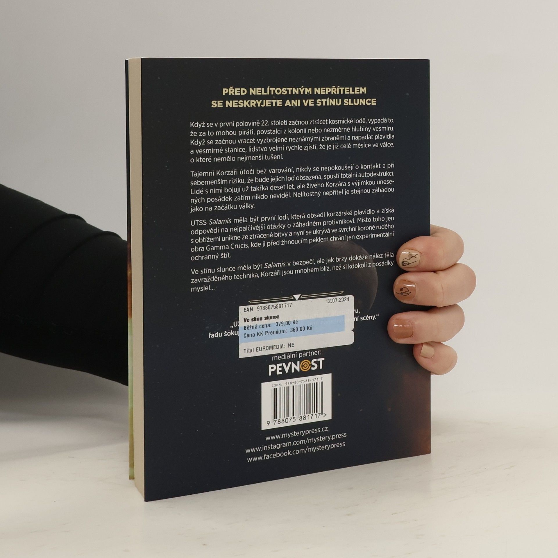 PŘED NELÍTOSTNÝM NEPŘÍTELEM SE NESKRYJETE ANI VE STÍNU SLUNCE Když se v první polovině 22. století začnou ztrácet kosmické lodě, vypadá to, že za to mohou piráti, povstalci z kolonií nebo nezměrné hlubiny vesmíru. Když se začnou vracet vyzbrojené neznámými zbraněmi a napadat plavidla a vesmírné stanice, lidstvo velmi rychle zjistí, že je již celé měsíce ve válce, o které nemělo nejmenší tušení. Tajemní Korzáři útočí bez varování, nikdy se nepokoušejí o kontakt a při sebemenším riziku, že bude jejich loď obsazena, spustí totální autodestrukci. Lidé s nimi bojují už takřka deset let, ale živého Korzára s výjimkou unesených posádek zatím nikdo neviděl. Nelítostný nepřítel je stejnou záhadou jako na začátku války. UTSS Salamis měla být první lodí, která obsadí korzárské plavidlo a získá odpovědi na nejpalčivější otázky o záhadném protivníkovi. Místo toho jen s obtížemi unikne ze ztracené bitvy a nyní se ukrývá ve svrchní koroně rudého obra Gamma Crucis, kde ji před žhnoucím peklem chrání jen experimentální ochranný štít. Ve stínu slunce měla být Salamis v bezpečí, ale jak brzy dokáže nález těla zavražděného technika, Korzáři jsou mnohem blíž, než si kdokoli z posádky myslel… _________________ „Užijete si mrazivou a zneklidňující atmosféru, řadu šokujících zvratů a také bravurně napsané akční scény.“ – PEVNOST